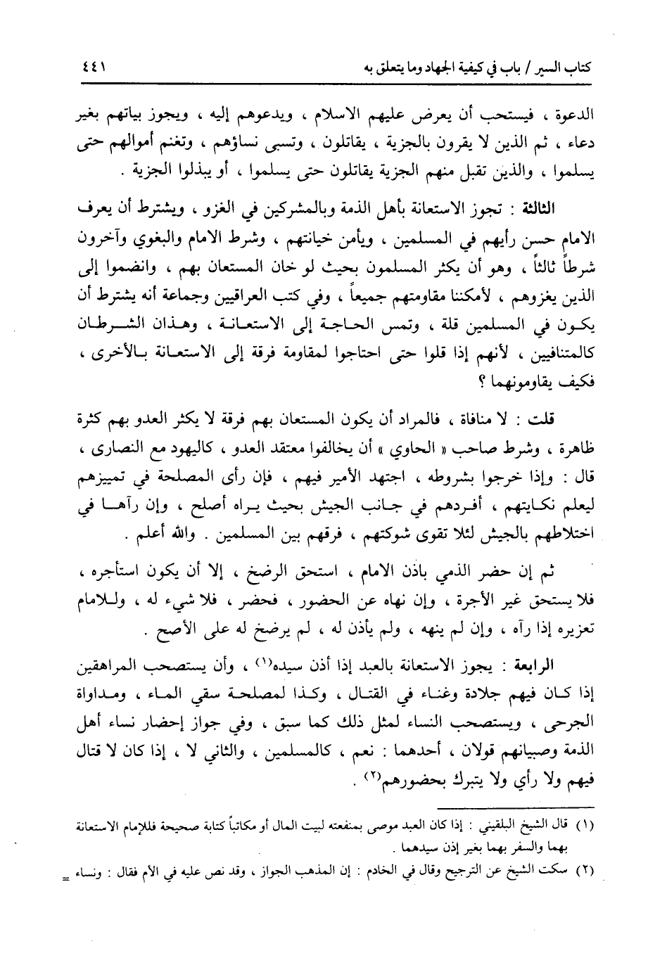الدعوة، فيستحب أن يعرض عليهم الاسلام، ويدعوهم إليه، ويجوز بياتهم بغير دعاء، ثم الذين لا يقرون بالجزية، يقاتلون، وتسبى نساؤهم، وتغنم أموالهم حتى يسلموا، والذين تقبل منهم الجزية يقاتلون حتى يسلموا، أو يبذلوا الجزية. الثالثة: تجوز الاستعانة بأهل الذمة وبالمشركين في الغزو، ويشترط أن يعرف الامام حسن رأيهم في المسلمين، ويأمن خيانتهم، وشرط الامام والبغوي وآخرون شرطا ثالثا، وهو أن يكثر المسلمون بحيث لو خان المستعان بهم، وانضموا إلى الذين يغزوهم، لامكننا مقاومتهم جميعا، وفي كتب العراقيين وجماعة أنه يشترط أن يكون في المسلمين قلة، وتمس الحاجة إلى الاستعانة، وهذان الشرطان كالمتنافيين، لانهم إذا قلوا حتى احتاجوا لمقاومة فرقة إلى الاستعانة بالاخرى، فكيف يقاومونهما ؟ قلت: لا منافاة، فالمراد أن يكون المستعان بهم فرقة لا يكثر العدو بهم كثرة ظاهرة، وشرط صاحب الحاوي أن يخالفوا معتقد العدو، كاليهود مع النصارى، قال: وإذا خرجوا بشروطه، اجتهد الامير فيهم، فإن رأى المصلحة في تميزهم ليعلم نكايتهم، أفردهم في جانب الجيش بحيث يراه أصلح، وإن رآها في اختلاطهم بالجيش لئلا تقوى شوكتهم، فرقهم بين المسلمين. والله أعلم. ثم إن حضر الذمي بإذن الامام، استحق الرضخ، إلا أن يكون استأجره، فلا يستحق غير الاجرة، وإن نهاه عن الحضور، فحضر، فلا شئ له، وللامام تعزيزه إذا رآه، وإن لم ينهه، ولم يأذن له، لم يرضخ له على الاصح. الرابعة: يجوز الاستعانة بالعبد إذا أذن سيده، وأن يستصحب المراهقين إذا كان فيهم جلادة وغناء في القتال، وكذا لمصلحة سقي الماء، ومداواة الجرحى، ويستصحب النساء لمثل ذلك كما سبق، وفي جواز إحضار نساء أهل الذمة وصبيانهم قولان، أحدهما: نعم، كالمسلمين، والثاني: لا، إذا كان لا قتال فيهم ولا رأي ولا يتبرك بحضورهم.