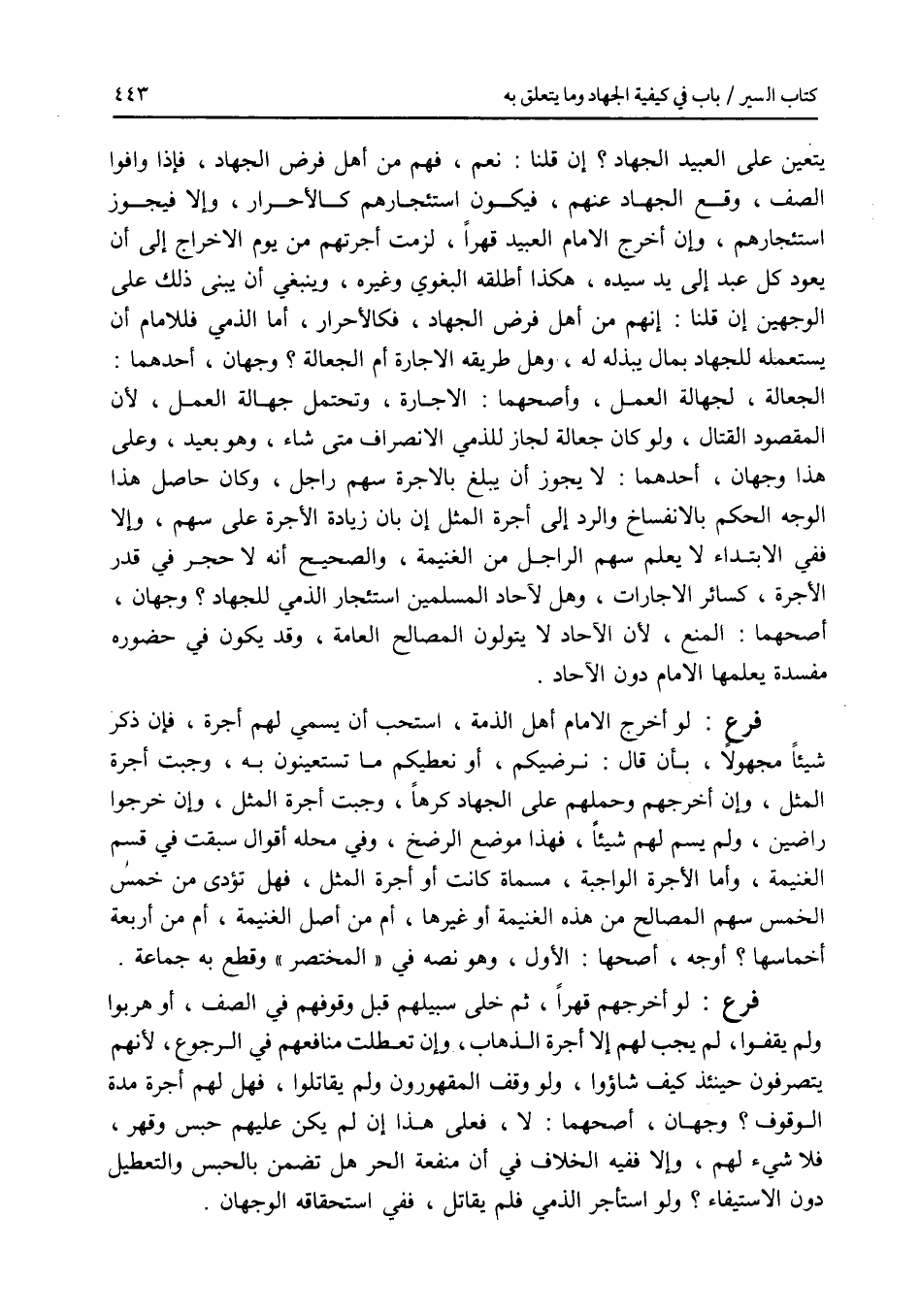 يتعين على العبيد الجهاد ؟ إن قلنا: نعم، فهم من أهل فرض الجهاد، فإذا وافوا الصف، وقع الجهاد عنهم، فيكون استئجارهم كالاحرار، وإلا فيجوز استئجارهم، وإن أخرج الامام العبيد قهرا، لزمت أجرتهم من يوم الاخراج إلى أن يعود كل عبد إلى يد سيده، هكذا أطلقه البغوي وغيره، وينبغي أن يبنى ذلك على الوجهين إن قلنا: إنهم من أهل فرض الجهاد، فكالاحرار، أما الذمي فللامام أن يستعمله للجهاد بمال يبذله له، وهل طريقه الاجارة أم الجعالة ؟ وجهان، أحدهما: الجعالة، لجهالة العمل، وأصحهما: الاجارة، وتحتمل جهالة العمل، لان ا لمقصود القتال، ولو كان جعالة لجاز للذمي الانصراف متى شاء، وهو بعيد، وعلى هذا وجهان، أحدهما: لا يجوز أن يبلغ بالاجرة سهم راجل، وكان حاصل هذا الوجه الحكم بالانفساخ والرد إلى أجرة المثل إن بان زيادة الاجرة على سهم، وإلا ففي الابتداء لا يعلم سهم الراجل من الغنيمة، والصحيح أنه لا حجر في قدر الاجرة، كسائر الاجارات، وهل لآحاد المسلمين استئجار الذمي للجهاد ؟ وجهان، أصحهما: المنع، لان الآحاد لا يتولون المصالح العامة، وقد يكون في حضوره مفسدة يعلمها الامام دون الآحاد. فرع لو أخرج الامام أهل الذمة، استحب أن يسمي لهم أجرة، فإن ذكر شيئا مجهولا، بأن قال: نرضيكم، أو نعطيكم ما تستعينون به، وجبت أجرة المثل، وإن أخرجهم وحملهم على الجهاد كرها، وجبت أجرة المثل، وإن خرجوا راضين، ولم يسم لهم شيئا، فهذا موضع الرضخ، وفي محله أقوال سبقت في قسم الغنيمة، وأما الاجرة الواجبة، مسماة كانت أو أجرة المثل، فهل تؤدى من خمس الخمس سهم المصالح من هذه الغنيمة أو غيرها، أم من أصل الغنيمة، أم من أربعة أخماسها ؟ أوجه، أصحها: الاول، وهو نصه في المختصر وقطع به جماعة. فرع لو أخرجهم قهرا، ثم خلى سبيلهم قبل وقوفهم في الصف، أو هربوا ولم يقفوا، لم يجب لهم إلا أجرة الذهاب، وإن تعطلت منافعهم في الرجوع، لانهم يتصرفون حينئذ كيف شاؤوا، ولو وقف المقهورون ولم يقاتلوا، فهل لهم أجرة مدة الوقوف ؟ وجهان، أصحهما: لا، فعلى هذا إن لم يكن عليهم حبس وقهر، فلا شئ لهم، وإلا ففيه الخلاف في أن منفعة الحر هل تضمن بالحبس والتعطيل دون الاستيفاء ؟ ولو استأجر الذمي فلم يقاتل، ففي استحقاقه الوجهان.