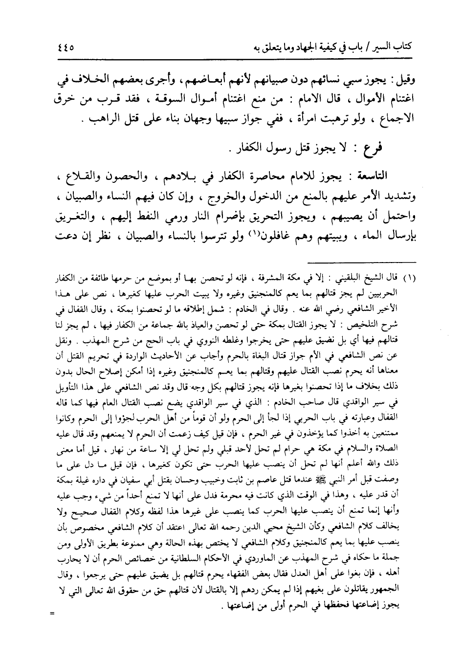 وقيل: يجوز سبي نسائهم دون صبيانهم، لانهم أبعاضهم، وأجرى بعضهم الخلاف في اغتنام الاموال، قال الامام: من منع اغتنام أموال السوقة، فقد قرب من خرق الاجماع، ولو ترهبت امرأة، ففي جواز سبيها وجهان بناء على قتل الراهب. فرع لا يجوز قتل رسول الكفار. التاسعة: يجوز للامام محاصرة الكفار في بلادهم، والحصون والقلاع، وتشديد الامر عليهم بالمنع من الدخول والخروج، وإن كان فيهم النساء والصبيان، واحتمل أن يصيبهم، ويجوز التحريق بإضرام النار ورمي النفط إليهم، والتغريق بإرسال الماء، ويبيتهم وهم غافلون، ولو تترسوا بالنساء والصبيان، نظر إن دعت