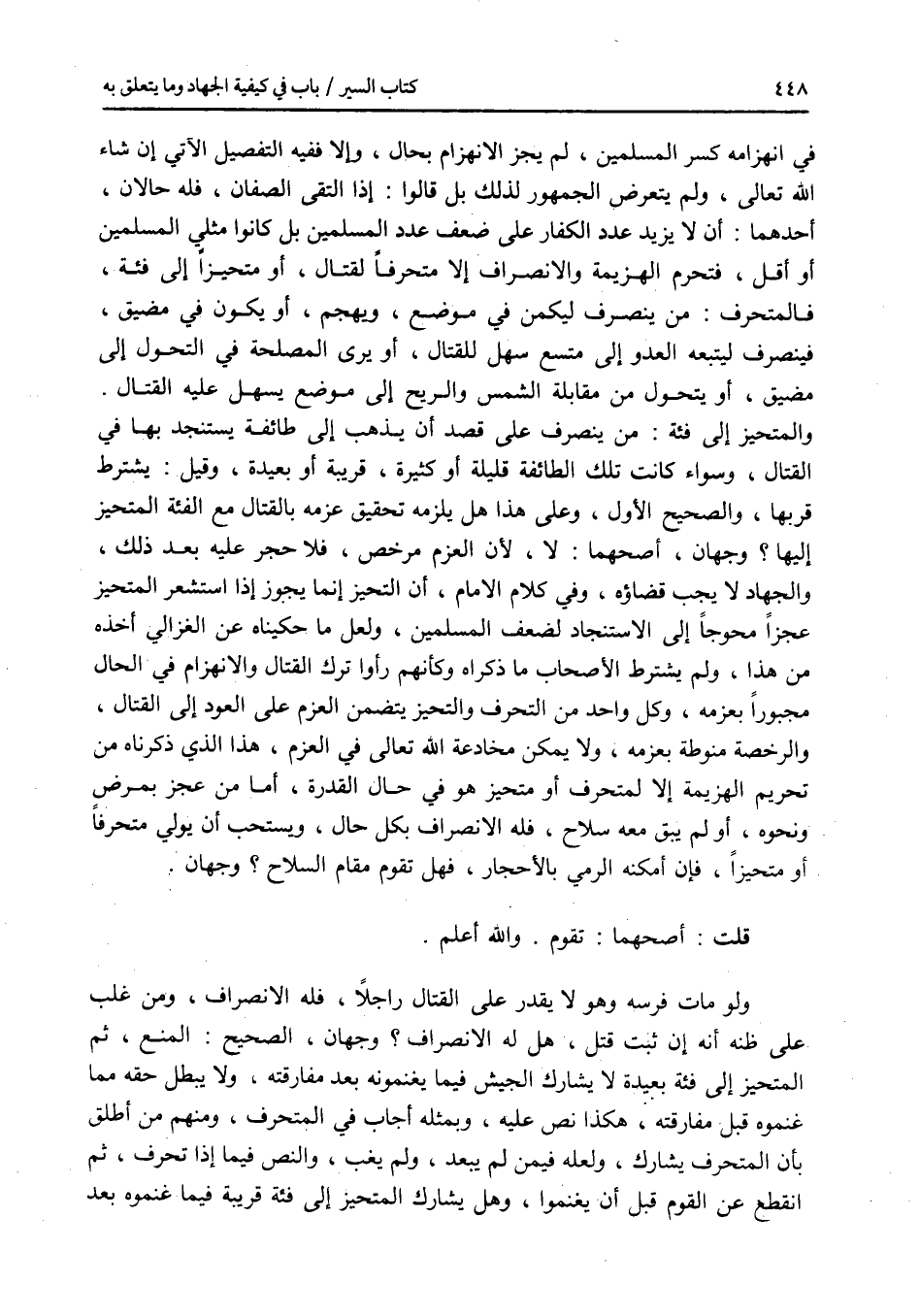 في انهزامه كسر المسلمين، لم يجز الانهزام بحال، وإلا ففيه التفصيل الآتي إن شاء الله تعالى، ولم يتعرض الجمهور لذلك بل قالوا: إذا التقى الصفان، فله حالان، أحدهما: أن لا يزيد عدد الكفار على ضعف عدد المسلمين بل كانوا مثلي المسلمين أو أقل، فتحرم الهزيمة والانصراف إلا متحرفا لقتال، أو متحيزا إلى فئة، فالمتحرف: من ينصرف ليكمن في موضع، ويهجم، أو يكون في مضيق، فينصرف ليتبعه العدو إلى متسع سهل للقتال، أو يرى المصلحة في التحول إلى مضيق، أو يتحول من مقابلة الشمس والريح إلى موضع يسهل عليه القتال. والمتحيز إلى فئة: من ينصرف على قصد أن يذهب إلى طائفة يستنجد بها في القتال، وسواء كانت تلك الطائفة قليلة أو كثيرة، قريبة أو بعيدة، وقيل: يشترط قربها، والصحيح الاول، وعلى هذا هل يلزمه تحقيق عزمه بالقتال مع الفئة المتحيز إليها ؟ وجهان، أصحهما: لا، لان العزم مرخص، فلا حجر عليه بعد ذلك، والجهاد لا يجب قضاؤه، وفي كلام الامام، أن التحيز إنما يجوز إذا استشعر المتحيز عجزا محوجا إلى الاستنجاد لضعف المسلمين، ولعل ما حكيناه عن الغزالي أخذه من هذا، ولم يشترط الاصحاب ما ذكراه وكأنهم رأوا ترك القتال والانهزام في الحال مجبورا بعزمه، وكل واحد من التحرف والتحيز يتضمن العزم على العود إلى القتال، والرخصة منوطة بعزمه، ولا يمكن مخادعة الله تعالى في العزم، هذا الذي ذكرناه من تحريم الهزيمة إلا لمتحرف أو متحيز هو في حال القدرة، أما من عجز بمرض ونحوه، أو لم يبق معه سلاح، فله الانصراف بكل حال، ويستحب أن يولي متحرفا أو متحيزا، فإن أمكنه الرمي بالاحجار، فهل تقوم مقام السلاح ؟ وجهان. قلت: أصحهما: تقوم. والله أعلم. ولو مات فرسه وهو لا يقدر على القتال راجلا، فله الانصراف، ومن غلب على ظنه أنه إن ثبت قتل، هل له الانصراف ؟ وجهان، الصحيح: المنع، ثم المتحيز إلى فئة بعيدة لا يشارك الجيش فيما يغنمونه بعد مفارقته، ولا يبطل حقه مما غنموه قبل مفارقته، هكذا نص عليه، وبمثله أجاب في المتحرف، ومنهم من أطلق بأن المتحرف يشارك، ولعله فيمن لم يبعد، ولم يغب، والنص فيما إذا تحرف، ثم انقطع عن القوم قبل أن يغنموا، وهل يشارك المتحيز إلى فئة قريبة فيما غنموه بعد