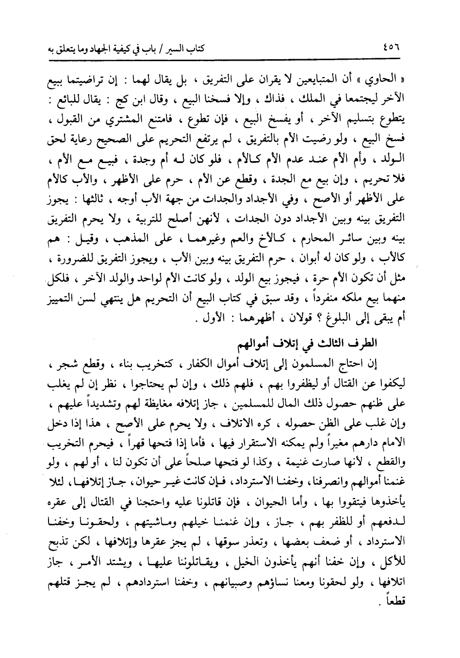 الطرف الثالث : في إتلاف أموالهم إن احتاج المسلمون إلى إتلاف أموال الكفار، كتخريب بناء، وقطع شجر، ليكفوا عن القتال أو ليظفروا بهم، فلهم ذلك، وإن لم يحتاجوا، نظر إن لم يغلب على ظنهم حصول ذلك المال للمسلمين، جاز إتلافه مغايظة لهم وتشديدا عليهم، وإن غلب على الظن حصوله، كره الاتلاف، ولا يحرم على الاصح، هذا إذا دخل الامام دارهم مغيرا ولم يمكنه الاستقرار فيها، فأما إذا فتحها قهرا، فيحرم التخريب والقطع، لانها صارت غنيمة، وكذا لو فتحها صلحا على أن تكون لنا، أو لهم، ولو غنما أموالهم وانصرفنا، وخفنا الاسترداد، فإن كانت غير حيوان، جاز إتلافها، لئلا يأخذوها فيتقووا بها، وأما الحيوان، فإن قاتلونا عليه واحتجنا في القتال إلى عقره لدفعهم أو للظفر بهم، جاز، وإن غنمنا خيلهم وماشيتهم، ولحقونا وخفنا الاسترداد، أو ضعف بعضها، وتعذر سوقها، لم يجز عقرها وإتلافها، لكن تذبح للاكل، وإن خفنا أنهم يأخذون الخيل، ويقاتلوننا عليها، ويشتد الامر، جاز إتلافها، ولو لحقونا ومعنا نساؤهم وصبيانهم، وخفنا استردادهم، لم يجز قتلهم قطعا.