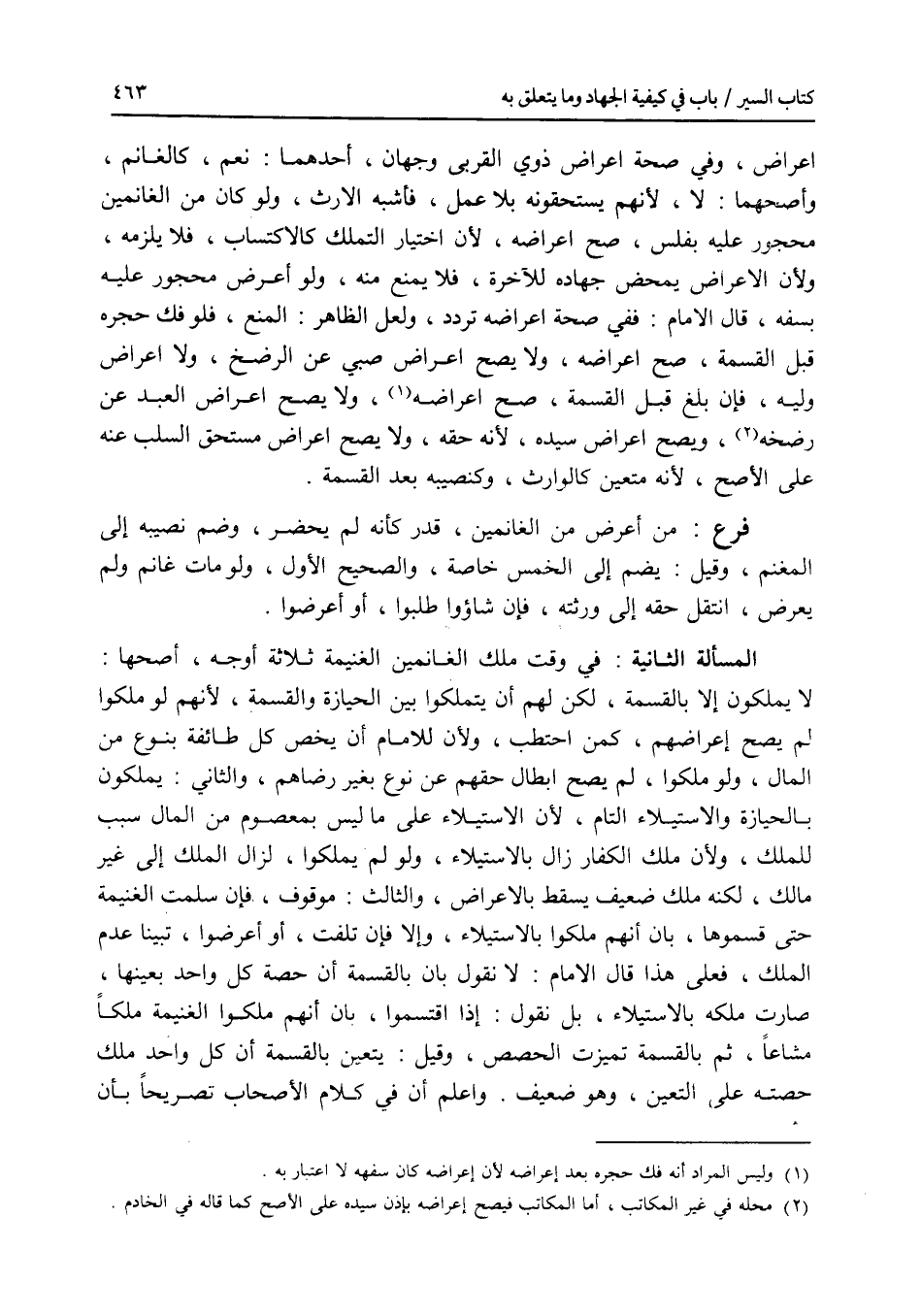 إعراض، وفي صحة إعراض ذوي القربى وجهان، أحدهما: نعم، كالغانم، وأصحهما: لا، لانهم يستحقونه بلا عمل، فأشبه الارث، ولو كان من الغانمين محجور عليه بفلس، صح إعراضه، لان اختيار التملك كالاكتساب، فلا يلزمه، ولان الاعراض يمحض جهاده للآخرة، فلا يمنع منه، ولو أعرض محجور عليه بسفه، قال الامام: ففي صحة إعراضه تردد، ولعل الظاهر: المنع، فلو فك حجره قبل القسمة، صح إعراضه، ولا يصح إعراض صبي عن الرضخ، ولا إعراض وليه، فإن بلغ قبل القسمة، صح إعراضه، ولا يصح إعراض العبد عن رضخه، ويصح إعراض سيده، لانه حقه، ولا يصح إعراض مستحق السلب عنه على الاصح، لانه متعين كالوارث، وكنصيبه بعد القسمة. فرع من أعرض من الغانمين، قدر كأنه لم يحضر، وضم نصيبه إلى المغنم، وقيل: يضم إلى الخمس خاصة، والصحيح الاول، ولو مات غانم ولم يعرض، انتقل حقه إلى ورثته، فإن شاؤوا طلبوا، أو أعرضوا. المسألة الثانية: في وقت ملك الغانمين الغنيمة ثلاثة أوجه، أصحها: لا يملكون إلا بالقسمة، لكن لهم أن يتملكوا بين الحيازة والقسمة، لانهم لو ملكوا لم يصح إعراضهم، كمن احتطب، ولان للامام أن يخص كل طائفة بنوع من المال، ولو ملكوا، لم يصح إبطال حقهم عن نوع بغير رضاهم، والثاني: يملكون بالحيازة والاستيلاد التام، لان الاستيلاد على ما ليس بمعصوم من المال سبب للملك،. ولان ملك الكفار زال بالاستيلاد، ولو لم يملكوا، لزال الملك إلى غير مالك، لكنه ملك ضعيف يسقط بالاعراض، والثالث: موقوف، فإن سلمت الغنيمة حتى قسموها، بان أنهم ملكوا بالاستيلاد، وإلا فإن تلفت، أو أعرضوا، تبينا عدم الملك، فعلى هذا قال الامام: لا نقول بان بالقسمة أن حصة كل واحد بعينها، صارت ملكه بالاستيلاد، بل نقول: إذا اقتسموا، بان أنهم ملكوا الغنيمة ملكا مشاعا، ثم بالقسمة تميزت الحصص، وقيل: يتعين بالقسمة أن كل واحد ملك حصته على التعين، وهو ضعيف. واعلم أن في كلام الاصحاب تصريحا بأن