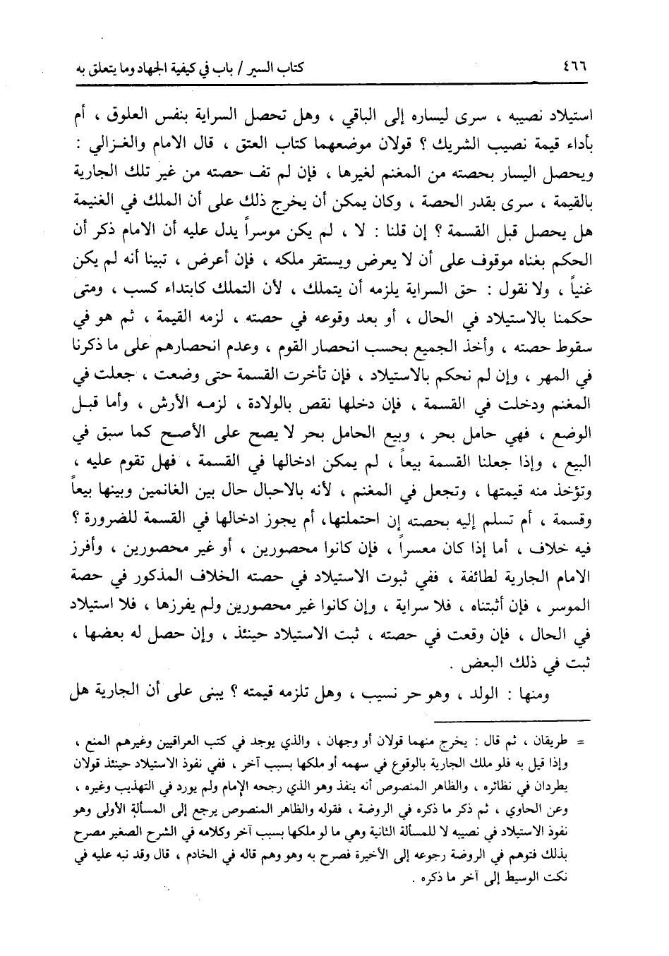 استيلاد نصيبه، سرى ليساره إلى الباقي، وهل تحصل السراية بنفس العلوق، أم بأداء قيمة نصيب الشريك ؟ قولان موضعهما كتاب العتق، قال الامام والغزالي: ويحصل اليسار بحصته من المغنم لغيرها، فإن لم تف حصته من غير تلك الجارية بالقيمة، سرى بقدر الحصة، وكان يمكن أن يخرج ذلك على أن الملك في الغنيمة هل يحصل قبل القسمة ؟ إن قلنا: لا، لم يكن موسرا يدل عليه أن الامام ذكر أن الحكم بغناه موقوف على أن لا يعرض ويستقر ملكه، فإن أعرض، تبينا أنه لم يكن غنيا، ولا تقول: حق السراية يلزمه أن يتملك، لان التملك كابتداء كسب، ومتى حكمنا بالاستيلاد في الحال، أو بعد وقوعه في حصته، لزمه القيمة، ثم هو في سقوط حصته، وأخذ الجميع بحسب انحصار القوم، وعدم انحصارهم على ما ذكرنا في المهر، وإن لم نحكم بالاستيلاد، فإن تأخرت القسمة حتى وضعت، جعلت في المغنم ودخلت في القسمة فإن دخلها نقص بالولادة لزمه الارش، وأما قبل الوضع، فهي حامل بحر وبيع الحامل بحر لا يصح على الاصح كما سبق في البيع، وإذا جعلنا القسمة بيعا، لم يكن ادخالها في القسمة فهل تقوم عليه وتؤخذ من قيمتها وتجعل في المغنم لانه بالاحبال حال بين الغانمين وبينها بيعا وقسمة أم تسلم إليه بحصته إن احتملتها أم يجوز ادخالها في القسمة للضرورة ؟ فيه خلاف أم إذا كان معسرا، فإن كانوا محصورين أو غير محصورين وأفرز الامام الجارية لطائفة ففي ثبوت الاستيلاد في حصته الخلاف المذكور في حصته المسر فإن أثبتنا فلا سراية وإن كانوا غير محصورين ولم يفرزها فلا استيلاد في الحال فإن وقعت في حصته، ثبت الاستيلاد حينئذ، وإن حصل له بعضها، ثبت في ذلك البعض. ومنها: الولد، وهو حر نسيب، وهل تلزمه قيمته ؟ يبنى على أن الجارية هل