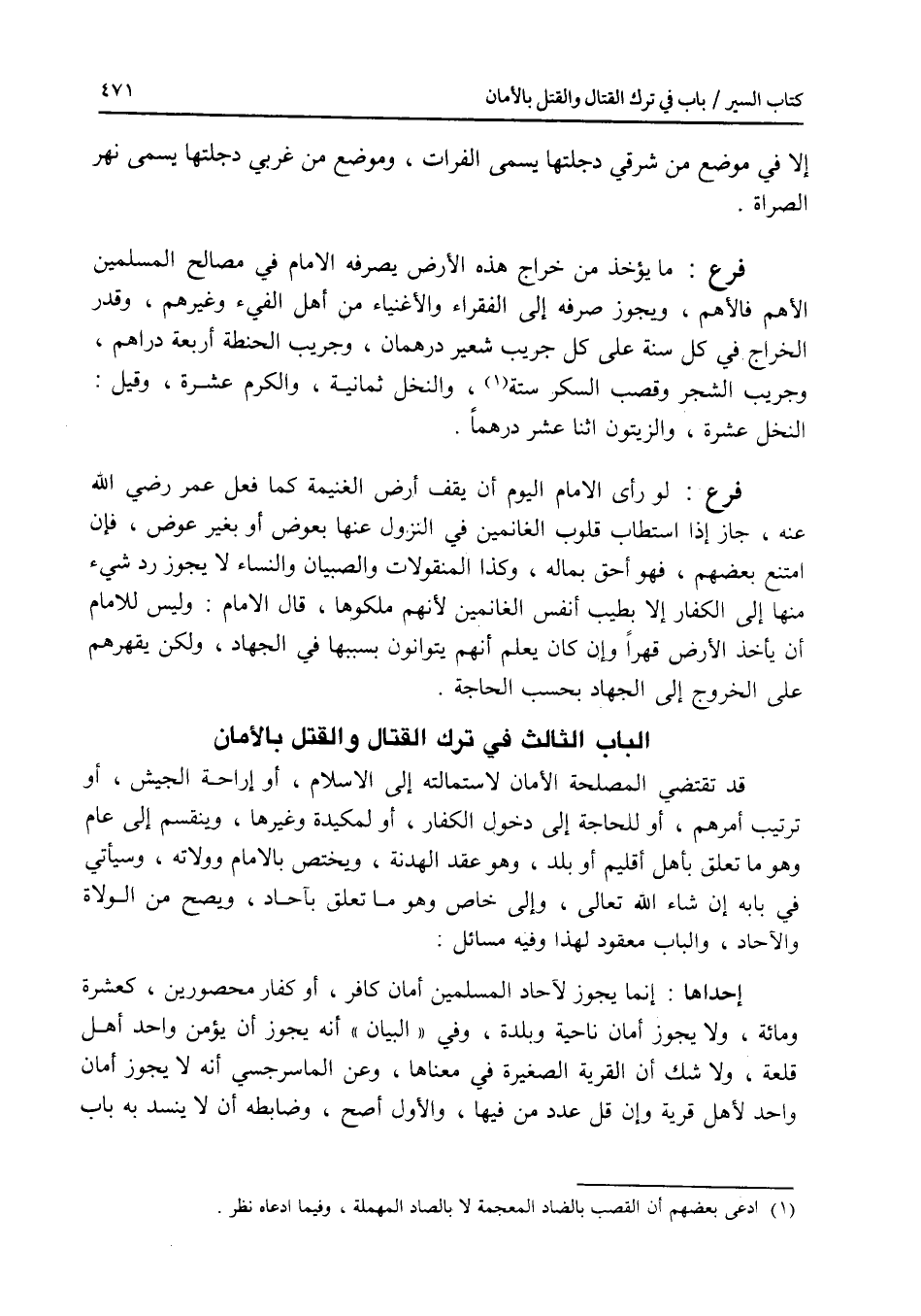 إلا في موضع من شرقي دجلتها يسمى الفرات، وموضع من غربي دجلتها يسمى نهر الصراة. فرع ما يؤخذ من خراج هذه الارض يصرفه الامام في مصالح المسلمين الاهم فالاهم، ويجوز صرفه إلى الفقراء والاغنياء من أهل الفئ وغيرهم، وقدر الخراج في كل سنة على كل جريب شعير درهمان، وجريب الحنطة أربعة دراهم، وجريب الشجر وقصب السكر ستة، والنخل ثمانية، والكرم عشرة، وقيل: النخل عشرة، والزيتون اثنا عشر درهما. فرع لو رأى الامام اليوم أن يقف أرض الغنيمة كما فعل عمر رضي الله عنه، جاز إذا استطاب قلوب الغانمين في النزول عنها بعوض أو بغير عوض، فإن امتنع بعضهم، فهو أحق بماله، وكذا المنقولات والصبيان والنساء لا يجوز رد شئ منها إلى الكفار إلا بطيب أنفس الغانمين، لانهم ملكوها، قال الامام: وليس للامام أن يأخذ الارض قهرا وإن كان يعلم أنهم يتوانون بسببها في الجهاد، ولكن يقهرهم على الخروج إلى الجهاد بحسب الحاجة.