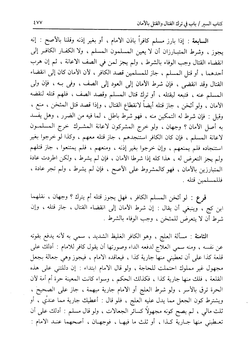 السابعة: إذا بارز مسلم كافرا بإذن الامام، أو بغير إذنه وقلنا بالاصح: إنه يجوز، وشرط المتبارزان أن لا يعين المسلمون المسلم، ولا الكفار الكافر إلى انقضاء القتال وجب الوفاء بالشرط، ولم يجز لمن في الصف الاعانة، ثم إن هرب أحدهما، أو قتل المسلم، جاز للمسلمين قصد الكافر، لان الامان كان إلى انقضاء القتال وقد انقضى، فإن شرط الامان إلى العود إلى الصف، وفى به، فإن ولى المسلم عنه، فتبعه ليقتله، أو ترك قتال المسلم وقصد الصف، فلهم قتله لنقضه الامان، ولو أثخن، جاز قتله أيضا لانقطاع القتال، وإذا قصد قتل المثخن، منع، وقيل: فإن شرط له التمكين منه، فهو شرط باطل، لما فيه من الضرر، وهل يفسد به أصل الامان ؟ وجهان، ولو خرج المشركون لاعانة المشرك، خرج المسلمون لاعانة المسلم، فإن كان الكافر استنجدهم، جاز قتله معهم، وكذا لو خرجوا بغير استنجاده فلم يمنعهم، وإن خرجوا بغير إذنه، ومنعهم، فلم يمتنعوا، جاز قتلهم ولم يجز التعرض له، هذا كله إذا شرطا الامان، فإن لم يشرط، ولكن اطردت عادة المتبارزين بالامان، فهو كالمشروط على الاصح، فإن لم يشرط، ولم تجر عادة، فللمسلمين قتله.