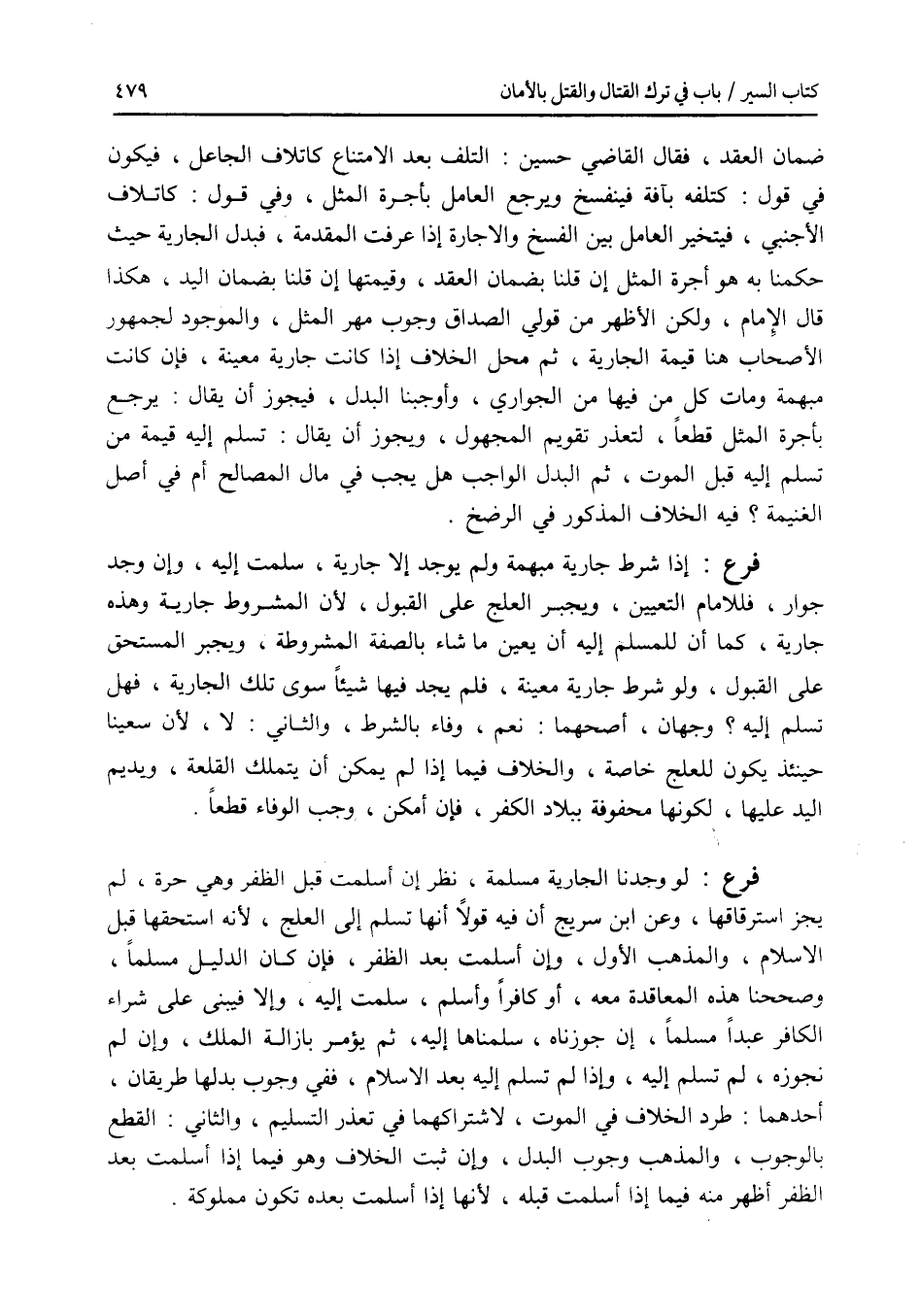 فرع إذا شرط جارية مبهمة ولم يوجد إلا جارية، سلمت إليه، وإن وجد جوار، فللامام التعيين، ويجبر العلج على القبول، لان المشروط جارية وهذه جارية، كما أن للمسلم إليه أن يعين ما شاء بالصفة المشروطة، ويجبر المستحق على القبول، ولو شرط جارية معينة، فلم يجد فيها شيئا سوى تلك الجارية، فهل تسلم إليه ؟ وجهان، أصحهما: نعم، وفاء بالشرط، والثاني: لا، لان سعينا حينئذ يكون للعلج خاصة، والخلاف فيما إذا لم يمكن أن يتملك القلعة، ويديم اليد عليها، لكونها محفوفة ببلاد الكفر، فإن أمكن، وجب الوفاء قطعا. فرع لو وجدنا الجارية مسلمة، نظر إن أسلمت قبل الظفر وهي حرة، لم يجز استرقاقها، وعن ابن سريج أن قولا أنها تسلم إلى العلج، لانه استحقها قبل الاسلام، والمذهب الاول، وإن أسلمت بعد الظفر، فإن كان الدليل مسلما، وصححنا هذه المعاقدة معه، أو كافرا وأسلم، سلمت إليه، وإلا فيبنى على شراء الكافر عبدا مسلما، إن جوزناه، سلمناها إليه، ثم يؤمر بإزالة الملك، وإن لم نجوزه، لم تسلم إليه، وإذا لم تسلم إليه بعد الاسلام، ففي وجوب بدلها طريقان، أحدهما: طرد الخلاف في الموت، لاشتراكهما في تعذر التسليم، والثاني: القطع بالوجوب، والمذهب وجوب البدل، وإن ثبت الخلاف وهو فيما إذا أسلمت بعد الظفر أظهر منه فيما إذا أسلمت قبله، لانها إذا أسلمت بعده تكون مملوكة.