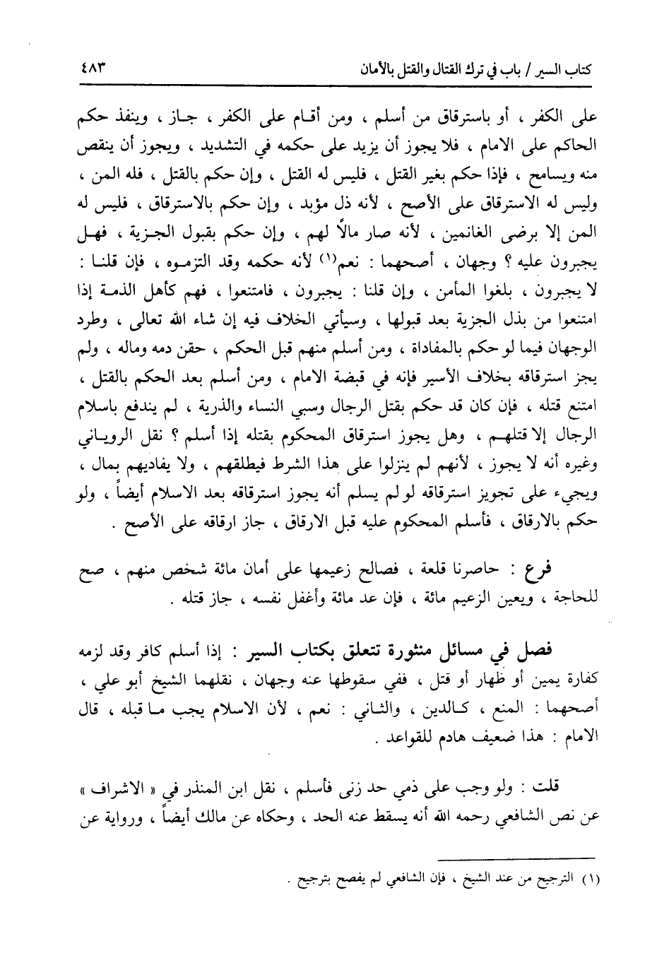 فصل في مسائل منثورة تتعلق بكتاب السير إذا أسلم كافر وقد لزمه كفارة يمين أو ظهار أو قتل، ففي سقوطها عنه وجهان، نقلهما الشيخ أبو علي، أصحهما: المنع، كالدين، والثاني: نعم، لان الاسلام يجب ما قبله، قال الامام: هذا ضعيف هادم للقواعد. قلت: ولو وجب على ذمي حد زنى فأسلم، نقل ابن المنذر في الاشراف عن نص الشافعي رحمه الله أنه يسقط عنه الحد، وحكاه عن مالك أيضا، ورواية عن