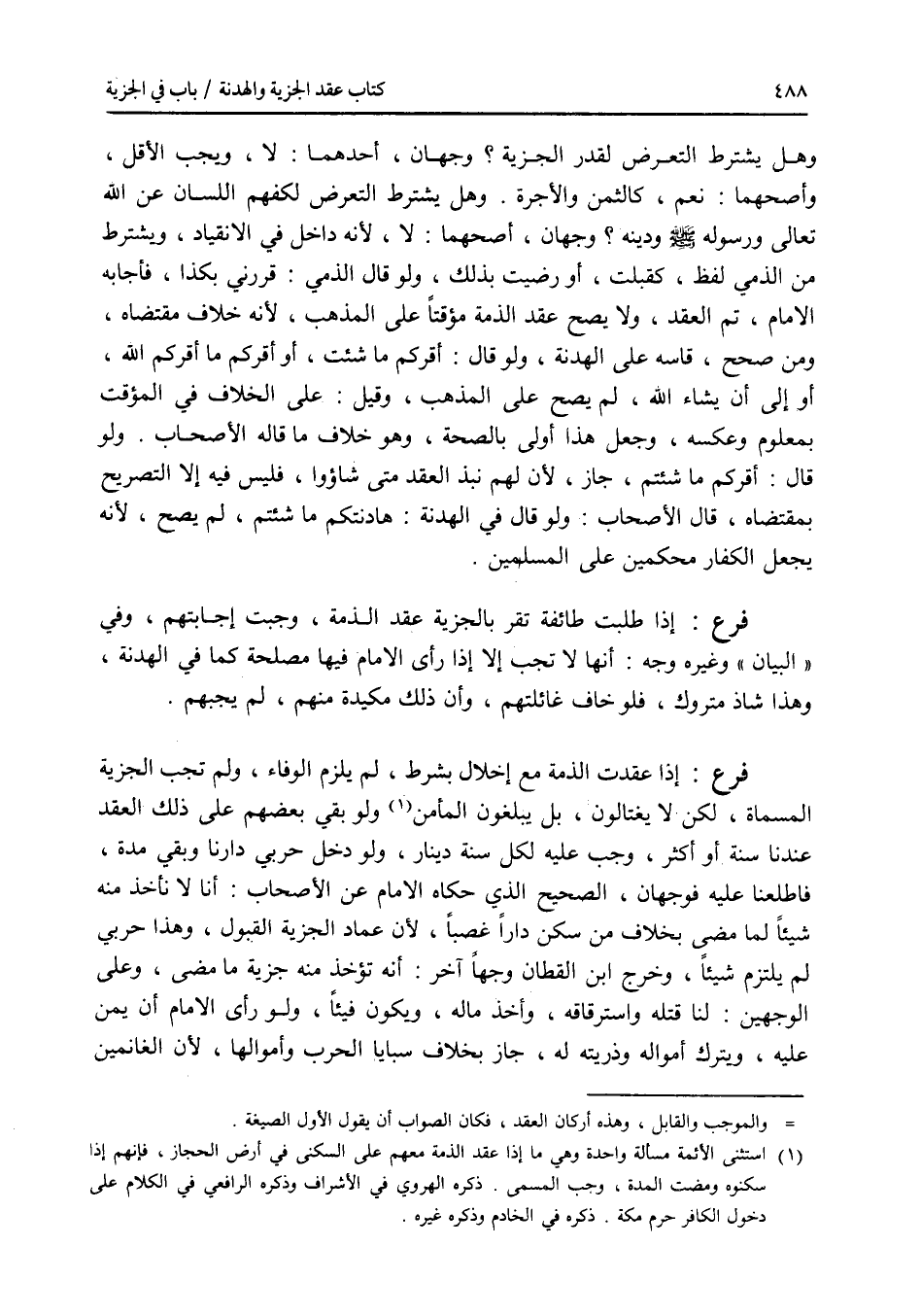 وهل يشترط التعرض لقدر الجزية ؟ وجهان، أحدهما: لا، ويجب الاقل، وأصحهما: نعم، كالثمن والاجرة. وهل يشترط التعرض لكفهم اللسان عن الله تعالى ورسوله - صلى الله عليه وسلم - ودينه ؟ وجهان، أصحهما: لا، لانه داخل في الانقياد، ويشترط من الذمي لفظ، كقبلت، أو رضيت بذلك، ولو قال الذمي: قررني بكذا، فأجابه الامام، تم العقد، ولا يصح عقد الذمة مؤقتا على المذهب، لانه خلاف مقتضاه، ومن صحح، قاسه على الهدنة، ولو قال: أقركم ما شئت، أو أقركم ما أقركم الله، أو إلى أن يشاء الله، لم يصح على المذهب، وقيل: على الخلاف في المؤقت بمعلوم وعكسه، وجعل هذا أولى بالصحة، وهو خلاف ما قاله الاصحاب. ولو قال: أقركم ما شئتم، جاز، لان لهم نبذ العقد متى شاؤوا، فليس فيه إلا التصريح بمقتضاه، قال الاصحاب: ولو قال في الهدنة: هادنتكم ما شئتم، لم يصح، لانه يجعل الكفار محكمين على المسلمين. فرع إذا طلبت طائفة تقر بالجزية عقد الذمة، وجبت إجابتهم، وفي البيان وغيره وجه: أنها لا تجب إلا إذا رأى الامام فيها مصلحة كما في الهدنة، وهذا شاذ متروك، فلو خاف غائلتهم، وأن ذلك مكيدة منهم، لم يجبهم. فرع إذا عقدت الذمة مع إخلال بشرط، لم يلزم الوفاء، ولم تجب الجزية المسماة، لكن لا يغتالون، بل يبلغون المأمن، ولو بقي بعضهم على ذلك العقد عندنا سنة أو أكثر، وجب عليه لكل سنة دينار، ولو دخل حربي دارنا وبقي مدة، فاطلعنا عليه فوجهان، الصحيح الذي حكاه الامام عن الاصحاب: أنا لا نأخذ منه شيئا لما مضى بخلاف من سكن دارا غصبا، لان عماد الجزية القبول، وهذا حربي لم يلتزم شيئا، وخرج ابن القطان وجها آخر: أنه تؤخذ منه جزية ما مضى، وعلى الوجهين: لنا قتله واسترقاقه، وأخذ ماله، ويكون فيئا، ولو رأى الامام أن يمن عليه، ويترك أمواله وذريته له، جاز بخلاف سبايا الحرب وأموالها، لان الغانمين