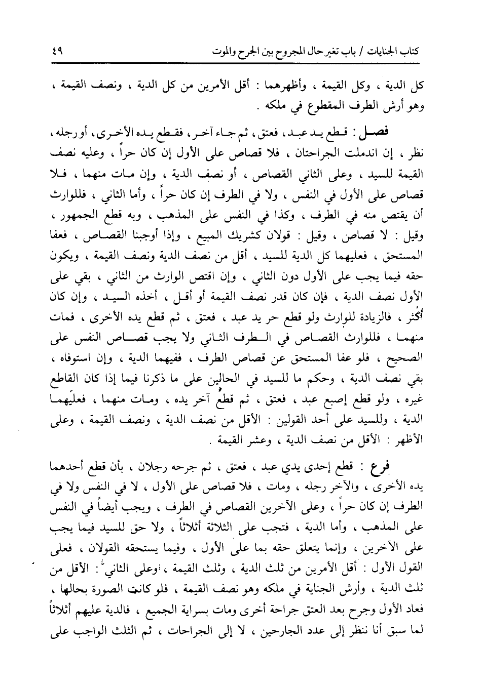 كل الدية، وكل القيمة، وأظهرهما: أقل الامرين من كل الدية، ونصف القيمة، وهو أرش الطرف المقطوع في ملكه. فصل قطع يد عبد، فعتق، ثم جاء آخر، فقطع يده الاخرى، أو رجله، نظر، إن اندملت الجراحتان، فلا قصاص على الاول إن كان حرا، وعليه نصف القيمة للسيد، وعلى الثاني القصاص، أو نصف الدية، وإن مات منهما، فلا قصاص على الاول في النفس، ولا في الطرف إن كان حرا، وأما الثاني، فللوارث أن يقتص منه في الطرف، وكذا في النفس على المذهب، وبه قطع الجمهور، وقيل: لا قصاص، وقيل: قولان كشريك المبيع، وإذا أوجبنا القصاص، فعفا المستحق، فعليهما كل الدية للسيد، أقل من نصف الدية ونصف القيمة، ويكون حقه فيما يجب على الاول دون الثاني، وإن اقتص الوارث من الثاني، بقي على الاول نصف الدية، فإن كان قدر نصف القيمة أو أقل، أخذه السيد، وإن كان أكثر، فالزيادة للوارث ولو قطع حر يد عبد، فعتق، ثم قطع يده الاخرى، فمات منهما، فللوارث القصاص في الطرف الثاني ولا يجب قصاص النفس على الصحيح، فلو عفا المستحق عن قصاص الطرف، ففيهما الدية، وإن استوفاه، بقي نصف الدية، وحكم ما للسيد في الحالين على ما ذكرنا فيما إذا كان القاطع غيره، ولو قطع إصبع عبد، فعتق، ثم قطع آخر يده، ومات منهما، فعليهما الدية، وللسيد على أحد القولين: الاقل من نصف الدية، ونصف القيمة، وعلى الاظهر: الاقل من نصف الدية، وعشر القيمة. فرع قطع إحدى يدي عبد، فعتق، ثم جرحه رجلان، بأن قطع أحدهما يده الاخرى، والآخر رجله، ومات، فلا قصاص على الاول، لا في النفس ولا في الطرف إن كان حرا، وعلى الآخرين القصاص في الطرف، ويجب أيضا في النفس على المذهب، وأما الدية، فتجب على الثلاثة أثلاثا، ولا حق للسيد فيما يجب على الآخرين، وإنما يتعلق حقه بما على الاول، وفيما يستحقه القولان، فعلى القول الاول: أقل الامرين من ثلث الدية، وثلث القيمة، وعلى الثاني: الاقل من ثلث الدية، وأرش الجناية في ملكه وهو نصف القيمة، فلو كانت الصورة بحالها، فعاد الاول وجرح بعد العتق جراحة أخرى ومات بسراية الجميع، فالدية عليهم أثلاثا لما سبق أنا ننظر إلى عدد الجارحين، لا إلى الجراحات، ثم الثلث الواجب على