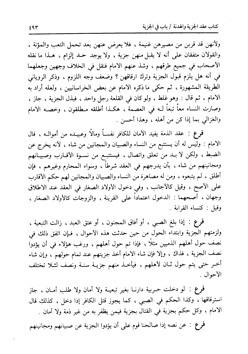 ولانهن قد قربن من مصيرهن غنيمة فلا يعرض عنهن بعد تحمل التعب والمؤنة، والقولان متفقان على أنه لا يقبل منهن جزية، ولا يوجد أحد إلزام، هذا ما نقله الاصحاب في جميع طرقهم، وشذ عنهم الامام فنقل في الخلاف وجهين وجعلهما في أنه هل يلزم قبول الجزية وترك إرقاقهن ؟ وضعف وجه اللزوم، وذكر الروياني الطريقة المشهورة، ثم حكى ما ذكره الامام عن بعض الخراسانيين، ولعله أراد به الامام، ثم قال: وهو غلط، ولو كان في القلعة رجل واحد، فبذل الجزية، جاز، وصارت النساء تبعا له في العصمة، هكذا أطلقه مطلقون، وخصه الامام والغزالي بما إذا كن من أهله، وهذا أحسن. فرع عقد الذمة يفيد الامان للكافر نفسا ومالا وعبيده من أمواله، قال الامام: وليس له أن يستتبع من النساء والصبيان والمجانين من شاء، لانه يخرج عن الضبط، ولكن لا بد من تعلق واتصال، فيستتبع من نسوة الاقارب وصبيانهم ومجانينهم من شاء، بأن يدرجهم في العقد شرطا، وسواء المحارم وغيرهم، فإن أطلق، لم يتبعوه. ومن له مصاهرة من النساء والصبيان والمجانين لهم حكم الاقارب على الاصح، وقيل: كالاجانب، وفي دخول الاولاد الصغار في العقد عند الاطلاق وجهان، أصحهما: الدخول اعتمادا على القرينة، والزوجات كالاولاد الصغار، وقيل: كنساء القرابة. فرع إذا بلغ الصبي، أو أفاق المجنون، أو عتق العبد، زالت التبعية، ولزمتهم الجزية وابتداء الحول من حين حدثت هذه الاحوال، فإن اتفق ذلك في نصف حول أهلهم الذميين مثلا، فإذا تم حول أهلهم، ورغب هؤلاء في أن يؤدوا نصف الجزية، فذاك، وإلا فإن شاء الامام أخذ جزيتهم عند تمام حولهم، وإن شاء أخر حتى يتم حول ثان لاهلهم، فيأخذ منهم جزية سنة ونصف لئلا تختلف الاحوال. فرع لو دخلت حربية دارنا بغير تبعية ولا أمان ولا طلب أمان، جاز استرقاقها، وكذا الحكم في الصبي، كما يجوز قتل الكافر إذا دخل، كذلك قال الامام، وكل حكم بجزية في القتال بجزية فيمن يظفر به من غير ذمة ولا أمان. فرع عن نصه إذا صالحنا قوم على أن يؤدوا الجزية عن صبيانهم ومجانينهم