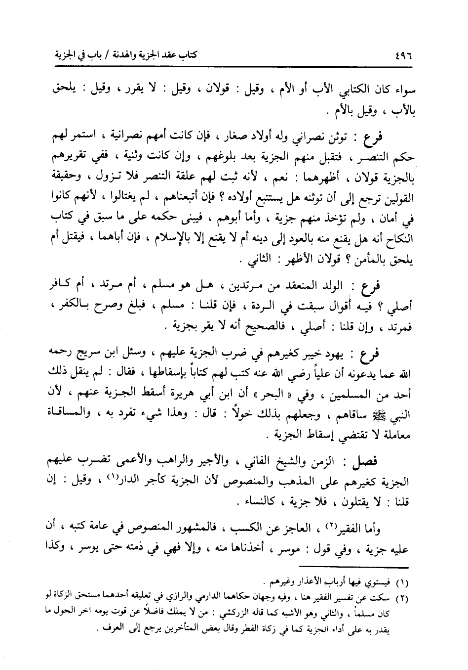 سواء كان الكتابي الاب أو الام، وقيل: قولان، وقيل: لا يقرر، وقيل: يلحق بالاب، وقيل: بالام. فرع توثن نصراني وله أولاد صغار، فإن كانت أمهم نصرانية، استمر لهم حكم التنصر، فتقبل منهم الجزية بعد بلوغهم، وإن كانت وثنية، ففي تقريرهم بالجزية قولان، أظهرهما: نعم، لانه ثبت لهم علقة التنصر فلا تزول، وحقيقة القولين ترجع إلى أن توثنه هل يستتبع أولاده ؟ فإن أتبعناهم، لم يغتالوا، لانهم كانوا في أمان، ولم تؤخذ منهم جزية، وأما أبوهم، فيبنى حكمه على ما سبق في كتاب النكاح أنه هل يقنع منه بالعود إلى دينه أم لا يقنع إلا بالاسلام، فإن أباهما، فيقتل أم يلحق بالمأمن ؟ قولان الاظهر: الثاني. فرع الولد المنعقد من مرتدين، هل هو مسلم، أم مرتد، أم كافر أصلي ؟ فيه أقوال سبقت في الردة، فإن قلنا: مسلم، فبلغ وصرح بالكفر، فمرتد، وإن قلنا: أصلي، فالصحيح أنه لا يقر بجزية. فرع يهود خيبر كغيرهم في ضرب الجزية عليهم، وسئل ابن سريج رحمه الله عما يدعونه أن عليا رضي الله عنه كتب لهم كتابا بإسقاطها، فقال: لم ينقل ذلك أحد من المسلمين، وفي البحر أن ابن أبي هريرة أسقط الجزية عنهم، لان النبي - صلى الله عليه وسلم - ساقاهم، وجعلهم بذلك خولا، قال: وهذا شئ تفرد به، والمساقاة معاملة لا تقتضي إسقاط الجزية. فصل الزمن والشيخ الفاني، والاجير والراهب والاعمى تضرب عليهم الجزية كغيرهم على المذهب والمنصوص، لان الجزية كأجرة الدار، وقيل: إن قلنا: لا يقتلون، فلا جزية، كالنساء، وأما الفقير العاجز عن الكسب، فالمشهور المنصوص في عامة كتبه، أن عليه جزية، وفي قول: موسر، أخذناها منه، وإلا فهي في ذمته حتى يوسر، وكذا