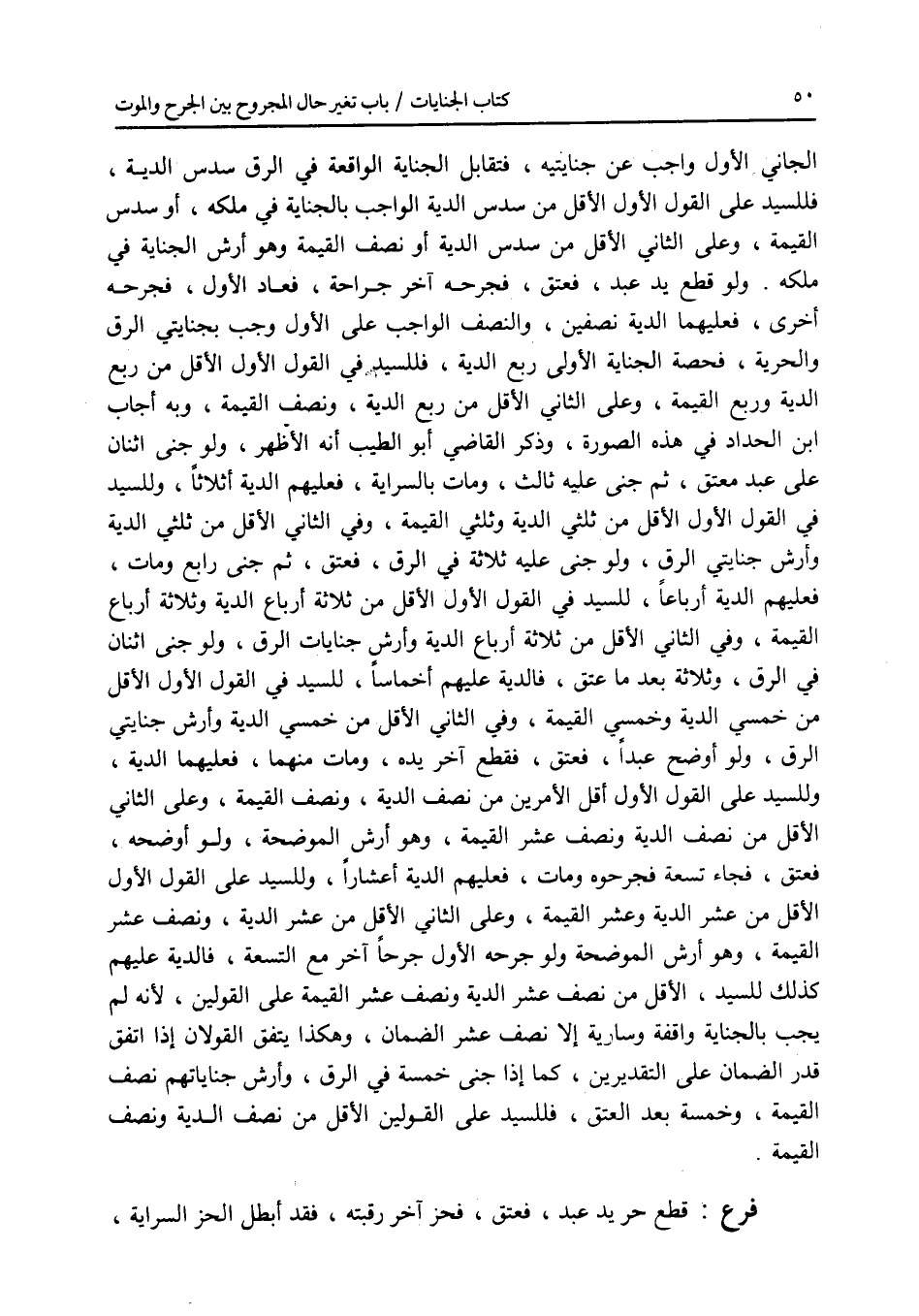 الجاني الاول واجب عن جنايتيه، فتقابل الجناية الواقعة في الرق سدس الدية، فللسيد على القول الاول الاقل من سدس الدية الواجب بالجناية في ملكه، أو سدس القيمة، وعلى الثاني الاقل من سدس الدية أو نصف القيمة وهو أرش الجناية في ملكه. ولو قطع يد عبد، فعتق، فجرحه آخر جراحة، فعاد الاول، فجرحه أخرى، فعليهما الدية نصفين، والنصف الواجب على الاول وجب بجنايتي الرق والحرية، فحصة الجناية الاولى ربع الدية، فللسيد في القول الاول الاقل من ربع الدية وربع القيمة، وعلى الثاني الاقل من ربع الدية، ونصف القيمة، وبه أجاب ابن الحداد في هذه الصورة، وذكر القاضي أبو الطيب أنه الاظهر، ولو جنى اثنان على عبد معتق، ثم جنى عليه ثالث، ومات بالسراية، فعليهم الدية أثلاثا، وللسيد في القول الاول الاقل من ثلثي الدية وثلثي القيمة، وفي الثاني الاقل من ثلثي الدية وأرش جنايتي الرق، ولو جنى عليه ثلاثة في الرق، فعتق، ثم جنى رابع ومات، فعليهم الدية أرباعا، للسيد في القول الاول الاقل من ثلاثة أرباع الدية وثلاثة أرباع القيمة، وفي الثاني الاقل من ثلاثة أرباع الدية وأرش جنايات الرق، ولو جنى اثنان في الرق، وثلاثة بعد ما عتق، فالدية عليهم أخماسا، للسيد في القول الاول الاقل من خمسي الدية وخمسي القيمة، وفي الثاني الاقل من خمسي الدية وأرش جنايتي الرق، ولو أوضح عبدا، فعتق، فقطع آخر يده، ومات منهما، فعليهما الدية، وللسيد على القول الاول أقل الامرين من نصف الدية، ونصف القيمة، وعلى الثاني الاقل من نصف الدية ونصف عشر القيمة، وهو أرش الموضحة، ولو أوضحه، فعتق، فجاء تسعة فجرحوه ومات، فعليهم الدية أعشارا، وللسيد على القول الاول الاقل من عشر الدية وعشر القيمة، وعلى الثاني الاقل من عشر الدية، ونصف عشر القيمة، وهو أرش الموضحة ولو جرحه الاول جرحا آخر مع التسعة، فالدية عليهم كذلك للسيد، الاقل من نصف عشر الدية ونصف عشر القيمة على القولين، لانه لم يجب بالجناية واقفة وسارية إلا نصف عشر الضمان، وهكذا يتفق القولان إذا اتفق قدر الضمان على التقديرين، كما إذا جنى خمسة في الرق، وأرش جناياتهم نصف القيمة، وخمسة بعد العتق، فللسيد على القولين الاقل من نصف الدية ونصف القيمة. فرع قطع حر يد عبد، فعتق، فحز آخر رقبته، فقد أبطل الحز السراية،