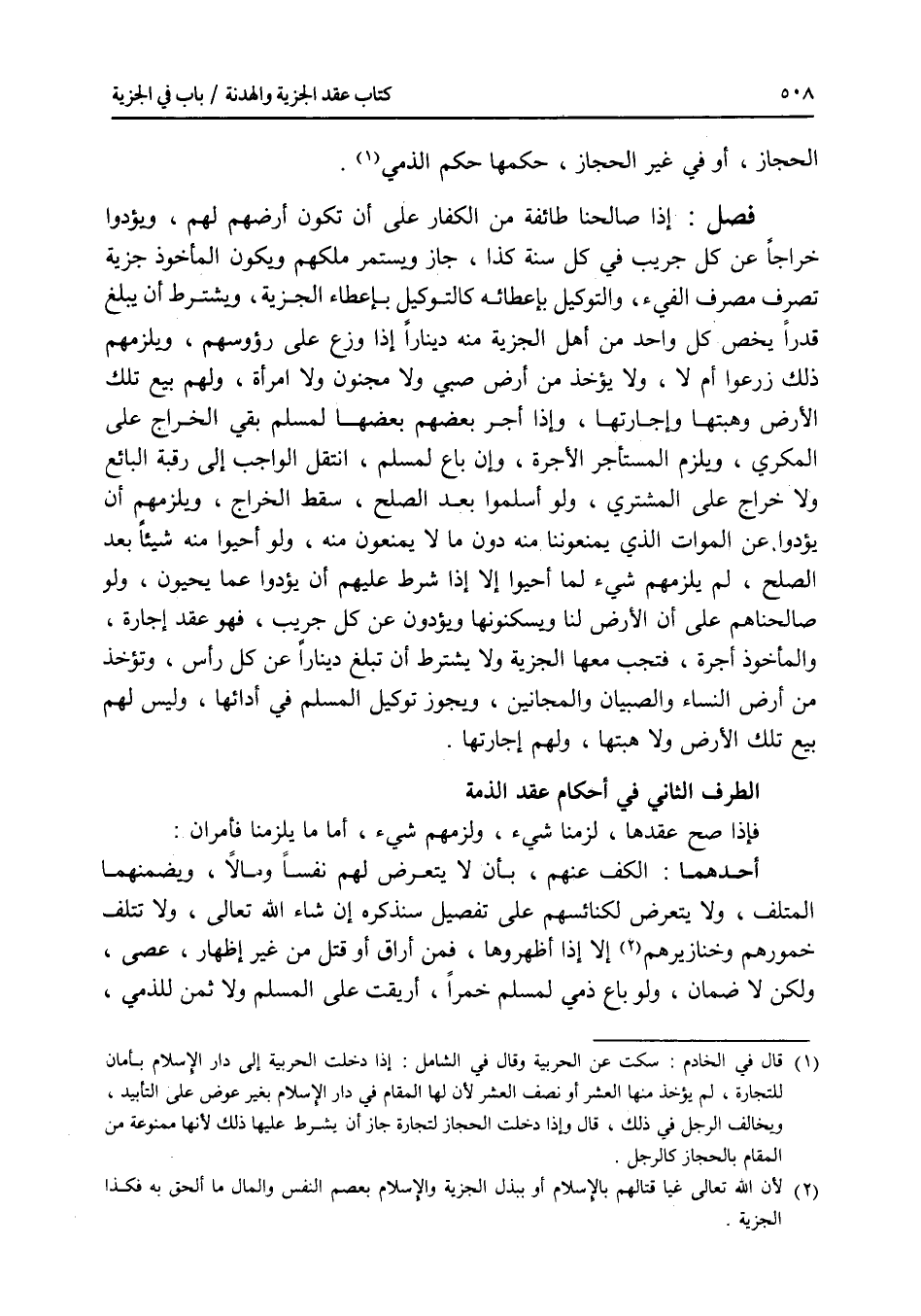 الحجاز، أو في غير الحجاز، حكمها حكم الذمي. فصل إذا صالحنا طائفة من الكفار على أن تكون أرضهم لهم، ويؤدوا خراجا عن كل جريب في كل سنة كذا، جاز ويستمر ملكهم ويكون المأخوذ جزية تصرف مصرف الفئ، والتوكيل بإعطائه كالتوكيل بإعطاء الجزية، ويشترط أن يبلغ قدرا يخص كل واحد من أهل الجزية منه دينارا إذا وزع على رؤوسهم، ويلزمهم ذلك زرعوا أم لا، ولا يؤخذ من أرض صبي ولا مجنون ولا امرأة، ولهم بيع تلك الارض وهبتها وإجارتها، وإذا أجر بعضهم بعضها لمسلم بقي الخراج على المكري، ويلزم المستأجر الاجرة، وإن باع لمسلم، انتقل الواجب إلى رقبة البائع ولا خراج على المشتري، ولو أسلموا بعد الصلح، سقط الخراج، ويلزمهم أن يؤدوا عن المدات الذي يمنعوننا منه دون ما لا يمنعون منه، ولو أحيوا منه شيئا بعد الصلح، لم يلزمهم شئ لما أحيوا إلا إذا شرط عليهم أن يؤدوا عما يحيون، ولو صالحناهم على أن الارض لنا ويسكنونها ويؤدون عن كل جريب، فهو عقد إجازة، والمأخوذ أجرة، فتجب معها الجزية ولا يشترط أن تبلغ دينارا عن كل رأس، وتؤخذ من أرض النساء والصبيان والمجانين، ويجوز توكيل المسلم في أدائها، وليس لهم بيع تلك الارض ولا هبتها، ولهم إجارتها.