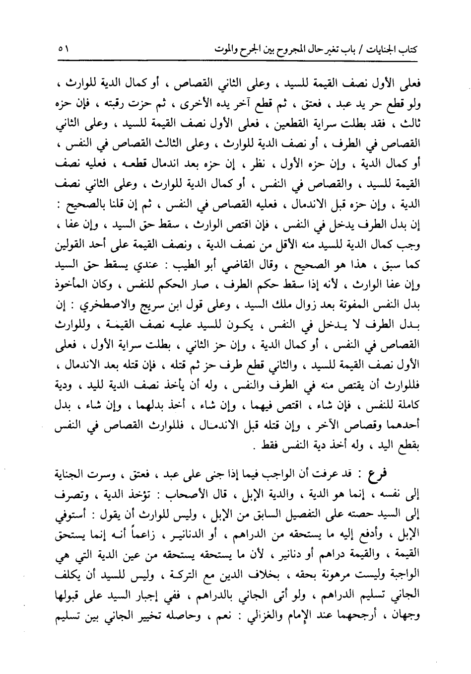 فعلى الاول نصف القيمة للسيد، وعلى الثاني القصاص، أو كمال الدية للوارث، ولو قطع حر يد عبد، فعتق، ثم قطع آخر يده الاخرى، ثم حزت رقبته، فإن حزه ثالث، فقد بطلت سراية القطعين، فعلى الاول نصف القيمة للسيد، وعلى الثاني القصاص في الطرف، أو نصف الدية للوارث، وعلى الثالث القصاص في النفس، أو كمال الدية، وإن حزه الاول، نظر، إن حزه بعد اندمال قطعه، فعليه نصف القيمة للسيد، والقصاص في النفس، أو كمال الدية للوارث، وعلى الثاني نصف الدية، وإن حزه قبل الاندمال، فعليه القصاص في النفس، ثم إن قلنا بالصحيح: إن بدل الطرف يدخل في النفس، فإن اقتص الوارث، سقط حق السيد، وإن عفا، وجب كمال الدية للسيد منه الاقل من نصف الدية، ونصف القيمة على أحد القولين كما سبق، هذا هو الصحيح، وقال القاضي أبو الطيب: عندي يسقط حق السيد وإن عفا الوارث، لانه إذا سقط حكم الطرف، صار الحكم للنفس، وكان المأخوذ بدل النفس المفوتة بعد زوال ملك السيد، وعلى قول ابن سريج والاصطخري: أن بدل الطرف لا يدخل في النفس، يكون للسيد عليه نصف القيمة، وللوارث القصاص في النفس، أو كمال الدية، وإن حز الثاني، بطلت سراية الاول، فعلى الاول نصف القيمة للسيد، والثاني قطع طرف حز ثم قتله، فإن قتله بعد الاندمال، فللوارث أن يقتص منه في الطرف والنفس، وله أن يأخذ نصف الدية لليد، ودية كاملة للنفس، فإن شاء، اقتص فيهما، وإن شاء، أخذ بدلهما، وإن شاء، بدل أحدهما وقصاص الآخر، وإن قتله قبل الاندمال، فللوارث القصاص في النفس بقطع اليد، وله أخذ دية النفس فقط. فرع قد عرفت أن الواجب فيما إذا جنى على عبد، فعتق، وسرت الجناية إلى نفسه، إنما هو الدية، والدية الابل، قال الاصحاب: تؤخذ الدية، وتصرف إلى السيد حصته على التفصيل السابق من الابل، وليس للوارث أن يقول: أستوفي الابل، وأدفع إليه ما يستحقه من الدراهم، أو الدنانير، زاعما أنه إنما يستحق القيمة، والقيمة دراهم أو دنانير، لان ما يستحقه يستحقه من عين الدية التي هي الواجبة وليست مرهونة بحقه، بخلاف الدين مع التركة، وليس للسيد أن يكلف الجاني تسليم الدراهم، ولو أتى الجاني بالدراهم، ففي إجبار السيد على قبولها وجهان، أرجحهما عند الامام والغزالي: نعم، وحاصله تخيير الجاني بين تسليم