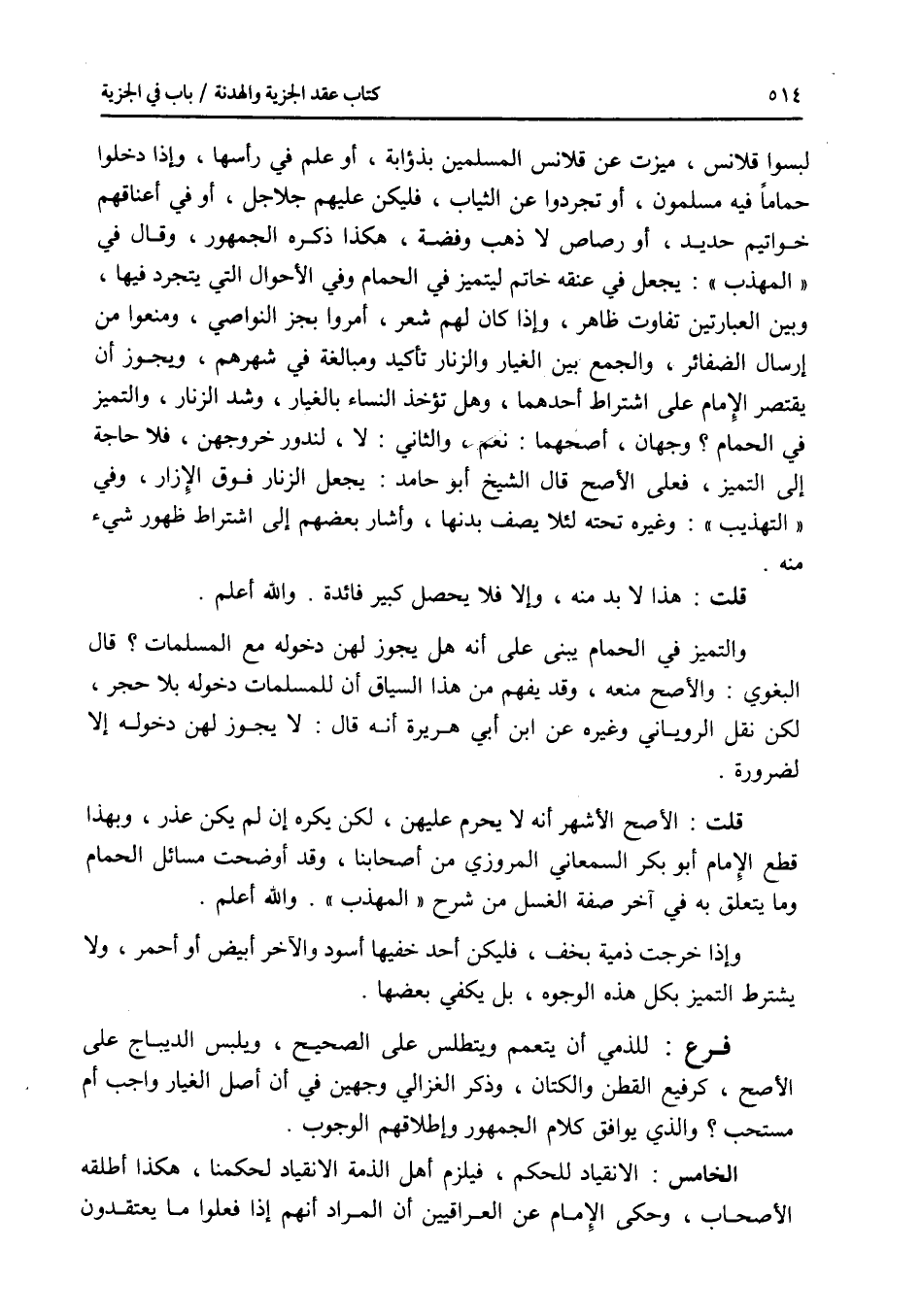 لبسوا قلانس، ميزت عن قلانس المسلمين بذؤابة، أو علم في رأسها، وإذا دخلوا حماما فيه مسلمون، أو تجردوا عن الثياب، فليكن عليهم جلاجل، أو في أعناقهم خواتيم حديد، أو رصاص لا ذهب وفضة، هكذا ذكره الجمهور، وقال في المهذب: يجعل في عنقه خاتم ليتميز في الحمام وفي الاحوال التي يتجرد فيها، وبين العبارتين تفاوت ظاهر، وإذا كان لهم شعر، أمروا بجز النواصي، ومنعوا من إرسال الضفائر، والجمع بين الغيار والزنار تأكيد ومبالغة في شهرهم، ويجوز أن يقتصر الامام على اشتراط أحدهما، وهل تؤخذ النساء بالغيار، وشد الزنار، والتميز في الحمام ؟ وجهان، أصحهما نعم، والثاني: لا، لندور خروجهن، فلا حاجة إلى التميز، فعلى الاصح قال الشيخ أبو حامد: يجعل الزنار فوق الازار، وفي التهذيب: وغيره تحته لئلا يصف بدنها، وأشار بعضهم إلى اشتراط ظهور شئ منه. قلت: هذا لا بد منه، وإلا فلا يحصل كبير فائدة. والله أعلم. والتميز في الحمام يبنى على أنه هل يجوز لهن دخوله مع المسلمات ؟ قال البغوي: والاصح منعه، وقد يفهم من هذا السياق أن للمسلمات دخوله بلا حجر، لكن نقل الروياني وغيره عن ابن أبي هريرة أنه قال: لا يجوز لهن دخوله إلا لضرورة. قلت: الاصح الاشهر أنه لا يحرم عليهن، لكن يكره إن لم يكن عذر، وبهذا قطع الامام أبو بكر السمعاني المروزي من أصحابنا، وقد أوضحت مسائل الحمام وما يتعلق به في آخر صفة الغسل من شرح المهذب. والله أعلم. وإذا خرجت ذمية بخف، فليكن أحد خفيها أسود والآخر أبيض أو أحمر، ولا يشترط التميز بكل هذه الوجوه، بل يكفي بعضها. فرع للذمي أن تعممم ويتطلس على الصحيح، ويلبس الديباج على الاصح، كرفيع القطن والكتان، وذكر الغزالي وجهين في أن أصل الغيار واجب أم مستحب ؟ والذي يوافق كلام الجمهور وإطلاقهم الوجوب. الخامس: الانقياد للحكم، فيلزم أهل الذمة الانقياد لحكمنا، هكذا أطلقه الاصحاب، وحكى الامام عن العراقيين أن المراد أنهم إذا فعلوا ما يعتقدون