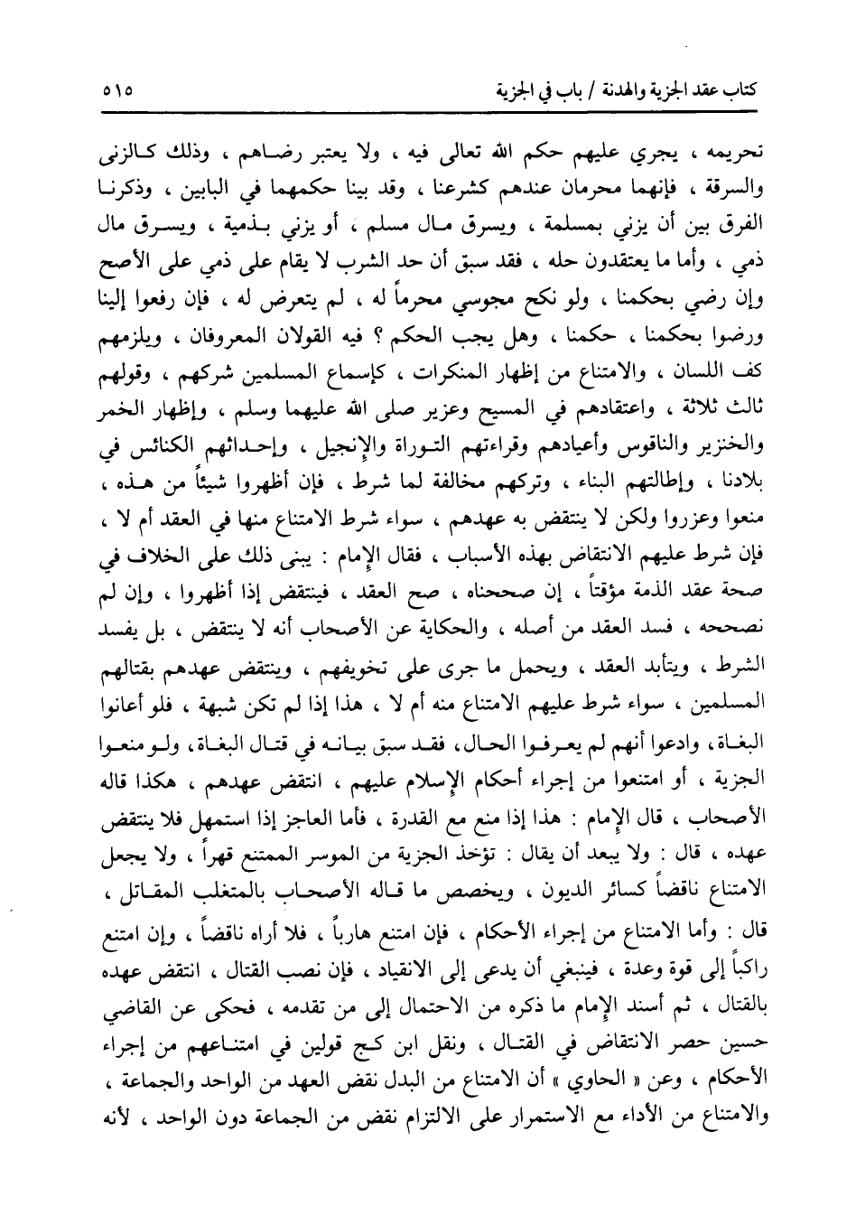 تحريمه، يجري عليهم حكم الله تعالى فيه، ولا يعتبر رضاهم، وذلك كالزنى والسرقة، فإنهما محرمان عندهم كشرعنا، وقد بينا حكمهما في البابين، وذكرنا الفرق بين أن يزني بمسلمة، ويسرق مال مسلم، أو يزنى بذمية، ويسرق مال ذمي، وأما ما يعتقدون حله، فقد سبق أن حد الشرب لا يقام على ذمي على الاصح وإن رضى بحكمنا، ولو نكح مجوسي محرما له، لم يتعرض له، فإن رفعوا إلينا ورضوا بحكمنا، حكمنا، وهل يجب الحكم ؟ فيه القولان المعروفان، ويلزمهم كف اللسان، والامتناع من إظهار المنكرات، كإسماع المسلمين شركهم، وقولهم ثالث ثلاثة، واعتقادهم في المسيح وعزير - صلى الله عليه وسلم -، وإظهار الخمر والخنزير والناقوس وأعيادهم وقراءتهم التوراة والانجيل، وإحداثهم الكنائس في بلادنا، وإطالتهم البناء، وتركهم مخالفة لما شرط، فإن أظهروا شيئا من هذه، منعوا وعزروا ولكن لا ينتقض به عهدهم، سواء شرط الامتناع منها في العقد أم لا، فإن شرط عليهم الانتقاض بهذه الاسباب، فقال الامام: يبنى ذلك على الخلاف في صحة عقد الذمة مؤقتا، إن صححناه، صح العقد، فينتقض إذ أظهروا، وإن لم نصححه، فسد العقد من أصله، والحكاية عن الاصحاب أنه لا ينتقض، بل يفسد الشرط، ويتأبد العقد، ويحمل ما جرى على تخويفهم، وينتقض عهدهم بقتالهم المسلمين، سواء شرط عليهم الامتناع منه أم لا، هذا إذا لم تكن شبهة، فلو أعانوا البغاة، وادعوا أنهم لم يعرفوا الحال، فقد سبق بيانه في قتال البغاة، ولو منعوا الجزية، أو امتنعوا من إجراء أحكام الاسلام عليهم، انتقض عهدهم، هكذا قاله الاصحاب، قال الامام: هذا إذا منع مع القدرة، فأما العاجز إذا استمهل فلا ينتقض عهده، قال: ولا يبعد أن يقال: تؤخذ الجزية من الموسر الممتنع قهرا، ولا يجعل الامتناع ناقضا كسائر الديون، ويخصص ما قاله الاصحاب بالمتغلب المقاتل، قال: وأما الامتناع من إجراء الاحكام، فإن امتنع هاربا، فلا أراه ناقضا، وإن امتنع راكبا إلى قوة وعدة، فينبغي أن يدعى إلى الانقياد، فإن نصب القتال، انتقض عهده بالقتال، ثم أسند الامام ما ذكره من الاحتمال إلى من تقدمه، فحكى عن القاضي حسين الانتقاض في القتال، ونقل ابن كج قولين في امتناعهم من إجراء الاحكام، وعن الحاوي أن الامتناع من البدل نقض العهد من الواحد والجماعة، والامتناع من الاداء مع الاستمرار على الالتزام نقض من الجماعة دون الواحد، لانه