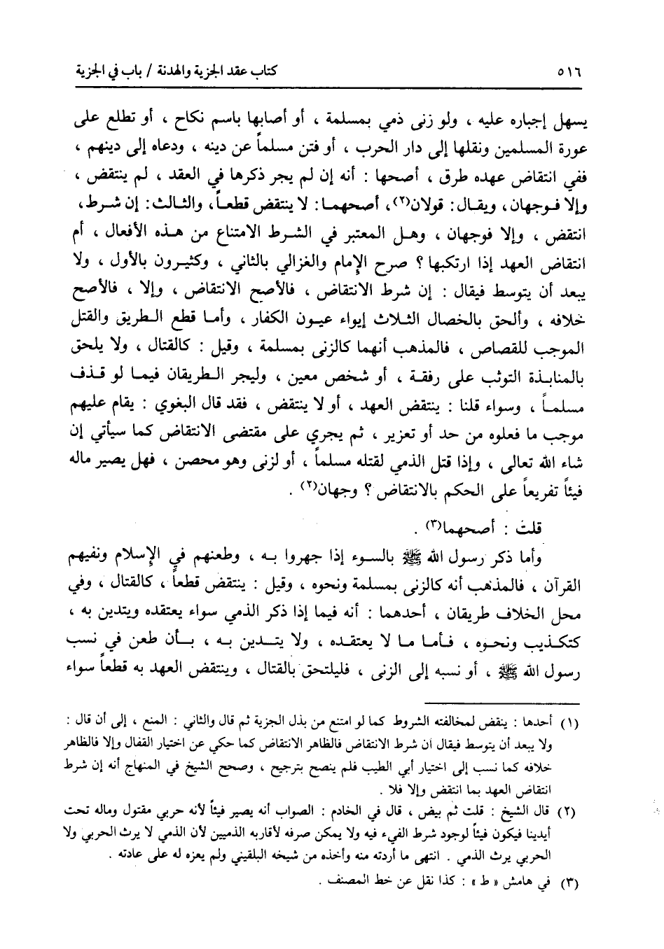 يسهل إجباره عليه، ولو زنى ذمي بمسلمة، أو أصابها باسم نكاح، أو تطلع على عورة المسلمين ونقلها إلى دار الحرب، أو فتن مسلما عن دينه، ودعاه إلى دينهم، ففي انتقاض عهده طرق، أصحها: أنه لم يجر ذكرها في العقد، لم ينتقض، وإلا فوجهان، ويقال: قولان، أصحهما: لا ينتقض قطعا، والثالث: إن شرط، انتقض، وإلا فوجهان، وهل المعتبر في الشرط الامتناع من هذه الافعال، أم انتقاض العهد إذا ارتكبها ؟ صرح الامام والغزالي بالثاني، وكثيرون بالاول، ولا يبعد أن يتوسط فيقال: إن شرط الانتقاض، فالاصح الانتقاض، وإلا، فالاصح خلافه، وألحق بالخصال الثلاث إيواء عيون الكفار، وأما قطع الطريق والقتل الموجب للقصاص، فالمذهب أنهما كالزنى بمسلمة، وقيل: كالقتال، ولا يلحق بالمنابذة التوثب على رفقة، أو شخص معين، وليجر الطريقان فيما لو قذف مسلما، وسواء قلنا: ينتقض العهد، أو لا ينتقض، فقد قال البغوي: يقام عليهم موجب ما فعلوه من حد أو تعزيز، ثم يجري على مقتضى الانتقاض كما سيأتي إن شاء الله تعالى، وإذا قتل الذمي لقتله مسلما، أو لزنى وهو محصن، فهل يصير ماله فيئا تفريعا على الحكم بالانتقاض ؟ وجهان. قلت: أصحهما. وأما ذكر رسول الله - صلى الله عليه وسلم - بالسوء إذا جهروا به، وطعنهم في الاسلام ونفيهم القرآن، فالمذهب أنه كالزنى بمسلمة ونحوه، وقيل: ينتقض قطعا، كالقتال، وفي محل الخلاف طريقان، أحدهما: أنه فيما إذا ذكر الذمي سواء يعتقده ويتدين به، كتكذيب ونحوه، فأما ما لا يعتقده، ولا يتدين به، بأن طعن في نسب رسول الله - صلى الله عليه وسلم -، أو نسبه إلى الزنى، فليلتحق بالقتال، وينتقض العهد به قطعا سواء
