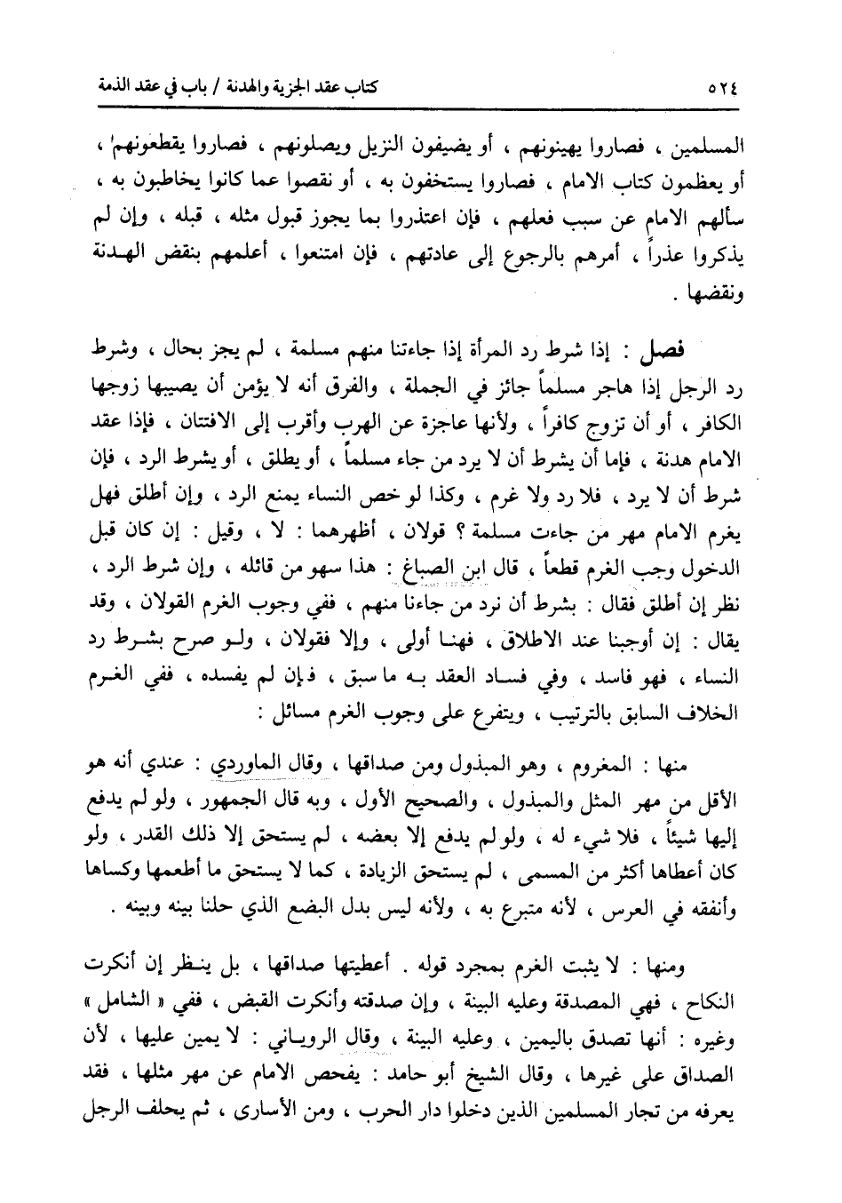 المسلمين، فصاروا يهينونهم، أو يضيفون النزيل ويصلونهم، فصاروا يقطعونهم، أو يعظمون كتاب الامام، فصاروا يستخفون به، أو نقصوا عما كانوا يخاطبون به، سألهم الامام عن سبب فعلهم، فإن اعتذروا بما يجوز قبول مثله، قبله، وإن لم يذكروا عذرا، أمرهم بالرجوع إلى عادتهم، فإن امتنعوا، أعلمهم بنقض الهدنة ونقضها. فصل إذا شرط رد المرأة إذا جاءتنا منهم مسلمة، لم يجز بحال، وشرط رد الرجل إذا هاجر مسلما جائز في الجملة، والفرق أنه لا يؤمن أن يصيبها زوجها الكافر، أو أن تزوج كافرا، ولانها عاجزة عن الهرب وأقرب إلى الافتتان، فإذا عقد الامام هدنة، فإما أن يشرط أن لا يرد من جاء مسلما، أو يطلق، أو يشرط الرد، أو شرط أن لا يرد، فلا رد ولا غرم، وكذا لو خص النساء، يمنع الرد، وإن أطلق فهل يغرم الامام مهر من جاءت مسلمة ؟ قولان، أظهرهما: لا، وقيل: إن كان قبل الدخول وجب الغرم قطعا، قال ابن الصباغ: هذا سهو من قائله، وإن شرط الرد، نظر إن أطلق فقال: بشرط أن نرد من جاءنا منهم، ففي وجوب الغرم القولان، وقد يقال: إن أوجبنا عند الاطلاق، فهنا أولى، وإلا فقولان، ولو صرح بشرط رد النساء، فهو فاسد، وفي فساد العقد به ما سبق، فإن لم يفسده، ففي الغرم الخلاف السابق بالترتيب، ويتفرع على وجوب الغرم مسائل: منها: المغروم، وهو المبذول من صداقها، وقال الماوردي: عندي أنه هو الاقل من مهر المثل والمبذول، والصحيح الاول، وبه قال الجمهور، ولو لم يدفع إليها شيئا، فلا شئ له، ولو لم يدفع إلا بعضه، لم يستحق إلا ذلك القدر، ولو كان أعطاها أكثر من المسمى، لم يستحق الزيادة، كما لا يستحق ما أطعمها وكساها وأنفقه في العرس، لانه متبرع به، ولانه ليس بدل البضع الذي حلنا بينه وبينه. ومنها: لا يثبت الغرم بمجرد قوله: أعطيتها صداقها، بل ينظر إن أنكرت النكاح، فهي المصدقة وعليه البينة، وإن صدقته وأنكرت القبض، ففي الشامل وغيره: أنها تصدق باليمين، وعليه البينة، وقال الروياني: لا يمين عليها، لان الصداق على غيرها، وقال الشيخ أبو حامد: يفحص الامام عن مهر مثلها، فقد يعرفه من تجار المسلمين الذين دخلوا دار الحرب، ومن الاسارى، ثم يحلف الرجل