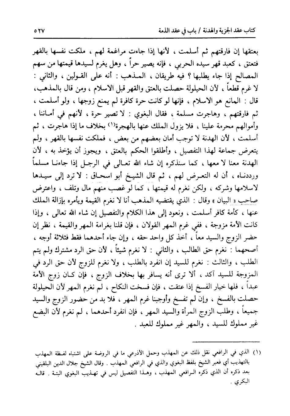 بعتقها إن فارقتهم ثم أسلمت، لانها إذا جاءت مراغمة لهم، ملكت نفسها بالقهر فتعتق، كعبد قهر سيده الحربي، فإنه يصير حرا، وهل يغرم لسيدها قيمتها من سهم المصالح إذا جاء يطلبها ؟ فيه طريقان، المذهب: أنه على القولين، والثاني: لا غرم قطعا، لان الحيلولة حصلت بالعتق والقهر قبل الاسلام، ومن قال بالمذهب، قال: المانع هو الاسلام، فإنها لو كانت حرة كافرة لم يمنع زوجها، ولو أسلمت، ثم فارقتهم، وهاجرت مسلمة، فقال البغوي: لا تصير حرة، لانهم في أماننا، وأموالهم محرمة علينا، فلا يزول الملك عنها بالهجرة بخلاف ما إذا هاجرت، ثم أسلمت، لان الهدنة لا توجب أمان بعضهم من بعض، فملكت نفسها بالقهر، ولم يتعرض جماعة لهذا التفصيل، وأطلقوا الحكم بالعتق، ويجوز أن يؤخذ به، لان الهدنة جرت معنا لا معها، كما سنذكره إن شاء الله تعالى في الرجل إذا جاءنا مسلما ورددناه، أن له التعرض لهم، ثم قال الشيخ أبو إسحق: لا ترد إلى سيدها لاسلامها وشركه، ولكن نغرم له قيمتها، كما لو غصب منهم مال وتلف، واعترض صاحب البيان وقال: الذي يقتضيه المذهب أنا لا نغرم القيمة ويأمره بإزالة الملك عنها، كأمة كافر أسلمت، ونعود إلى هذا الكلام والتفصيل إن شاء الله تعالى، وإذا كانت الامة مزوجة، ففي غرم المهر القولان، فإن قلنا بغرامة المهر والقيمة، نظر إن حضر الزوج والسيد معا، أخذ كل واحد حقه، وإن جاء أحدهما فقط فثلاثة أوجه، أصحهما: نغرم حق الطالب، والثاني: لا نغرم شيئا، لان حق الرد مشترك ولم يتم الطلب، والثالث: نغرم للسيد إن انفرد بالطلب، ولا نغرم للزوج لان حق الرد في المزوجة للسيد آكد، ألا ترى أنه يسافر بها بخلاف الزوج، فإن كان زوج الامة عبدا، فلها خيار الفسخ إذا عتقت، فإن فسخت النكاح، لم نغرم المهر لان الحيلولة حصلت بالفسخ، وإن لم تفسخ وأوجبنا غرم المهر، فلا بد من حضور الزوج والسيد جميعا، وطلب الزوج المرأة والسيد المهر، فإن انفرد أحدهما، لم نغرم لان البضع غير مملوك للسيد، والمهر غير مملوك للعبد.
