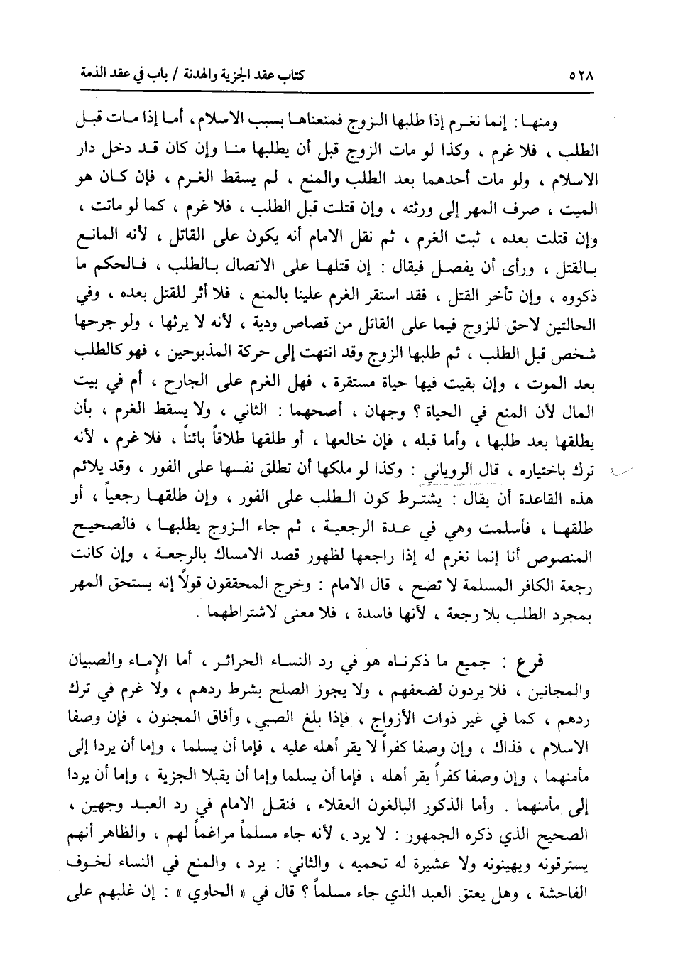 ومنها: إنما نغرم إذا طلبها الزوج فمنعناها بسبب الاسلام، أما إذا مات قبل الطلب، فلا غرم، وكذا لو مات الزوج قبل أن يطلبها منا وإن كان قد دخل دار الاسلام، ولو مات أحدهما بعد الطلب والمنع، لم يسقط الغرم، فإن كان هو الميت، صرف المهر إلى ورثته، وإن قتلت قبل الطلب، فلا غرم، كما لو ماتت، وإن قتلت بعده، ثبت الغرم، ثم نقل الامام أنه يكون على القاتل، لانه المانع بالقتل، ورأى أن يفصل فيقال: إن قتلها على الاتصال بالطلب، فالحكم ما ذكروه، وإن تأخر القتل، فقد استقر الغرم علينا بالمنع، فلا أثر للقتل بعده، وفي الحالتين لا حق للزوج فيما على القاتل من قصاص ودية، لانه لا يرثها، ولو جرحها شخص قبل الطلب، ثم طلبها الزوج وقد انتهت إلى حركة المذبوحين، فهو كالطلب بعد الموت، وإن بقيت فيها حياة مستقرة، فهل الغرم على الجارح، أم في بيت المال لان المنع في الحياة ؟ وجهان، أصحهما: الثاني، ولا يسقط الغرم، بأن يطلقها بعد طلبها، وأما قبله، فإن خالعها، أو طلقها طلاقا بائنا، فلا غرم، لانه ترك باختياره، قال الروياني: وكذا لو ملكها أن تطلق نفسها على الفور، وقد يلائم هذه القاعدة أن يقال: يشترط كون الطلب على الفور، وإن طلقها رجعيا، أو طلقها، فأسلمت وهي في عدة الرجعية، ثم جاء الزوج يطلبها، فالصحيح المنصوص أنا إنما نغرم له إذا راجعها لظهور قصد الامساك بالرجعة، وإن كانت رجعة الكافر المسلمة لا تصح، قال الامام: وخرج المحققون قولا أنه يستحق المهر بمجرد الطلب بلا رجعة، لانها فاسدة، فلا معنى لاشتراطها. فرع جميع ما ذكرناه هو في رد النساء الحرائر، أما الاماء والصبيان والمجانين، فلا يردون لضعفهم، ولا يجوز الصلح بشرط ردهم، ولا غرم في ترك ردهم، كما في غير ذوات الازواج، فإذا بلغ الصبي، وأفاق المجنون، فإن وصفا الاسلام، فذاك، وإن وصفا كفرا لا يقر أهله عليه، فإما أن يسلما، وإما أن يردا إلى مأمنهما، وإن وصفا كفرا يقر أهله، فإما أن يسلما وإما أن يقبلا الجزية، وإما أن يردا إلى مأمنهما. وأما الذكور البالغون العقلاء، فنقل الامام في رد العبد وجهين، الصحيح الذي ذكره الجمهور: لا يرد، لانه جاء مسلما مراغما لهم، والظاهر أنهم يسترقونه ويهينونه ولا عشيرة له تحميه، والثاني: يرد، والمنع في النساء لخوف الفاحشة، وهل يعتق العبد الذي جاء مسلما ؟ قال في الحاوي: إن غلبهم على