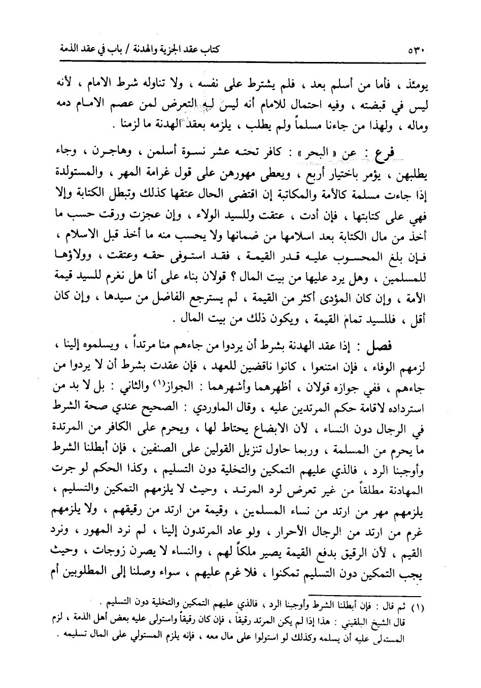 يومئذ، فأما من أسلم بعد، فلم يشترط على نفسه، ولا تناوله شرط الامام، لانه ليس في قبضته، وفيه احتمال للامام أنه ليس له التعرض لمن عصم الامام دمه وماله، ولهذا من جاءنا مسلما ولم يطلب، يلزمه بعقد الهدنة ما لزمنا. فرع عن البحر: كافر تحته عشر نسوة أسلمن، وهاجرن، وجاء يطلبهن، يؤمر باختيار أربع، ويعطى مهورهن على قول غرامة المهر، والمستولدة إذا جاءت مسلمة كالامة والمكاتبة إن اقتضى الحال عتقها كذلك وتبطل الكتابة وإلا فهي على كتابتها، فإن أدت، عتقت وللسيد الولاء، وإن عجزت ورقت حسب ما أخذ من مال الكتابة بعد إسلامها من ضمانها ولا يحسب منه ما أخذ قبل الاسلام، فإن بلغ المحسوب عليه قدر القيمة، فقد استوفى حقه وعتقت، وولاؤها للمسلمين، وهل يرد عليها من بيت المال ؟ قولان بناء على أنا هل نغرم للسيد قيمة الامة، وإن كان المؤدى أكثر من القيمة، لم يسترجع الفاضل من سيدها، وإن كان أقل، فللسيد تمام القيمة، ويكون ذلك من بيت المال. فصل إذا عقد الهدنة بشرط أن يردوا من جاءهم منا مرتدا، ويسلموه إلينا، لزمهم الوفاء، فإن امتنعوا، كانوا ناقضين للعهد، فإن عقدت بشرط أن لا يردوا من جاءهم، ففي جوازه قولان، أظهرهما وأشهرهما: الجواز، والثاني: المنع، بل لا بد من استرداده لاقامة حكم المرتدين عليه، وقال الماوردي: الصحيح عندي صحة الشرط في الرجال دون النساء، لان الابضاع يحتاط لها، ويحرم على الكافر من المرتدة ما يحرم من المسلمة، وربما حاول تنزيل القولين على الصنفين، فإن أبطلنا الشرط وأوجبنا الرد، فالذي عليهم التمكين والتخلية دون التسليم، وكذا الحكم لو جرت المهادنة مطلقا من غير تعرض لرد المرتد، وحيث لا يلزمهم التمكين والتسليم، يلزمهم مهر من ارتد من نساء المسلمين، وقيمة من ارتد من رقيقهم، ولا يلزمهم غرم من ارتد من الرجال الاحرار، ولو عاد المرتدون إلينا، لم نرد المهور، ونرد القيم، لان الرقيق بدفع القيمة يصير ملكا لهم، والنساء لا يصرن زوجات، وحيث يجب التمكين دون التسليم تمكنوا، فلا غرم عليهم، سواء وصلنا إلى المطلوبين أم