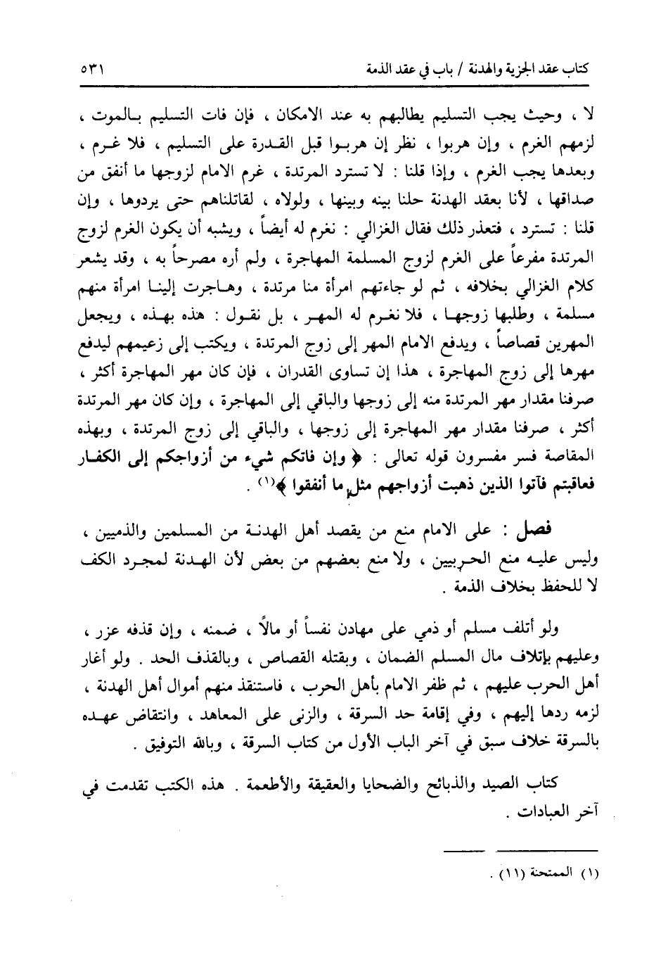 لا، وحيث يجب التسليم يطالبهم به عند الامكان، فإن فات التسليم بالموت، لزمهم الغرم، وإن هربوا، نظر إن هربوا قبل القدرة على التسليم، فلا غرم، وبعدها يجب الغرم، وإذا قلنا: لا تسترد المرتدة، غرم الامام لزوجها ما أنفق من صداقها، لانا بعقد الهدنة حلنا بينه وبينها، ولولاه، لقاتلناهم حتى يردوها، وإن قلنا: تسترد، فتعذر ذلك فقال الغزالي: نغرم له أيضا، ويشبه أن يكون الغرم لزوج المرتدة مفرعا على الغرم لزوج المسلمة المهاجرة، ولم أره مصرحا به، وقد يشعر كلام الغزالي بخلافه، ثم لو جاءتهم امرأة منا مرتدة، وهاجرت إلينا امرأة منهم مسلمة، وطلبها زوجها، فلا نغرم له المهر، بل نقول: هذه بهذه، ويجعل المهرين قصاصا، ويدفع الامام المهر إلى زوج المرتدة، ويكتب إلى زعيمهم ليدفع مهرها إلى زوج المهاجرة، هذا إن تساوى القدران، فإن كان مهر المهاجرة أكثر، صرفنا مقدار مهر المرتدة منه إلى زوجها والباقي إلى المهاجرة، وإن كان مهر المرتدة أكثر، صرفنا مقدار مهر المهاجرة إلى زوجها، والباقي إلى زوج المرتدة، وبهذه المقاصة فسر مفسرون قوله تعالى: * (وإن فاتكم شئ من أزواجكم إلى الكفار فعاقبتم فآتوا الذين ذهبت أزواجهم مثل ما أنفقوا) *. فصل على الامام منع من يقصد أهل الهدنة من المسلمين والذميين، وليس عليه منع الحربيين، ولا منع بعضهم من بعض لان الهدنة لمجرد الكف لا للحفظ بخلاف الذمة. ولو أتلف مسلم أو ذمي على مهادن نفسا أو مالا، ضمنه، وإن قذفه عزر، وعليهم بإتلاف مال المسلم الضمان، وبقتله القصاص، وبالقذف الحد. ولو أغار أهل الحرب عليهم، ثم ظفر الامام بأهل الحرب، فاستنقذ منهم أموال أهل الهدنة، لزمه ردها إليهم، وفي إقامة حد السرقة، والزنى على المعاهد، وانتقاض عهده بالسرقة خلاف سبق في آخر الباب الأول من كتاب السرقة، وبالله التوفيق. كتاب الصيد والذبائح والضحايا والعقيقة والاطعمة. هذه الكتب تقدمت في آخر العبادات.