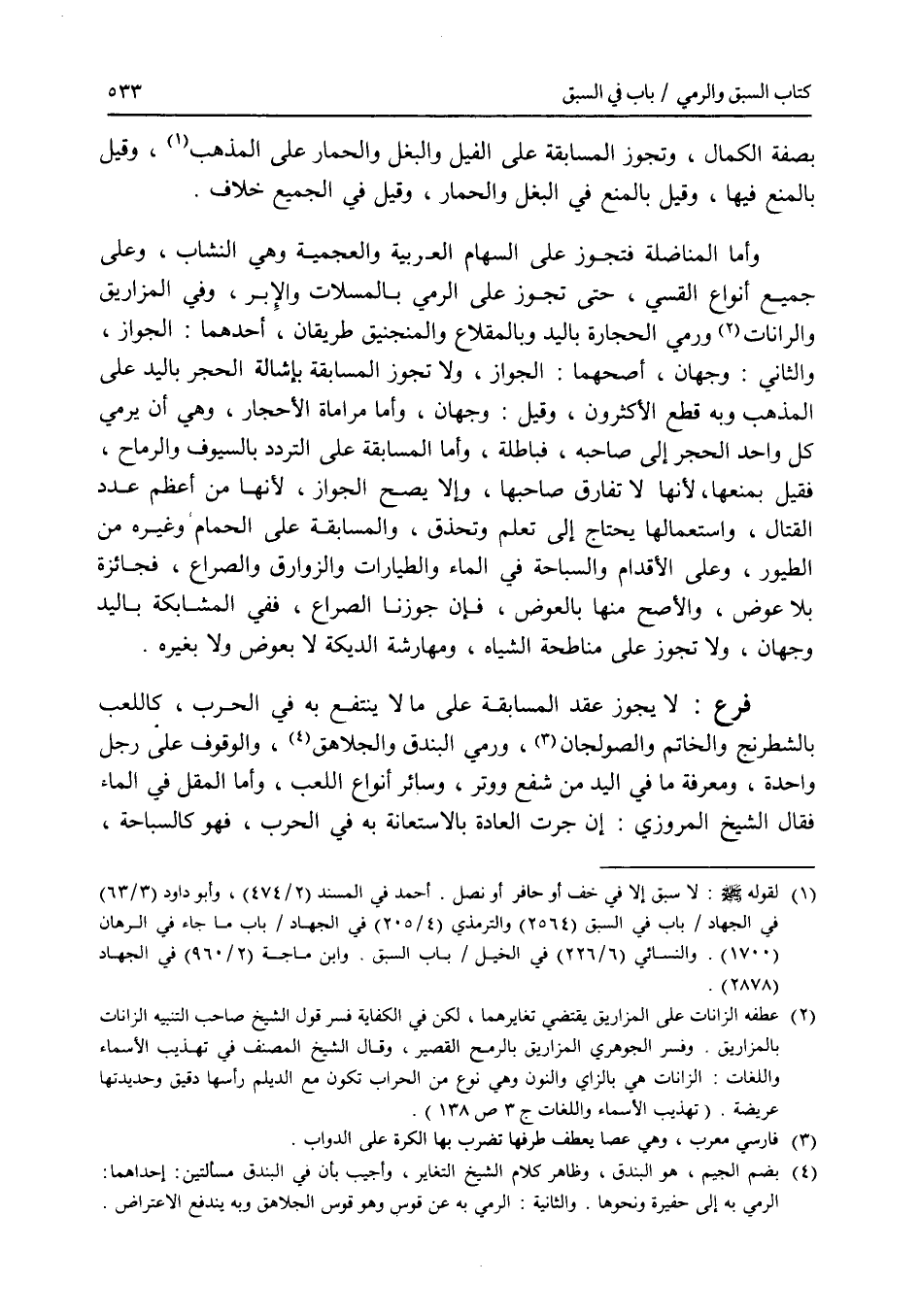 بصفة الكمال، وتجوز المسابقة على الفيل والبغل والحمار على المذهب، وقيل بالمنع فيها، وقيل بالمنع في البغل والحمار، وقيل في الجميع خلاف. وأما المناضلة فتجوز على السهام العربية والعجمية وهي النشاب، وعلى جميع أنواع القسي، حتى تجوز على الرمي بالمسلات والابر، وفي المزاريق والرانات ورمي الحجارة باليد وبالمقلاع والمنجنيق طريقان، أحدهما: الجواز، والثاني: وجهان، أصحهما: الجواز، ولا تجوز المسابقة بإشالة الحجر باليد على المذهب وبه قطع الاكثرون، وقيل: وجهان، وأما مراماة الاحجار، وهي أن يرمي كل واحد الحجر إلى صاحبه، فباطلة، وأما المسابقة على التردد بالسيوف والرماح، فقيل بمنعها، لانها لا تفارق صاحبها، وإلا يصح الجواز، لانها من أعظم عدد القتال، واستعمالها يحتاج إلى تعلم وتحذق، والمسابقة على الحمام وغيره من الطيور، وعلى الاقدام والسباحة في الماء والطيارات والزوارق والصراع، فجائزة بلا عوض، والاصح منها بالعوض، فإن جوزنا الصراع، ففي المشابكة باليد وجهان، ولا تجوز على مناطحة الشياه، ومهارشة الديكة لا بعوض ولا بغيره. فرع لا يجوز عقد المسابقة على ما لا ينتفع به في الحرب، كاللعب بالشطرنج والخاتم والصولجان، ورمي البندق والجلاهق، والوقوف على رجل واحدة، ومعرفة ما في اليد من شفع ووتر، وسائر أنواع اللعب، وأما المقل في الماء فقال الشيخ المروزي: إن جرت العادة بالاستعانة به في الحرب، فهو كالسباحة،