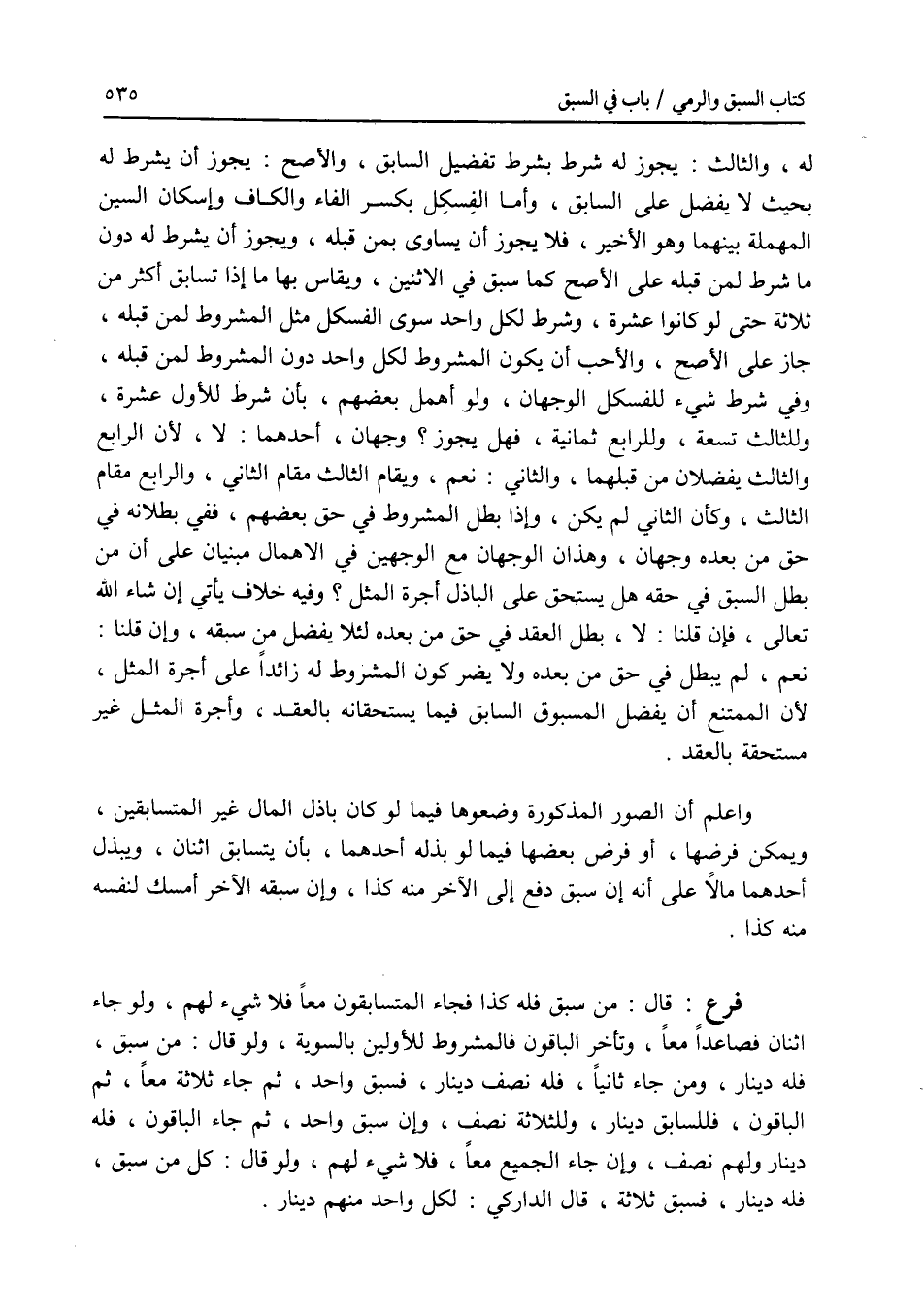 له، والثالث: يجوز له شرط بشرط تفضيل السابق، والاصح: يجوز أن يشرط له بحيث لا يفضل على السابق، وأما الفسكل بكسر الفاء والكاف وإسكان السين المهملة بينهما وهو الاخير، فلا يجوز أن يساوى بمن قبله، ويجوز أن يشرط له دون ما شرط لمن قبله على الاصح كما سبق في الاثنين، ويقاس بها ما إذا تسابق أكثر من ثلاثة حتى لو كانوا عشرة، وشرط لكل واحدة سوى الفسكل مثل المشروط لمن قبله، جاز على الاصح، والاحب أن يكون المشروط لكل واحد دون المشروط لمن قبله، وفي شرط شئ للفسكل الوجهان، ولو أهمل بعضهم، بأن شرط للاول عشرة، وللثالث تسعة، وللرابع ثمانية، فهل يجوز ؟ وجهان، أحدهما: لا، لان الرابع والثالث يفضلان من قبلهما، والثاني: نعم، ويقام الثالث مقام الثاني، والرابع مقام الثالث، وكأن الثاني لم يكن، وإذا بطل المشروط في حق بعضهم، ففي بطلانه في حق من بعده وجهان، وهذان الوجهان مع الوجهين في الاهمال مبنيان على أن من بطل السبق في حقه هل يستحق على الباذل أجرة المثل ؟ وفيه خلاف يأتي إن شاء الله تعالى، فإن قلنا: لا، بطل العقد في حق من بعده لئلا يفضل من سبقه، وإن قلنا: نعم، لم يبطل في حق من بعده ولا يضر كون المشروط له زائدا على أجرة المثل، لان الممتنع أن يفضل المسبوق السابق فيما يستحقانه بالعقد، وأجرة المثل غير مستحقة بالعقد. واعلم أن الصور المذكورة وضعوها فيما لو كان باذل المال غير المتسابقين، ويمكن فرضها أو فرض، بعضها فيما لو بذله أحدهما، بأن يتسابق اثنان، ويبذل أحدهما مالا على أنه إن سبق دفع إلى الآخر منه كذا، وإن سبقه الآخر أمسك لنفسه منه كذا. فرع قال: من سبق فله كذا فجاء المتسابقون معا فلا شئ لهم، ولو جاء اثنان فصاعدا معا، وتأخر الباقون فالمشروط للاولين بالسوية، ولو قال: من سبق، فله دينار، ومن جاء ثانيا، فله نصف دينار، فسبق واحد، ثم جاء ثلاثة معا، ثم الباقون، فللسابق دينار، وللثلاثة نصف، وإن سبق واحد، ثم جاء الباقون، فله دينار، ولهم نصف، وإن جاء الجميع معا، فلا شئ لهم، ولو قال: كل من سبق، فله دينار، فسبق ثلاثة، قال الداركي: لكل واحد منهم دينار.