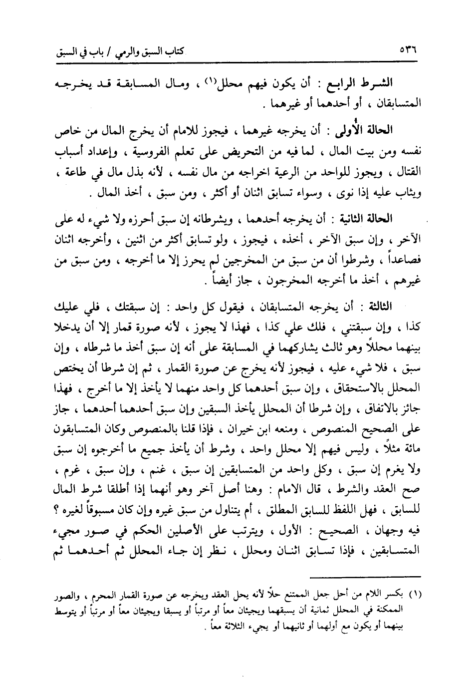 الشرط الرابع : أن يكون فيهم محلل، ومال المسابقة قد يخرجه المتسابقان، أو أحدهما أو غيرهما. الحالة الاولى: أن يخرجه غيرهما، فيجوز للامام أن يخرج المال من خاص نفسه ومن بيت المال، لما فيه من التحريض على تعلم الفروسية، وإعداد أسباب القتال، ويجوز للواحد من الرعية إخراجه من مال نفسه، لانه بذل مال في طاعة، ويثاب عليه إذا نوى، وسواء تسابق اثنان أو أكثر، ومن سبق، أخذ المال. الحالة الثانية: أن يخرجه أحدهما، ويشرطانه إن سبق أحرزه ولا شئ له على الآخر، وإن سبق الآخر، أخذه، فيجوز، ولو تسابق أكثر من اثنين، وأخرجه اثنان فصاعدا، وشرطوا أن من سبق من المخرجين لم يحرز إلا ما أخرجه، ومن سبق من غيرهم، أخذ ما أخرجه المخرجون، جاز أيضا. الثالثة: أن يخرجه المتسابقان، فيقول كل واحد: إن سبقتك، فلي عليك كذا، وإن سبقتني، فلك علي كذا، فهذا لا يجوز، لانه صورة قمار إلا أن يدخلا بينهما محللا وهو ثالث يشاركهما في المسابقة على أنه إن سبق أخذ ما شرطاه، وإن سبق، فلا شئ عليه، فيجوز لانه يخرج عن صورة القمار، ثم إن شرطا أن يختص المحلل بالاستحقاق، وإن سبق أحدهما كل واحد منهما لا يأخذ إلا ما أخرج، فهذا جائز بالاتفاق، وإن شرطا أن المحلل يأخذ السبقين وإن سبق أحدهما أحدهما، جاز على الصحيح المنصوص، ومنعه ابن خيران، فإذا قلنا بالمنصوص وكان المتسابقون مائة مثلا، وليس فيهم إلا محلل واحد، وشرط أن يأخذ جميع ما أخرجوه إن سبق ولا يغرم إن سبق، وكل واحد من المتسابقين إن سبق، غنم، وإن سبق، غرم، صح العقد والشرط، قال الامام: وهنا أصل آخر وهو أنهما إذا أطلقا شرط المال للسابق، فهل اللفظ للسابق المطلق، أم يتناول من سبق غيره وإن كان مسبوقا لغيره ؟ فيه وجهان، الصحيح: الاول، ويترتب على الاصلين الحكم في صور مجئ المتسابقين، فإذا تسابق اثنان ومحلل، نظر إن جاء المحلل ثم أحدهما ثم