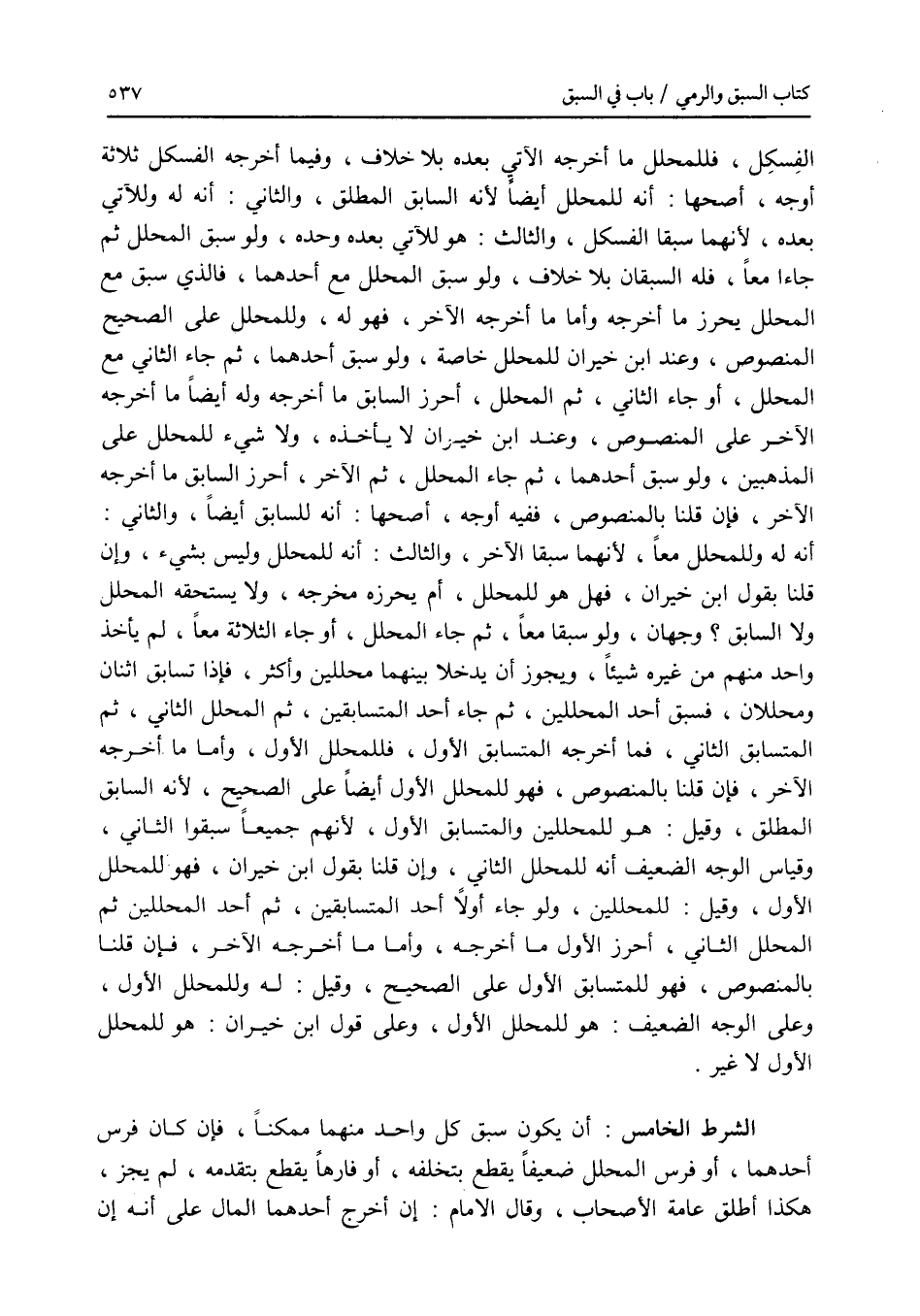 الفسكل، فللمحلل ما أخرجه الآتي بعده بلا خلاف، وفيما أخرجه الفسكل ثلاثة أوجه، أصحها: أنه للمحلل أيضا لانه السابق المطلق، والثاني: أنه له وللآتي بعده، لانهما سبقا الفسكل، والثالث: هو للآتي بعده وحده، ولو سبق المحلل ثم جاءا معا، فله السبقان بلا خلاف، ولو سبق المحلل مع أحدهما، فالذي سبق مع المحلل يحرز ما أخرجه وأما ما أخرجه الآخر، فهو له، وللمحلل على الصحيح المنصوص، وعند ابن خيران للمحلل خاصة، ولو سبق أحدهما، ثم جاء الثاني مع المحلل، أو جاء الثاني، ثم المحلل، أحرز السابق ما أخرجه وله أيضا ما أخرجه الآخر على المنصوص، وعند ابن خيران لا يأخذه، ولا شئ للمحلل على المذهبين، ولو سبق أحدهما، ثم جاء المحلل، ثم الآخر، أحرز السابق ما أخرجه الآخر، فإن قلنا بالمنصوص، ففيه أوجه، أصحها: أنه للسابق أيضا، والثاني: أنه له وللمحلل معا، لانهما سبقا الآخر، والثالث: أنه للمحلل وليس بشئ، وإن قلنا بقول ابن خيران، فهل هو للمحلل، أم يحرزه مخرجه، ولا يستحقه المحلل ولا السابق ؟ وجهان، ولو سبقا معا، ثم جاء المحلل، أو جاء الثلاثة معا، لم يأخذ واحد منهم من غيره شيئا، ويجوز أن يدخلا بينهما محللين وأكثر، فإذا تسابق اثنان ومحللان، فسبق أحد المحللين، ثم جاء أحد المتسابقين، ثم المحلل الثاني، ثم المتسابق الثاني، فما أخرجه المتسابق الاول، فللمحلل الاول، وأما ما أخرجه الآخر، فإن قلنا بالمنصوص، فهو للمحلل الاول أيضا على الصحيح، لانه السابق المطلق، وقيل: هو للمحللين والمتسابق الاول، لانهم جميعا سبقوا الثاني، وقياس الوجه الضعيف أنه للمحلل الثاني، وإن قلنا بقول ابن خيران، فهو للمحلل الاول، وقيل: للمحللين، ولو جاء أولا أحد المتسابقين، ثم أحد المحللين ثم المحلل الثاني، أحرز الاول ما أخرجه، وأما ما أخرجه الآخر، فإن قلنا بالمنصوص، فهو للمتسابق الاول على الصحيح، وقيل: له وللمحلل الاول، وعلى الوجه الضعيف: هو للمحلل الاول، وعلى قول ابن خيران: هو للمحلل الاول لا غير. الشرط الخامس: أن يكون سبق كل واحد منهما ممكنا، فإن كان فرس أحدهما، أو فرس المحلل ضعيفا يقطع بتخلفه، أو فارها يقطع بتقدمه، لم يجز، هكذا أطلق عامة الاصحاب، وقال الامام: إن أخرج أحدهما المال على أنه إن