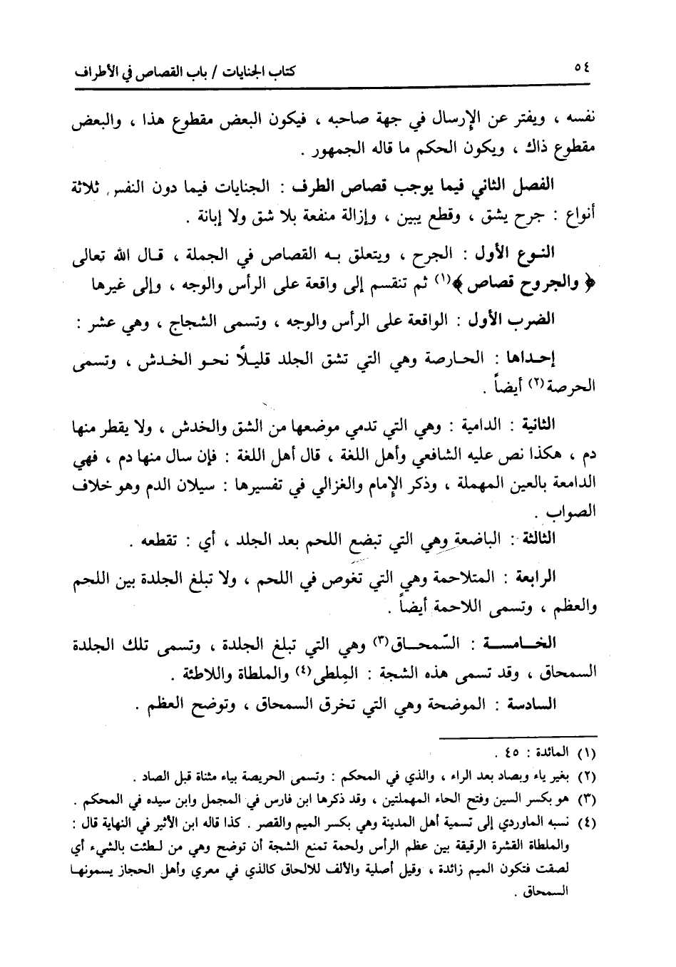 الفصل الثاني : فيما يوجب قصاص الطرف الجنايات فيما دون النفس ثلاثة أنواع: جرح يشق، وقطع يبين، وإزالة منفعة بلا شق ولا إبانة. النوع الاول: الجرح، ويتعلق به القصاص في الجملة، قال الله تعالى * (والجروح قصاص) * ثم تنقسم إلى واقعة على الرأس والوجه، وإلى غيرها. الضرب الاول: الواقعة على الرأس والوجه، وتسمى الشجاج، وهي عشر، إحداها: الحارصة وهي التي تشق الجلد قليلا نحو الخدش، وتسمى الحرصة أيضا، الثانية: الدامية: وهي التي تدمي موضعها من الشق والخدش، ولا يقطر منها دم، هكذا نص عليه الشافعي وأهل اللغة، قال أهل اللغة: فإن سال منها دم، فهي الدامعة بالعين المهملة، وذكر الامام والغزالي في تفسيرها: سيلان الدم وهو خلاف الصواب، الثالثة: الباضعة وهي التي تبضع اللحم بعد الجلد، أي: تقطعه، الرابعة: المتلاحمة وهي التي تغوص في اللحم، ولا تبلغ الجلدة بين اللحم والعظم، وتسمى اللاحمة أيضا، الخامسة: السمحاق وهي التي تبلغ تلك الجلدة، وتسمى تلك الجلدة السمحاق، وقد تسمى هذه الشجة: الملطى والملطاة واللاطئة، السادسة: الموضحة وهي التي تخرق السمحاق، وتوضح العظم،