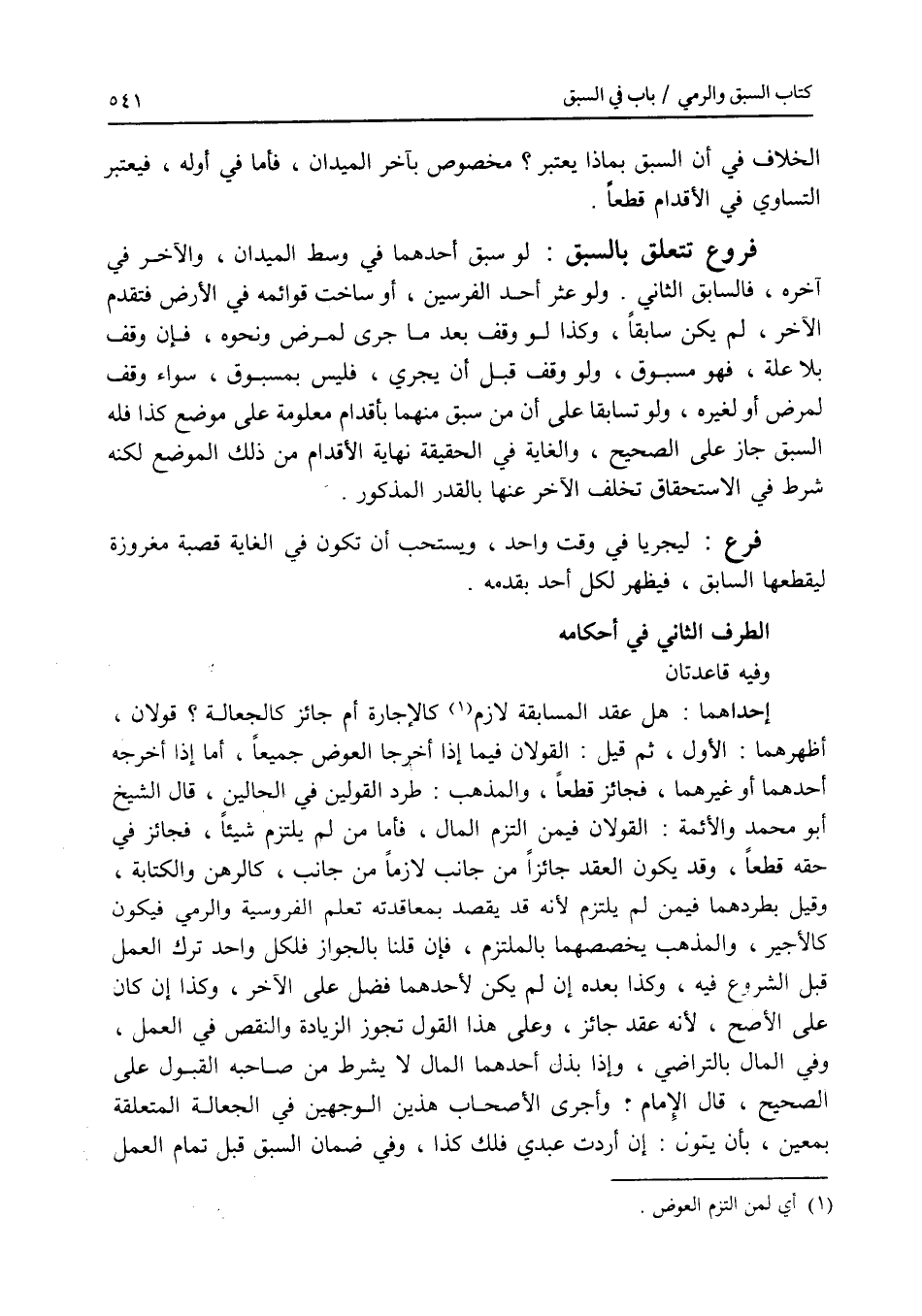 فروع تتعلق بالسبق لو سبق أحدهما في وسط الميدان، والآخر في آخره، فالسابق الثاني. ولو عثر أحد الفرسين، أو ساخت قوائمه في الارض فتقدم الآخر، لم يكن سابقا، وكذا لو وقف بعد ما جرى لمرض ونحوه، فإن وقف بلا علة، فهو مسبوق، ولو وقف قبل أن يجري، فليس بمسبوق، سواء وقف لمرض أو لغيره، ولو تسابقا على أن من سبق منهما بأقدام معلمة على موضع كذا فله السبق جاز على الصحيح، والغاية في الحقيقة نهاية الاقدام من ذلك الموضع لكنه شرط في الاستحقاق تخلف الآخر عنها بالقدر المذكور. فرع ليجريا في وقت واحد، ويستحب أن تكون في الغاية قصبة مغروزة ليقطعها السابق، فيظهر لكل أحد بقدمه. الطرف الثاني في أحكامه: وفيه قاعدتان: إحداهما: هل عقد المسابقة لازم كالاجارة أم جائز كالجعالة ؟ قولان، أظهرهما: الاول، ثم قيل: القولان فيما إذا أخرجا العوض جميعا، أما إذا أخرجه أحدهما أو غيرهما، فجائز قطعا، والمذهب: طرد القولين في الحالين، قال الشيخ أبو محمد والائمة: القولان فيمن التزم المال، فأما من لم يلتزم شيئا، فجائز في حقه قطعا، وقد يكون العقد جائزا من جانب لازما من جانب، كالرهن والكتابة، وقيل بطردهما فيمن لم يلتزم لانه قد يقصد بمعاقدته تعلم الفروسية والرمي فيكون كالاجير، والمذهب يخصصهما بالملتزم، فإن قلنا بالجواز فلكل واحد ترك العمل قبل الشروع فيه، وكذا بعده إن لم يكن لاحدهما فضل على الآخر، وكذا إن كان على الاصح، لانه عقد جائز، وعلى هذا القول تجوز الزيادة والنقص في العمل، وفي المال بالتراضي، وإذا بذل أحدهما المال لا يشرط من صاحبه القبول على الصحيح، قال الامام: وأجرى الاصحاب هذين الوجهين في الجعالة المتعلقة بمعين، بأن يقول: إن أردت عبدي فلك كذا، وفي ضمان السبق قبل تمام العمل