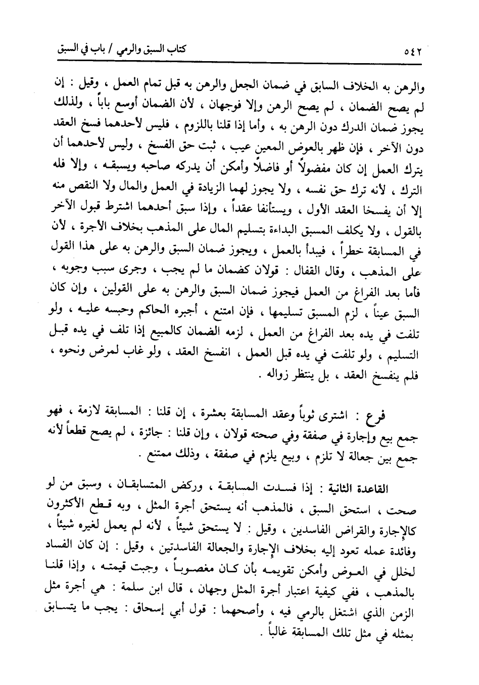 والرهن به الخلاف السابق في ضمان الجعل والرهن به قبل تمام العلم، وقيل: إن لم يصح الضمان، لم يصح الرهن وإلا فوجهان، لان الضمان أوسع بابا، ولذلك يجوز ضمان الدرك دون الرهن به، وأما إذا قلنا باللزوم، فليس لاحدهما فسخ العقد دون الآخر، فإن ظهر بالعوض المعين عيب، ثبت حق الفسخ، وليس لاحدهما أن يترك العمل إن كان مفضولا أو فاضلا وأمكن أن يدركه صاحبه ويسبقه، وإلا فله الترك، لانه ترك حق نفسه، ولا يجوز لهما الزيادة في العمل والمال ولا النقص منه إلا أن يفسخا العقد الاول، ويستأنفا عقدا، وإذا سبق أحدهما اشترط قبول الآخر بالقول، ولا يكلف المسبق البداءة بتسليم المال على المذهب بخلاف الاجرة، لان في المسابقة خطرا، فيبدأ بالعمل، ويجوز ضمان السبق والرهن به على هذا القول على المذهب، وقال القفال: قولان كضمان ما لم يجب، وجرى سبب وجوبه، فأما بعد الفراغ من العمل فيجوز ضمان السبق والرهن به على القولين، وإن كان السبق عينا، لزم المسبق تسلميها، فإن امتنع، أجبره الحاكم وحبسه عليه، ولو تلفت في يده بعد الفراغ من العمل، لزمه الضمان كالمبيع إذا تلف في يده قبل التسليم، ولو تلفت في يده قبل العمل، انفسخ العقد، ولو غاب لمرض ونحوه، فلم ينفسخ العقد، بل ينتظر زواله. فرع اشترى ثوبا وعقد المسابقة بعشرة، إن قلنا: المسابقة لازمة، فهو جمع بيع وإجارة في صفقة وفي صحته قولان، وإن قلنا: جائزة، لم يصح قطعا لانه جمع بين جعالة لا تلزم، وبيع يلزم في صفقة، وذلك ممتنع. القاعدة الثانية: إذا فسدت المسابقة، وركض المتسابقان، وسبق من لو صحت، استحق السبق، فالمذهب أنه يستحق أجرة المثل، وبه قطع الاكثرون كالاجارة والقراض الفاسدين، وقيل: لا يستحق شيئا، لانه لم يعمل لغيره شيئا، وفائدة عمله تعود إليه بخلاف الاجارة والجعالة الفاسدتين، وقيل: إن كان الفساد لخلل في العوض وأمكن تقويمه بأن كان مغصوبا، وجبت قيمته، وإذا قلنا بالمذهب، ففي كيفية اعتبار أجرة المثل وجهان، قال ابن سلمة: هي أجرة مثل الزمن الذي اشتغل بالرمي فيه، وأصحهما: قول أبي إسحق: يجب ما يتسابق بمثله في مثل تلك المسابقة غالبا.