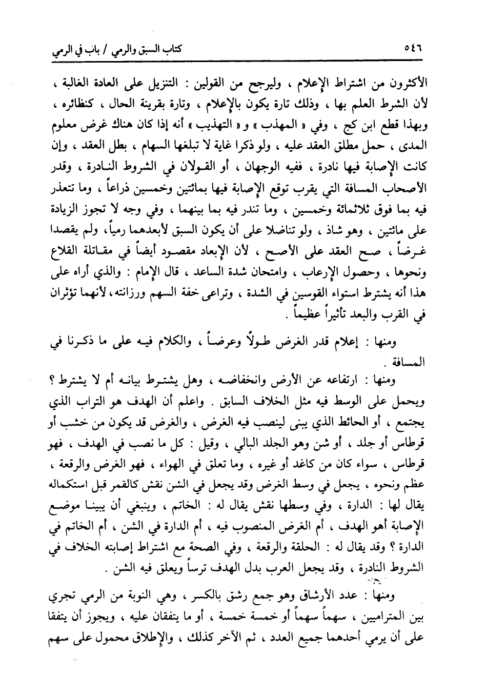 الاكثرون من اشتراط الاعلام، وليرجح من القولين: التنزيل على العادة الغالبة، لان الشرط العلم بها، وذلك تارة يكون بالاعلام، وتارة بقرينة الحال، كنظائره، وبهذا قطع ابن كج، وفي المهذب والتهذيب أنه إذا كان هناك غرض معلوم المدى، حمل مطلق العقد عليه، ولو ذكرا غاية لا تبلغها السهام، بطل العقد، وإن كانت الاصابة فيها نادرة، ففيه الوجهان، أو القولان في الشروط النادرة، وقدر الاصحاب المسافة التي يقرب توقع الاصابة فيها بمائتين وخمسين ذراعا، وما تتعذر فيه بما فوق ثلاثمائة وخمسين، وما تندر فيه بما بينهما، وفي وجه لا تجوز الزيادة على مائتين، وهو شاذ، ولو تناضلا على أن يكون السبق لابعدهما رميا، ولم يقصدا غرضا، صح العقد على الاصح، لان الابعاد مقصود أيضا في مقاتلة القلاع ونحوها، وحصول الارعاب، وامتحان شدة الساعد، قال الامام: والذي أراه على هذا أنه يشترط استواء القوسين في الشدة، وتراعى خفة السهم ورزانته، لانهما تؤثران في القرب والبعد تأثيرا عظيما. ومنها: إعلام قدر الغرض طولا وعرضا، والكلام فيه على ما ذكرنا في المسافة. ومنها: ارتفاعه عن الارض وانخفاضه، وهل يشترط بيانه أم لا يشترط ؟ ويحمل على الوسط فيه مثل الخلاف السابق. واعلم أن الهدف هو التراب الذي يجتمع، أو الحائط الذي يبنى لينصب فيه الغرض، والغرض قد يكون من خشب أو قرطاس أو جلد، أو شن وهو الجلد البالي، وقيل: كل ما نصب في الهدف، فهو قرطاس، سواء كان من كاغد أو غيره، وما تعلق في الهواء، فهو الغرض والرقعة، عظم ونحوه، يجعل في وسط الغرض وقد يجعل في الشن نقش كالقمر قبل استكماله يقال لها: الدارة، وفي وسطها نقش يقال له: الخاتم، وينبغي أن يبينا موضع الاصابة أهو الهدف، أم الغرض المنصوب فيه، أم الدارة في الشن، أم الخاتم في الدارة ؟ وقد يقال له: الحلقة والرقعة، وفي الصحة مع اشتراط إصابته الخلاف في الشروط النادرة، وقد يجعل العرب بدل الهدف ترسا ويعلق فيه الشن. ومنها: عدد الارشاق وهو جمع رشق بالكسر، وهي النوبة من الرمي تجري بين المتراميين، سهما سهما أو خمسة خمسة، أو ما يتفقان عليه، ويجوز أن يتفقا على أن يرمي أحدهما جميع العدد، ثم الآخر كذلك، والاطلاق محمول على سهم سهم،