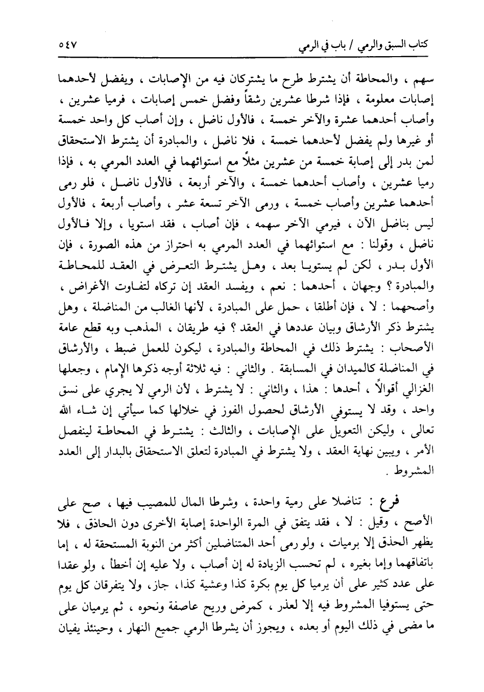 والمحاطة أن يشترط طرح ما يشتركان فيه من الاصابات، ويفضل لاحدهما إصابات معلومة، فإذا شرطا عشرين رشقا وفضل خمس إصابات، فرميا عشرين، وأصاب أحدهما عشرة والآخر خمسة، فالاول ناضل، وإن أصاب كل واحد خمسة أو غيرها ولم يفضل لاحدهما خمسة، فلا ناضل، والمبادرة أن يشترط الاستحقاق لمن بدر إلى إصابة خمسة من عشرين مثلا مع استوائهما في العدد المرمي به، فإذا رميا عشرين وأصاب أحدهما خمسة، والآخر أربعة فالاول ناضل، فلو رمى احدهما عشرين وأصاب خمسة ورمى الآخر تسعة عشر، وأصاب أربعة، فالاول ليس بناضل الآن، فيرمي الآخر سهمه، فإن أصاب، فقد استويا، وإلا فالاول ناضل، وقولنا: مع استوائهما في العدد المرمي به احتراز من هذه الصورة، فإن الاول بدر، لكن لم يستويا بعد، وهل يشترط التعرض في العقد للمحاطة والمبادرة ؟ وجهان، أحدهما: نعم، ويفسد العقد إن تركاه لتفاوت الاغراض، وأصحهما: لا، فإن أطلقا، حمل على المبادرة، لانها الغالب من المناضلة، وهل يشترط ذكر الارشاق وبيان عددها في العقد ؟ فيه طريقان، المذهب وبه قطع عامة الاصحاب: يشترط ذلك في المحاطة والمبادرة، ليكون للعمل ضبط، والارشاق في المناضلة كالميدان في المسابقة. والثاني: فيه ثلاثة أوجه ذكرها الامام، وجعلها الغزالي أقوالا، أحدها: هذا، والثاني: لا يشترط، لان الرامي لا يجري على نسق واحد، وقد لا يستوفي الارشاق لحصول الفوز في خلالها كما سيأتي إن شاء الله تعالى، وليكن التعويل على الاصابات، والثالث: يشترط في المحاطة لينفصل الامر، ويبين نهاية العقد، ولا يشترط في المبادرة لتعلق الاستحقاق بالبدار إلى العدد المشروط. فرع تناضلا على رمية واحدة، وشرطا المال للمصيب فيها، صح على الاصح، وقيل: لا، فقد يتفق في المرة الواحدة إصابة الاخرى دون الحاذق، فلا يظهر الحذق إلا برميات، ولو رمى أحد المتناضلين أكثر من النوبة المستحقة له، إما باتفاقهما وإما بغيره، لم تحسب الزيادة له إن أصاب، ولا عليه إن أخطأ، ولو عقدا على عدد كثير على أن يرميا كل يوم بكرة كذا وعشية كذا، جاز، ولا يتفرقان كل يوم حتى يستوفيا المشروط فيه إلا لعذر، كمرض وريح عاصفة ونحوه، ثم يرميان على ما مضى في ذلك اليوم أو بعده، ويجوز أن يشرطا الرمي جميع النهار، وحينئذ يفيان