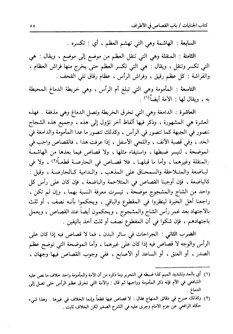السابعة: الهاشمة وهي التي تهشم العظم، أي: تكسره، الثامنة: المنقلة وهي التي تنقل العظم من موضع إلى موضع، ويقال: هي التي تكسر وتنقل، ويقال: هي التي تكسر العظم حتى يخرج منها فراش العظام، والفراشة: كل عظم رقيق، وفراش الرأس: عظام رقاق تلي القحف، التاسعة: المأمومة وهي التي تبلغ أم الرأس، وهي خريطة الدماغ المحيطة به، ويقال لها: الآمة أيضا، العاشرة: الدامغة وهي التي تخرق الخريطة وتصل الدماغ وهي مذففة. فهذه العشرة هي المشهورة، وذكر فيها ألفاظ أخر تؤول إلى هذه، وجميع هذه الشجاج تتصور في الجبهة كما تتصور في الرأس، وكذلك تتصور ما عدا المأمومة والدامغة في الخد، وفي قصبة الانف، واللحي الاسفل، إذا عرفت هذا، فالقصاص واجب في الموضحة، لتيسر ضبطها، واستيفاء مثلها، ولا قصاص فيما بعدها من الهاشمة والمنقلة وغيرهما، وأما ما قبلها، فلا قصاص في الحارصة قطعا، ولا في الباضعة والمتلاحقة والسمحاق على المذهب، والدامية كالحارصة، وقيل: كالباضعة، فإن أوجبنا القصاص في المتلاحمة والباضعة، فإن كان على رأس كل واحد من الشاج والمشجوج موضحة، تيسرت معرفة النسبة بهما، وإن لم تكن، راجعنا أهل الخبرة لينظروا في المقطوع والباقي، ويحكموا بأنه نصف، أو ثلث بالاجتهاد بعد غمر رأس الشاج والمشجوج، ويحكمون أيضا عند القصاص، ويعمل باجتهادهم، فإن شكوا في أن المقطوع نصف أو ثلث أخذ باليقين. الضرب الثاني: الجراحات في سائر البدن، فما لا قصاص فيه إذا كان على الرأس والوجه لا قصاص فيه إذا كان على غيرهما، وأما الموضحة التي توضح عظم الصدر، أو العنق، أو الساعد أو الاصابع، ففي وجوب القصاص فيها وجهان،
