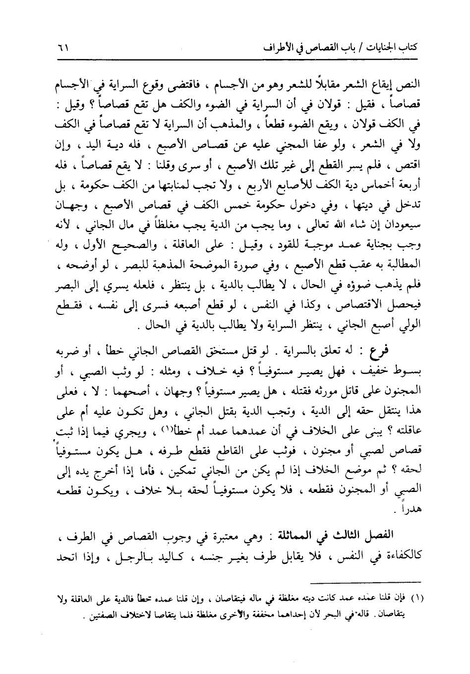 النص إيقاع الشعر مقابلا للشعر وهو من الاجسام، فاقتضى وقوع السراية في الاجسام قصاصا، فقيل: قولان في أن السراية في الضوء والكف هل تقع قصاصا ؟ وقيل: في الكف قولان، ويقع الضوء قطعا، والمذهب أن السراية لا تقع قصاصا في الكف ولا في الشعر، ولو عفا المجني عليه عن قصاص الاصبع، فله دية اليد، وإن اقتص، فلم يسر القطع إلى غير تلك الاصبع، أو سرى وقلنا: لا يقع قصاصا، فله أربعة أخماس دية الكف للاصابع الاربع، ولا تجب لمنابتها من الكف حكومة، بل تدخل في ديتها، وفي دخول حكومة خمس الكف في قصاص الاصبع، وجهان سيعودان إن شاء الله تعالى، وما يجب من الدية يجب مغلظا في مال الجاني، لانه وجب بجناية عمد موجبة للقود، وقيل: على العاقلة، والصحيح الاول، وله المطالبة به عقب قطع الاصبع، وفي صورة الموضحة المذهبة للبصر، لو أوضحه، فلم يذهب ضوؤه في الحال، لا يطالب بالدية، بل ينتظر، فلعله يسري إلى البصر فيحصل الاقتصاص، وكذا في النفس، لو قطع أصبعه فسرى إلى نفسه، فقطع الولي أصبع الجاني، ينتظر السراية ولا يطالب بالدية في الحال. فرع له تعلق بالسراية. لو قتل مستحق القصاص الجاني خطأ، أو ضربه بسوط خفيف، فهل يصير مستوفيا ؟ فيه خلاف، ومثله: لو وثب الصبي، أو المجنون على قاتل مورثه فقتله، هل يصير مستوفيا ؟ وجهان، أصحهما: لا، فعلى هذا ينتقل حقه إلى الدية، وتجب الدية بقتل الجاني، وهل تكون عليه أم على عاقلته ؟ يبنى على الخلاف في أن عمدهما عمد أم خطأ، ويجري فيما إذا ثبت قصاص لصبي أو مجنون، فوثب على القاطع فقطع طرفه، هل يكون مستوفيا لحقه ؟ ثم موضع الخلاف إذا لم يكن من الجاني تمكين، فأما إذا أخرج يده إلى الصبي أو المجنون فقطعه، فلا يكون مستوفيا لحقه بلا خلاف، ويكون قطعه هدرا.