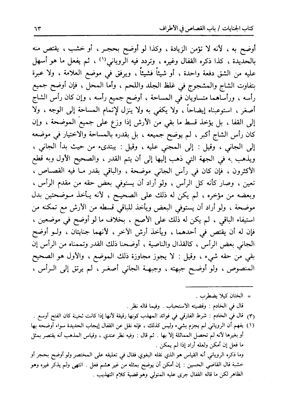 أو صح به، لانه لا تؤمن الزيادة، وكذا لو أوضح بحجر، أو خشب، يقتص منه بالحديدة، كذا ذكره القفال وغيره، وتردد فيه الروياني، ثم يفعل ما هو أسهل عليه من الشق دفعه واحدة، أو شيئا فشيئا، ويرفق في موضع العلامة، ولا عبرة بتفاوت الشاج والمشجوج في غلظ الجلد واللحم، وأما المحل، فإن أوضح جميع رأسه، ورأساهما متساويان في المساحة، أوضح جميع رأسه، وإن كان رأس الشاج أصغر، استوعبناه إيضاحا، ولا يكفي به ولا ينزل لاتمام المساحة إلى الوجه، ولا إلى القفا، بل يؤخذ قسط ما بقي من الارش إذا وزع على جميع الموضحة، وإن كان رأس الشاج أكبر، لم يوضح جميعه، بل بقدره بالمساحة والاختيار في موضعه إلى الجاني، وقيل: إلى المجني عليه، وقيل: يبتدئ من حيث بدأ الجاني، ويذهب به في الجهة التي ذهب إليها إلى أن يتم القدر، والصحيح الاول وبه قطع الاكثرون، فإن كان في رأس الجاني موضحة، والباقي بقدر ما فيه القصاص، تعين، وصار كأنه كل الرأس، ولو أراد أن يستوفي بعض حقه من مقدم الرأس، وبعضه من مؤخره، لم يكن له ذلك على الصحيح، لانه يأخذ موضحتين بدل موضحة، ولو أراد أن يستوفي البعض ويأخذ للباقي قسطه من الارش مع تمكنه من استيفاء الباقي، لم يكن له ذلك على الاصح، بخلاف ما لو أوضح في موضعين، فإن له أن يقتص في أحدهما، ويأخذ أرش الآخر، لانهما جنايتان، ولو أوضح الجاني بعض الرأس، كالقذال والناصية، أوضحنا ذلك القدر وتممناه من الرأس إن بقي من حقه شئ، وقيل: لا يجوز مجاوزة ذلك الموضع، والاول هو الصحيح المنصوص، ولو أوضح جبهته، وجبهة الجاني أصغر، لم يرتق إلى الرأس،