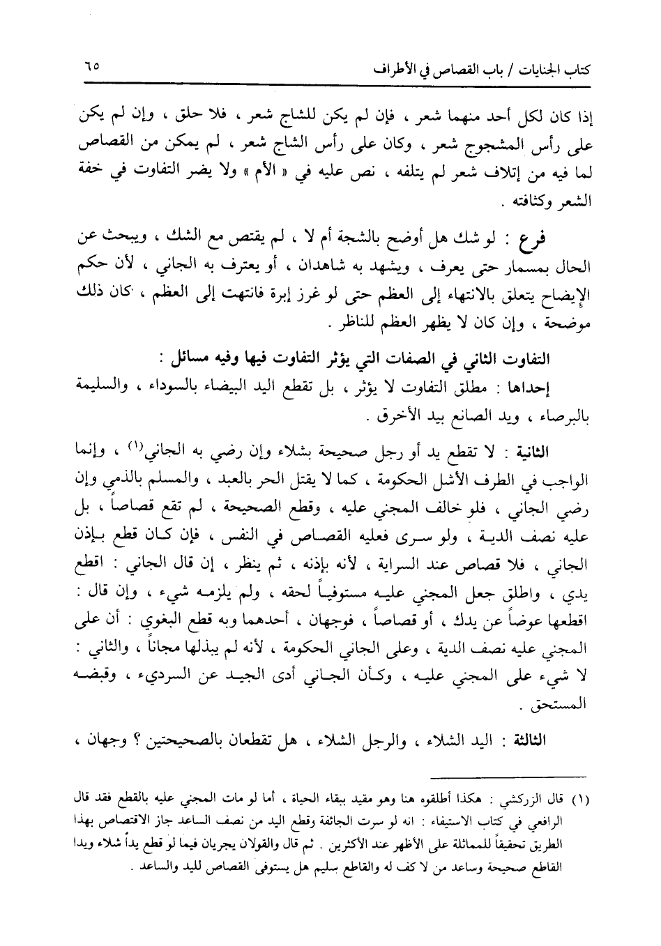 إذا كان لكل منهما شعر، فإن لم يكن للشاج شعر، فلا حلق، وإن لم يكن على رأس المشجوج شعر، وكان على رأس الشاج شعر، لم يمكن من القصاص لما فيه من إتلاف شعر لم يتلفه، نص عليه في الام ولا يضر التفاوت في خفة الشعر وكثافته. فرع لو شك هل أوضح بالشجة أم لا، لم يقتص مع الشك، ويبحث عن الحال بمسمار حتى يعرف، ويشهد به شاهدان، أو يعترف به الجاني، لان حكم الايضاح يتعلق بالانتهاء إلى العظم حتى لو غرز إبرة فانتهت إلى العظم، كان ذلك موضحة، وإن كان لا يظهر العظم للناظر. التفاوت الثاني في الصفات التي يؤثر التفاوت فيها وفيه مسائل: إحداها: مطلق التفاوت لا يؤثر، بل تقطع اليد البيضاء بالسوداء، والسليمة بالبرصاء، ويد الصانع بيد الاخرق. الثانية: لا تقطع يد أو رجل صحيحة بشلاء وإن رضي به الجاني، وإنما الواجب في الطرف الاشل الحكومة، كما لا يقتل الحر بالعبد، والمسلم بالذمي وإن رضي الجاني، فلو خالف المجني عليه، وقطع الصحيحة، لم تقع قصاصا، بل عليه نصف الدية، ولو سرى فعليه القصاص في النفس، فإن كان قطع بإذن الجاني، فلا قصاص عند السراية، لانه بإذنه، ثم ينظر، إن قال الجاني: اقطع يدي، وأطلق، جعل المجني عليه مستوفيا لحقه، ولم يلزمه شئ، وإن قال: اقطعها عوضا عن يدك، أو قصاصا، فوجهان، أحدهما وبه قطع البغوي: أن على المجني عليه نصف الدية، وعلى الجاني الحكومة، لانه لم يبذلها مجانا، والثاني: لا شئ على المجني عليه، وكأن الجاني أدى الجيد عن الردئ، وقبضه المستحق. الثالثة: اليد الشلاء، والرجل الشلاء، هل تقطعان بالصحيحتين ؟ وجهان،