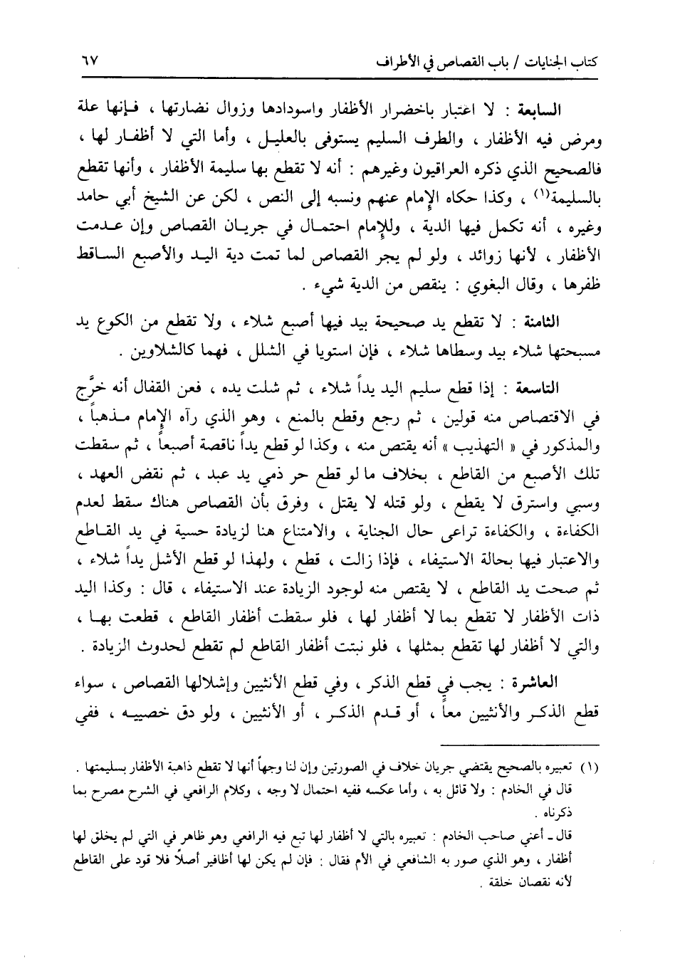 السابعة: لا اعتبار بإخضرار الاظفار واسودادها وزوال نضارتها، فإنها علة ومرض في الاظفار، والطرف السليم يستوفى بالعليل، وأما التي لا أظفار لها، فالصحيح الذي ذكره العراقيون وغيرهم: أنه لا تقطع بها سليمة الاظفار، وأنها تقطع بالسليمة، وكذا حكاه الامام عنهم ونسبه إلى النص، لكن عن الشيخ أبي حامد وغيره، أنه تكمل فيها الدية، وللامام احتمال في جريان القصاص وإن عدمت الاظفار، لانها زوائد، ولو لم يجر القصاص لما تمت دية اليد والاصبع الساقط ظفرها، وقال البغوي: ينقص من الدية شئ. الثامنة: لا تقطع يد صحيحة بيد فيها أصبع شلاء، ولا تقطع من الكوع يد مسبحتها شلاء بيد وسطاها شلاء، فإن استويا في الشلل، فهما كالشلاوين. التاسعة: إذا قطع سليم اليد يدا شلاء، ثم شلت يده، فعن القفال أنه خرج في الاقتصاص منه قولين، ثم رجع وقطع بالمنع، وهو الذي رآه الامام مذهبا، والمذكور في التهذيب أنه يقتص منه، وكذا لو قطع يدا ناقصة أصبعا، ثم سقطت تلك الاصبع من القاطع، بخلاف ما لو قطع حر ذمي يد عبد، ثم نقض العهد، وسبي واسترق لا يقطع، ولو قتله لا يقتل، وفرق بأن القصاص هناك سقط لعدم الكفاءة، والكفاءة تراعى حال الجناية، والامتناع هنا لزيادة حسية في يد القاطع والاعتبار فيها بحال الاستيفاء، فإذا زالت، قطع، ولهذا لو قطع الاشل يدا شلاء، ثم صحت يد القاطع، لا يقتص منه لوجود الزيادة عند الاستيفاء، قال: وكذا اليد ذات الاظفار لا تقطع بما لا أظفار لها، فلو سقطت أظفار القاطع، قطعت بها، والتي لا أظفار لها تقطع بمثلها، فلو نبتت أظفار القاطع لم تقطع لحدوث الزيادة. العاشرة: يجب في قطع الذكر، وفي قطع الانثيين وإشلالها القصاص، سواء قطع الذكر والانثيين معا، أو قدم الذكر، أو الانثيين، ولو دق خصييه، ففي