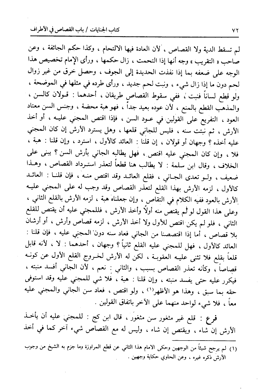 لم تسقط الدية ولا القصاص، لان العادة فيها الالتحام، وكذا حكم الجائفة، وعن صاحب التقريب وجه أنها إذا التحمت، زال حكمها، ورأى الامام تخصيص هذا الوجه على ضعفه بما إذا نفذت الحديدة إلى الجوف، وحصل خرق من غير زوال لحم دون ما إذا زال شئ، ونبت لحم جديد، ورأى طرده في مثلها في الموضحة، ولو قطع لسانا فنبت، ففي سقوط القصاص طريقان، أحدهما: قولان كالسن، والمذهب القطع بالمنع، لان عوده بعيد جدا، فهو هبة محضة، وجنس السن معتاد العود، التفريع على القولين في عود السن، فإذا اقتص المجني عليه، أو أخذ الارش، ثم نبتت سنه، فليس للجاني قلعها، وهل يسترد الارش إن كان المجني عليه أخذه ؟ وجهان أو قولان، إن قلنا: العائد كالاول، استرد، وإن قلنا: هبة، فلا، وإن كان المجني عليه اقتص، فهل يطالبه الجاني بأرش السن ؟ يبنى على الخلاف، وقال ابن سلمة: لا يطالب هنا قطعا لتعذر استرداد القصاص، وهذا ضعيف، ولو تعدى الجاني، فقلع العائد وقد اقتص منه، فإن قلنا: العائد كالاول، لزمه الارش بهذا القلع لتعذر القصاص وقد وجب له على المجني عليه الارش بالعود ففيه الكلام في التقاص، وإن جعلناه هبة، لزمه الارش بالقلع الثاني، وعلى هذا القول لو لم يقتص منه أولا وأخذ الارش، فللمجني عليه أن يقتص للقلع الثاني، فلو لم يكن اقتص للاول ولا أخذ الارش، لزمه قصاص وأرش، أو أرشان بلا قصاص، أما إذا اقتصصنا من الجاني فعاد سنه دون المجني عليه، فإن قلنا: العائد كالاول، فهل للمجني عليه القلع ثانيا ؟ وجهان، أحدهما: لا، لانه قابل قلعا بقلع فلا تثنى عليه العقوبة، لكن له الارش لخروج القلع الاول عن كونه قصاصا، وكأنه تعذر القصاص بسبب، والثاني: نعم، لان الجاني أفسد منبته، فيكرر عليه حتى يفسد منبته، وإن قلنا: هبة، فلا شئ للمجني عليه وقد استوفى حقه بما سبق، وهذا هو الاظهر، ولو اقتص، فعاد سن الجاني والمجني عليه معا، فلا شئ لواحد منهما على الآخر باتفاق القولين. فرع قلع غير مثغور سن مثغور، قال ابن كج: للمجني عليه أن يأخذ الارش إن شاء، ويقتص إن شاء، وليس له مع القصاص شئ آخر كما في أخذ