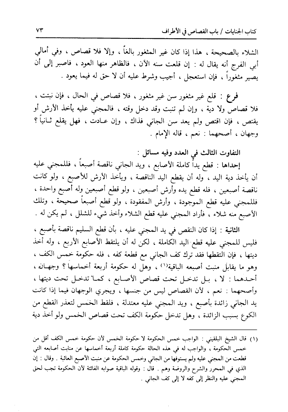 الشلاء بالصحيحة، هذا إذا كان غير المثغور بالغا، وإلا فلا قصاص، وفي أمالي أبي الفرج أنه يقال له: إن قلعت سنه الآن، فالظاهر منها العود، فاصبر إلى أن يصير مثغورا، فإن استعجل، أجيب وشرط عليه أن لا حق له فيما يعود. فرع قلع غير مثغور سن غير مثغور، فلا قصاص في الحال، فإن نبتت، فلا قصاص ولا دية، وإن لم تنبت وقد دخل وقته، فالمجني عليه يأخذ الارش أو يقتص، فإن اقتص ولم يعد سن الجاني فذاك، وإن عادت، فهل يقلع ثانيا ؟ وجهان، أصحهما: نعم، قاله الامام. التفاوت الثالث في العدد وفيه مسائل: إحداها: قطع يدا كاملة الاصابع، ويد الجاني ناقصة أصبعا، فللمجني عليه أن يأخذ دية اليد، وله أن يقطع اليد الناقصة، ويأخذ الارش للاصبع، ولو كانت ناقصة أصبعين، فله قطع يده وأرش أصبعين، ولو قطع أصبعين وله أصبع واحدة، فللمجني عليه قطع الموجودة، وأرش المفقودة، ولو قطع أصبعا صحيحة، وتلك الاصبع منه شلاء، فأراد المجني عليه قطع الشلاء وأخذ شئ للشلل، لم يكن له. الثانية: إذا كان النقص في يد المجني عليه، بأن قطع السليم ناقصة بأصبع، فليس للمجني عليه قطع اليد الكاملة، لكن له أن يلتقط الاصابع الاربع، وله أخذ ديتها، فإن التقطها فقد ترك كف الجاني مع قطعه كفه، فله حكومة خمس الكف، وهو ما يقابل منبت أصبعه الباقية، وهل له حكومة أربعة أخماسها ؟ وجهان، أحدهما: لا، بل تدخل تحت قصاص الاصابع، كما تدخل تحت ديتها، وأصحهما: نعم، لان القصاص ليس من جنسها، ويجري الوجهان فيما إذا كانت يد الجاني زائدة بأصبع، ويد المجني عليه معتدلة، فلقط الخمس لتعذر القطع من الكوع بسبب الزائدة، وهل تدخل حكومة الكف تحت قصاص الخمس ولو أخذ دية