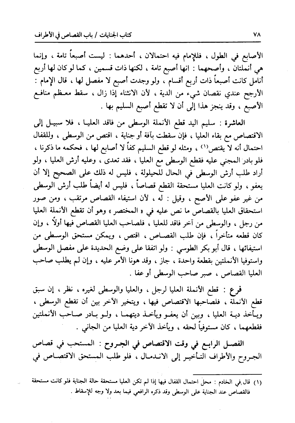 الاصابع في الطول، فللامام فيه احتمالان، أحدهما: ليست أصبعا تامة، وإنما هي أنملتان، وأصحهما: انها أصبع تامة، لكنها ذات قسمين، كما لو كان لها أربع أنامل كانت أصبعا ذات أربع أقسام، ولو وجدت أصبع لا مفصل لها، قال الامام: الارجح عندي نقصان شئ من الدية، لان الانثناء إذا زال، سقط معظم منافع الاصبع، وقد ينجر هذا إلى أن لا تقطع أصبع السليم بها. العاشرة: سليم اليد قطع الانملة الوسطى من فاقد العليا، فلا سبيل إلى الاقتصاص مع بقاء العليا، فإن سقطت بآفة أو جناية، اقتص من الوسطى، وللقفال احتمال أنه لا يقتص، ومثله لو قطع السليم كفا لا أصابع لها، فحكمه ما ذكرنا، فلو بادر المجني عليه فقطع الوسطى مع العليا، فقد تعدى، وعليه أرش العليا، ولو أراد طلب أرش الوسطى في الحال للحيلولة، فليس له ذلك على الصحيح إلا أن يعفو، ولو كانت العليا مستحقة القطع قصاصا، فليس له أيضا طلب أرش الوسطى من غير عفو على الاصح، وقيل: له، لان استيفاء القصاص مرتقب، ومن صور استحقاق العليا بالقصاص ما نص عليه في المختصر وهو أن تقطع الانملة العليا من رجل، والوسطى من آخر فاقد للعليا، فلصاحب العليا القصاص فيها أولا، وإن كان قطعه متأخرا، فإن طلب القصاص، اقتص، ويمكن مستحق الوسطى من استيفائها، قال أبو بكر الطوسي: ولو اتفقا على وضع الحديدة على مفصل الوسطى واستوفيا الانملتين بقطعة واحدة، جاز، وقد هونا الامر عليه، وإن لم يطلب صاحب العليا القصاص، صبر صاحب الوسطى أو عفا. فرع قطع الانملة العليا لرجل، والعليا والوسطى لغيره، نظر، إن سبق قطع الانملة، فلصاحبها الاقتصاص فيها، ويتخير الآخر بين أن تقطع الوسطى، ويأخذ دية العليا، وبين أن يعفو ويأخذ ديتهما، ولو بادر صاحب الانملتين فقطعهما، كان مستوفيا لحقه، ويأخذ الآخر دية العليا من الجاني. الفصل الرابع في وقت الاقتصاص في الجروح المستحب في قصاص الجروح والاطراف التأخير إلى الاندمال، فلو طلب المستحق الاقتصاص في