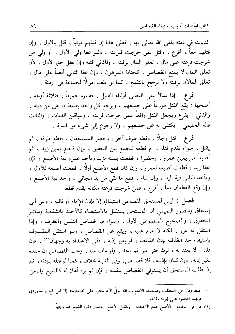 الديات في ذمته يلقى الله تعالى بها، فعلى هذا إن قتلهم مرتبا، قتل بالاول، وإن قتلهم معا، أقرع، وقتل بمن خرجت قرعته، ولو عفا ولي الاول، أو ولي من خرجت قرعته على مال، تعلق المال برقبته، وللثاني قتله وإن بطل حق الاول، لان تعلق المال لا يمنع القصاص، كجناية المرهون، وإن عفا الثاني أيضا على مال، تعلق المالان برقبته ولا يرجح بالتقدم، كما لو أتلف أموالا لجماعة في أزمنة. فرع إذا تمالا على الجاني أولياء القتيل، فقتلوه جميعا، فثلاثة أوجه، أصحها: يقع القتل موزعا على جميعهم، ويرجع كل واحد بقسط ما بقي من ديته، والثاني: يقرع ويجعل القتل واقعا عمن خرجت قرعته، وللباقين الديات، والثالث قاله الحليمي: يكتفى به عن جميعهم، ولا رجوع إلى شئ من الدية. فرع قتل رجلا، وقطع طرف آخر، وحضر المستحقان، يقطع طرفه، ثم يقتل، سواء تقدم قتله، أم قطعه ليجمع بين الحقين، وإن قطع يمين زيد، ثم أصبعا من يمين عمرو، وحضرا، قطعت يمينه لزيد ويأخذ عمرو دية الاصبع، فإن عفا زيد، قطعت أصبعه لعمرو، وإن كان قطع الاصبع أولا، قطعت أصبعه للاول، ويأخذ الثاني دية اليد، وإن شاء، قطع ما بقي من يد الجاني، وأخذ دية الاصبع، وإن وقع القطعان معا، أقرع، فمن خرجت قرعته مكانه يقدم قطعه. فصل ليس لمستحق القصاص استيفاؤه إلا بإذن الامام أو نائبه، وعن أبي إسحاق ومنصور التميمي أن المستحق يستقل بالاستيفاء كالاخذ بالشفعة وسائر الحقوق، والصحيح المنصوص الاول، وسواء فيه قصاص النفس والطرف، وإذا استقل به عزر، لكنه لا غرم عليه، ويقع عن القصاص، ولو استقل المقذوف باستيفاء حد القذف بإذن القاذف، أو بغير إذنه، ففي الاعتداد به وجهان، فإن قلنا: لا يعتد به، ترك حتى يبرأ ثم يحد، ولو مات منه، وجب القصاص إن جلده بغير إذنه، وإن كان بإذنه، فلا قصاص، وفي الدية خلاف، كما لو قتله بإذنه، ثم إذا طلب المستحق أن يستوفي القصاص بنفسه، فإن لم يره أهلا له كالشيخ والزمن