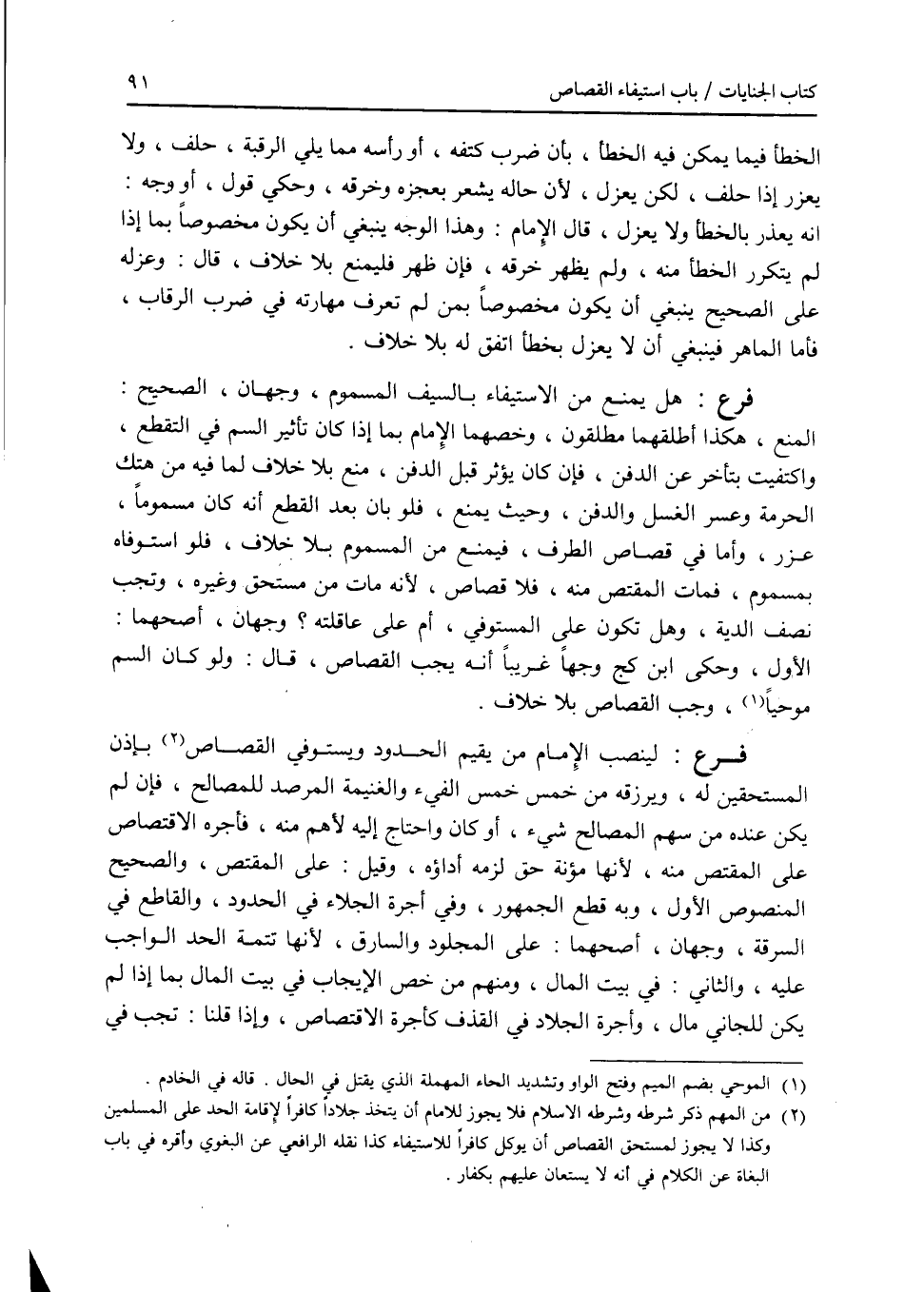 الخطأ فيما يمكن فيه الخطأ، بأن ضرب كتفه، أو رأسه مما يلي الرقبة، حلف، ولا يعزر إذا حلف، لكن يعزل، لان حاله يشعر بعجزه وخرقه، وحكي قول، أو وجه: انه يعذر بالخطأ ولا يعزل، قال الامام: وهذا الوجه ينبغي أن يكون مخصوصا بما إذا لم يتكرر الخطأ منه، ولم يظهر خرقه، فإن ظهر فليمنع بلا خلاف، قال: وعزله على الصحيح ينبغي أن يكون مخصوصا بمن لم تعرف مهارته في ضرب الرقاب، فأما الماهر فينبغي أن لا يعزل بخطأ اتفق له بلا خلاف. فرع هل يمنع من الاستيفاء بالسيف المسموم، وجهان، الصحيح: المنع، هكذا أطلقهما مطلقون، وخصهما الامام بما إذا كان تأثير السم في التقطع، واكتفيت بتأخر عن الدفن، فإن كان يؤثر قبل الدفن، منع بلا خلاف لما فيه من هتك الحرمة وعسر الغسل والدفن، وحيث يمنع، فلو بان بعد القطع أنه كان مسموما، عزر، وأما في قصاص الطرف، فيمنع من المسموم بلا خلاف، فلو استوفاه بمسموم، فمات المقتص منه، فلا قصاص، لانه مات من مستحق وغيره، وتجب نصف الدية، وهل تكون على المستوفي، أم على عاقلته ؟ وجهان، أصحهما: الاول، وحكى ابن كج وجها غريبا أنه يجب القصاص، قال: ولو كان السم موحيا، وجب القصاص بلا خلاف. فرع لينصب الامام من يقيم الحدود ويستوفي القصاص بإذن المستحقين له، ويرزقه من خمس خمس الفئ والغنيمة المرصد للمصالح، فإن لم يكن عنده من سهم المصالح شئ، أو كان واحتاج إليه لاهم منه، فأجرة الاقتصاص على المقتص منه، لانها مؤنة حق لزمه أداؤه، وقيل: على المقتص، والصحيح المنصوص الاول، وبه قطع الجمهور، وفي أجرة الجلاء في الحدود، والقاطع في السرقة، وجهان، أصحهما: على المجلود والسارق، لانها تتمة الحد الواجب عليه، والثاني: في بيت المال، ومنهم من خص الايجاب في بيت المال بما إذا لم يكن للجاني مال، وأجرة الجلاد في القذف كأجرة الاقتصاص، وإذا قلنا: تجب في