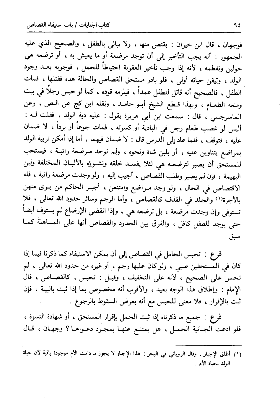 فوجهان، قال ابن خيران: يقتص منها، ولا يبالى بالطفل، والصحيح الذي عليه الجمهور: أنه يجب التأخير إلى أن توجد مرضعة أو ما يعيش به، أو ترضعه هي حولين وتفطمه، لانه إذا وجب تأخير العقوبة احتياطا للحمل، فوجوبه بعد وجود الولد، وتيقن حياته أولى، فلو بادر مستحق القصاص والحالة هذه فقتلها، فمات الطفل، فالصحيح أنه قاتل للطفل عمدا، فيلزمه قوده، كما لو حبس رجلا في بيت ومنعه الطعام، وبهذا قطع الشيخ أبو حامد، ونقله ابن كج عن النص، وعن الماسرجسي قال: سمعت ابن أبي هريرة يقول: عليه دية الولد، فقلت له: أليس لو غصب طعام رجل في البادية أو كسوته، فمات جوعا أو بردا، لا ضمان عليه، فتوقف، فلما عاد إلى الدرس قال: لا ضمان فيهما، أما إذا أمكن تربية الولد بمراضع يتناوبن عليه، أو بلبن شاة ونحوه، ولم توجد مرضعة راتبة، فيستحب للمستحق أن يصبر لترضعه هي لئلا يفسد خلقه ونشوؤه بالالبان المختلفة ولبن البهيمة، فإن لم يصبر وطلب القصاص، أجيب إليه، ولو وجدت مرضعة راتبة، فله الاقتصاص في الحال، ولو وجد مراضع وامتنعن، أجبر الحاكم من يرى منهن بالاجرة. والجلد في القذف كالقصاص، وأما الرجم وسائر حدود الله تعالى، فلا تستوفى وإن وجدت مرضعة، بل ترضعه هي، وإذا انقضى الارضاع لم يستوف أيضا حتى يوجد للطفل كافل، والفرق بين الحدود والقصاص أنها على المساهلة كما سبق. فرع تحبس الحامل في القصاص إلى أن يمكن الاستيفاء كما ذكرنا فيما إذا كان في المستحقين صبي، ولو كان عليها رجم، أو غيره من حدود الله تعالى، لم تحبس على الصحيح، لانه على التخفيف، وقيل: تحبس، كالقصاص، قال الامام: وإطلاق هذا الوجه بعيد، والاقرب أنه مخصوص بما إذا ثبت بالبينة، فإن ثبت بالاقرار، فلا معنى للحبس مع أنه بعرض السقوط بالرجوع. فرع جميع ما ذكرناه إذا ثبت الحمل بإقرار المستحق، أو شهادة النسوة، فلو ادعت الجانية الحمل، هل يمتنع عنها بمجرد دعواها ؟ وجهان، قال