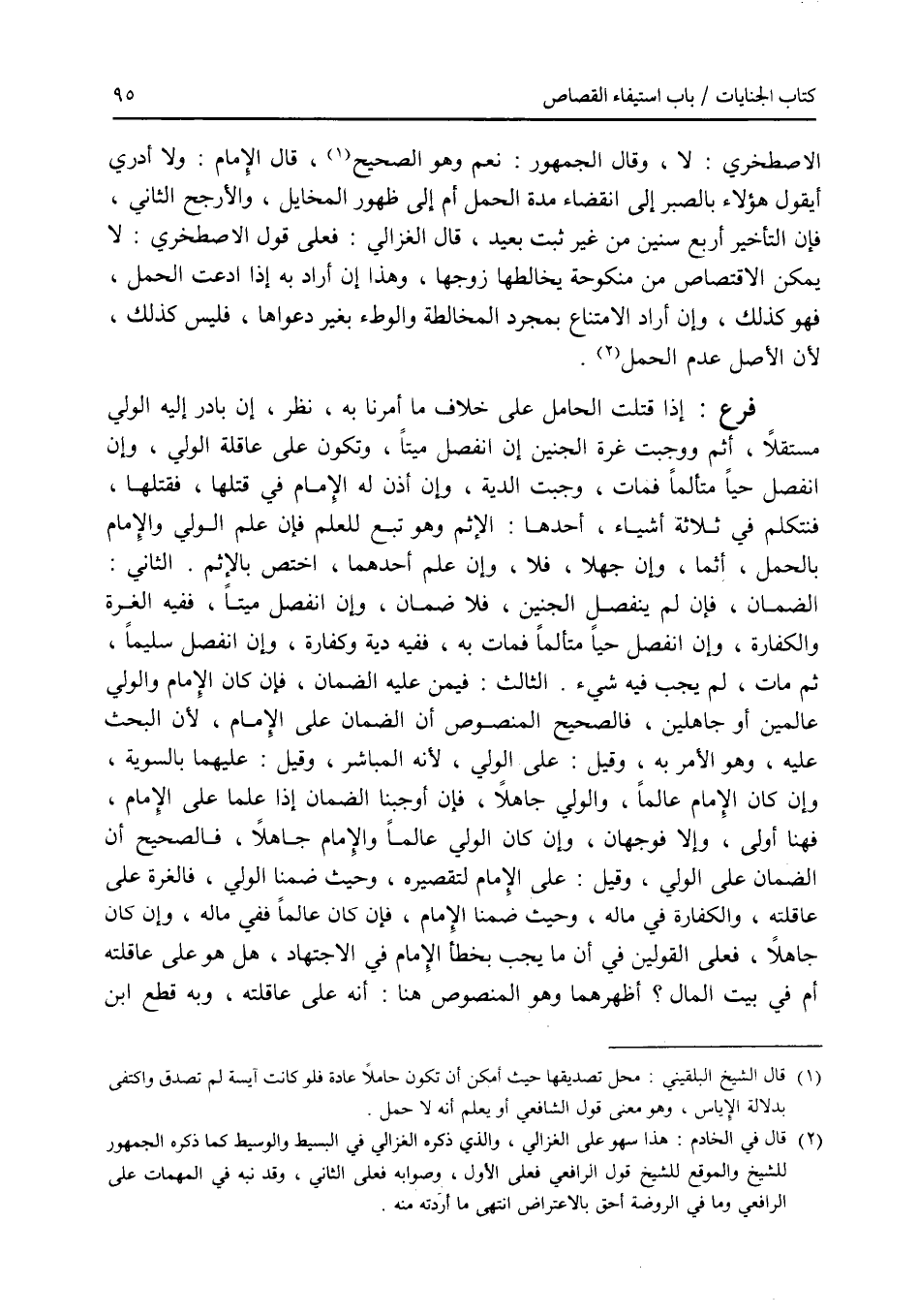 الاصطخري: لا، وقال الجمهور: نعم وهو الصحيح، قال الامام: ولا أدري أيقول هؤلاء بالصبر إلى انقضاء مدة الحمل أم إلى ظهور المخايل، والارجح الثاني، فإن التأخير أربع سنين من غير ثبت بعيد، قال الغزالي: فعلى قول الاصطخري: لا يمكن الاقتصاص من منكوحة يخالطها زوجها، وهذا إن أراد به إذا ادعت الحمل، فهو كذلك، وإن أراد الامتناع بمجرد المخالطة والوطئ بغير دعواها، فليس كذلك، لان الاصل عدم الحمل. فرع إذا قتلت الحامل على خلاف ما أمرنا به، نظر، إن بادر إليه الولي مستقلا، أثم ووجبت غرة الجنين إن انفصل ميتا، وتكون على عاقلة الولي، وإن انفصل حيا متألما فمات، وجبت الدية، وإن أذن له الامام في قتلها، فقتلها، فنتكلم في ثلاثة أشياء، أحدها: الاثم وهو تبع للعلم فإن علم الولي والامام بالحمل، أثما، وإن جهلا، فلا، وإن علم أحدهما، اختص بالاثم. الثاني: الضمان، فإن لم ينفصل الجنين، فلا ضمان، وإن انفصل ميتا، ففيه الغرة والكفارة، وإن انفصل حيا متألما فمات به، ففيه دية وكفارة، وإن انفصل سليما، ثم مات، لم يجب فيه شئ. الثالث: فيمن عليه الضمان، فإن كان الامام والولي عالمين أو جاهلين، فالصحيح المنصوص أن الضمان على الامام، لان البحث عليه، وهو الامر به، وقيل: على الولي، لانه المباشر، وقيل: عليهما بالسوية، وإن كان الامام عالما، والولي جاهلا، فإن أوجبنا الضمان إذا علما على الامام، فهنا أولى، وإلا فوجهان، وإن كان الولي عالما والامام جاهلا، فالصحيح أن الضمان على الولي، وقيل: على الامام لتقصيره، وحيث ضمنا الولي، فالغرة على عاقلته، والكفارة في ماله، وحيث ضمنا الامام، فإن كان عالما ففي ماله، وإن كان جاهلا، فعلى القولين في أن ما يجب بخطأ الامام في الاجتهاد، هل هو على عاقلته أم في بيت المال ؟ أظهرهما وهو المنصوص هنا: أنه على عاقلته، وبه قطع ابن