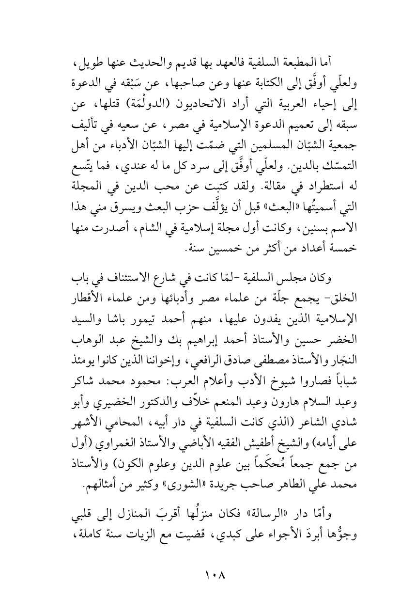 أما المطبعة السلفية فالعهد بها قديم والحديث عنها طويل، ولعلّي أوفَّق إلى الكتابة عنها وعن صاحبها، عن سَبْقه في الدعوة إلى إحياء العربية التي أراد الاتحاديون (الدولْمَة) قتلها، عن سبقه إلى تعميم الدعوة الإسلامية في مصر، عن سعيه في تأليف جمعية الشبّان المسلمين التي ضمّت إليها الشبّان الأدباء من أهل التمسّك بالدين. ولعلّي أوفَّق إلى سرد كل ما له عندي، فما يتّسع له استطراد في مقالة. ولقد كتبت عن محب الدين في المجلة التي أسميتُها «البعث» قبل أن يؤلَّف حزب البعث ويسرق مني هذا الاسم بسنين، وكانت أول مجلة إسلامية في الشام، أصدرت منها خمسة أعداد من أكثر من خمسين سنة.