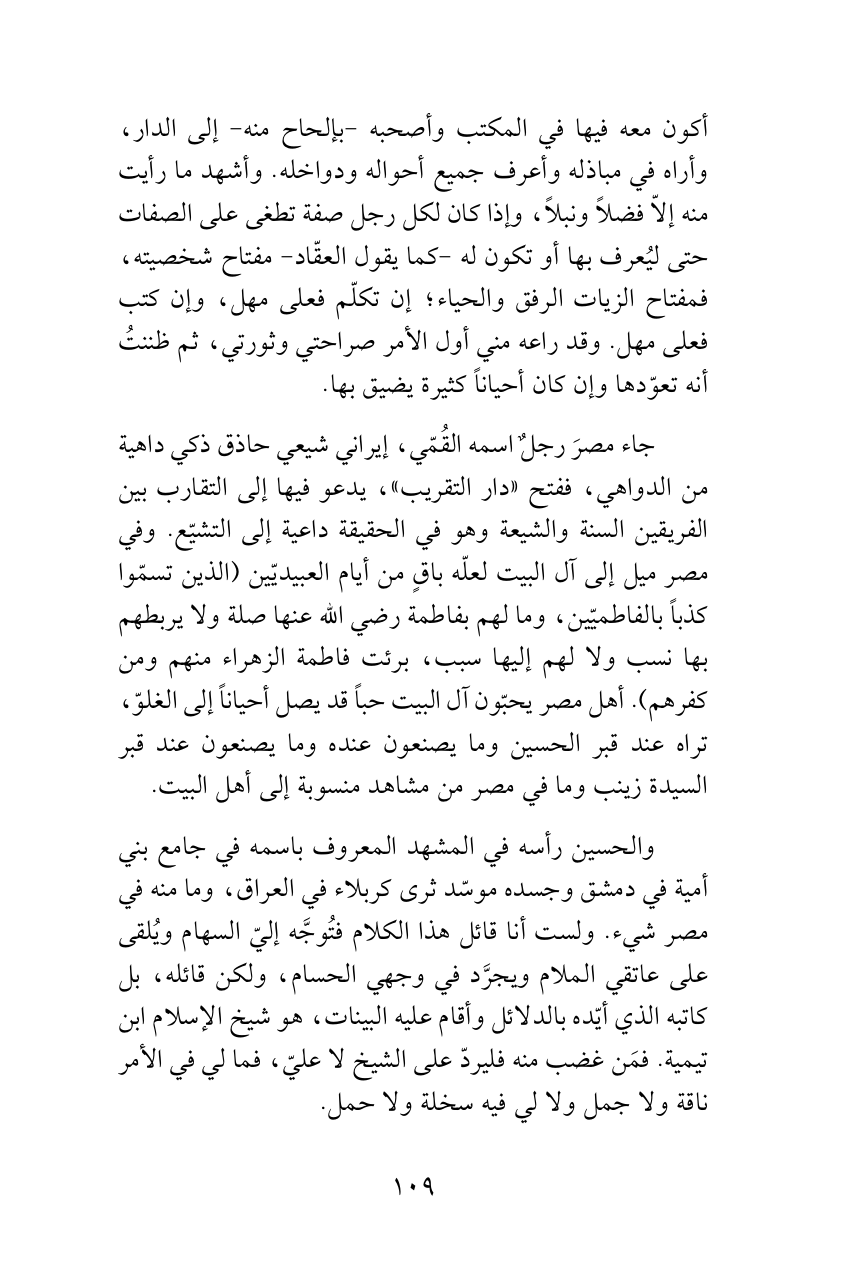 جاء مصرَ رجلٌ اسمه القُمّي، إيراني شيعي حاذق ذكي داهية من الدواهي، ففتح «دار التقريب»، يدعو فيها إلى التقارب بين الفريقين السنة والشيعة وهو في الحقيقة داعية إلى التشيّع. وفي مصر ميل إلى آل البيت لعلّه باقٍ من أيام العبيديّين (الذين تسمّوا كذباً بالفاطميّين، وما لهم بفاطمة رضي الله عنها صلة ولا يربطهم بها نسب ولا لهم إليها سبب، برئت فاطمة الزهراء منهم ومن كفرهم). أهل مصر يحبّون آل البيت حباً قد يصل أحياناً إلى الغلوّ، تراه عند قبر الحسين وما يصنعون عنده وما يصنعون عند قبر السيدة زينب وما في مصر من مشاهد منسوبة إلى أهل البيت.
