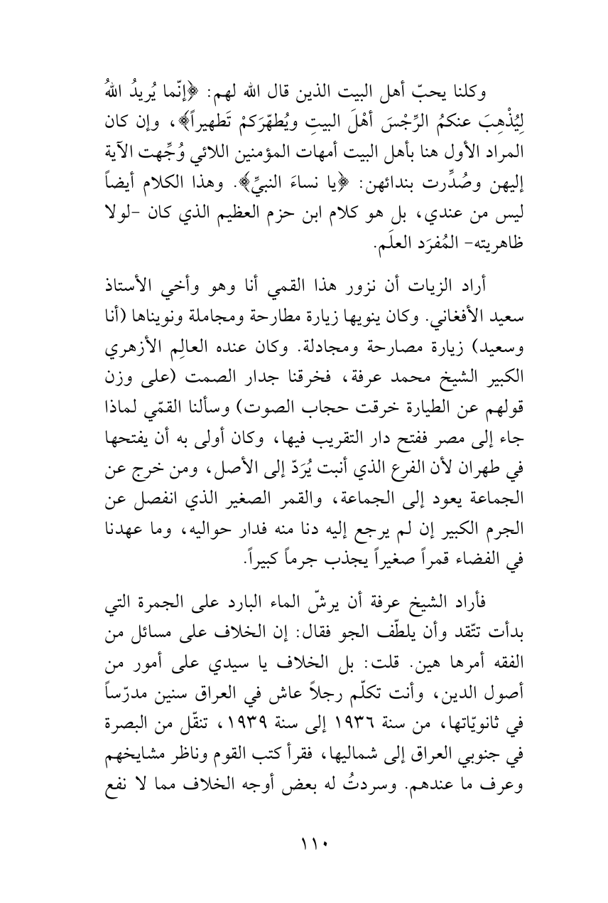 فأراد الشيخ عرفة أن يرشّ الماء البارد على الجمرة التي بدأت تتّقد وأن يلطّف الجو فقال: إن الخلاف على مسائل من الفقه أمرها هين. قلت: بل الخلاف يا سيدي على أمور من أصول الدين، وأنت تكلّم رجلاً عاش في العراق سنين مدرّساً في ثانويّاتها، من سنة 1936 إلى سنة 1939، تنقّل من البصرة في جنوبي العراق إلى شماليها، فقرأ كتب القوم وناظر مشايخهم وعرف ما عندهم. وسردتُ له بعض أوجه الخلاف مما لانفع